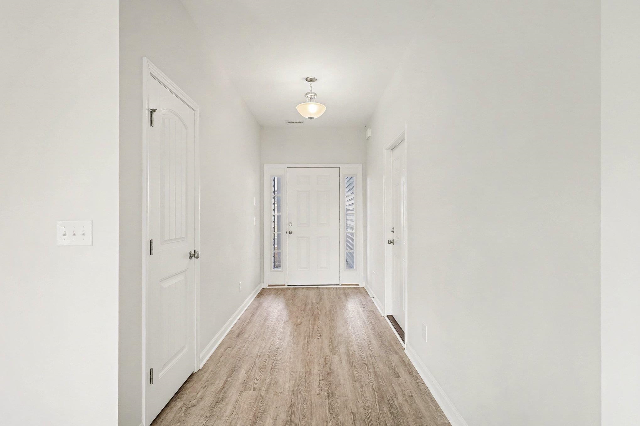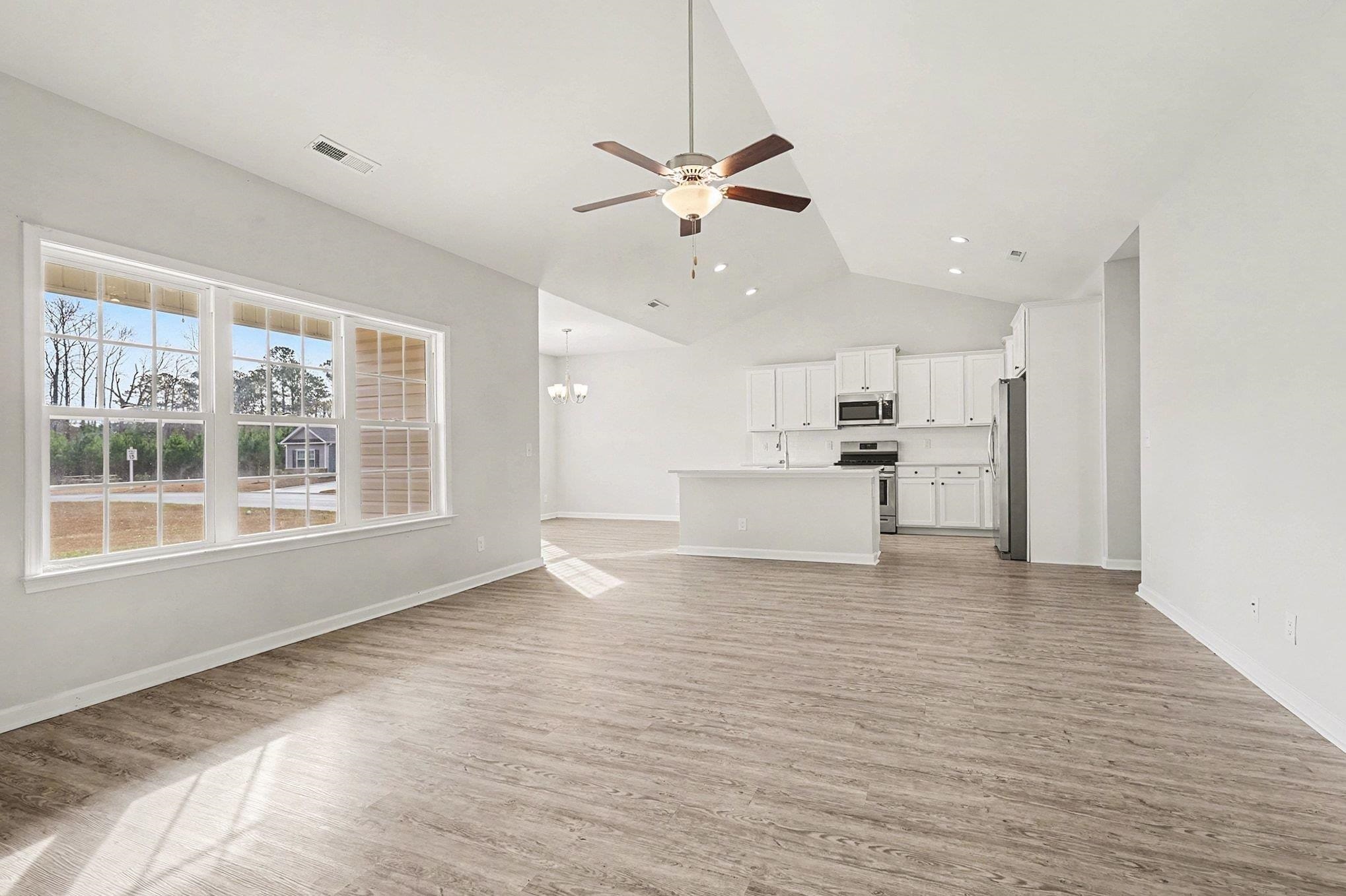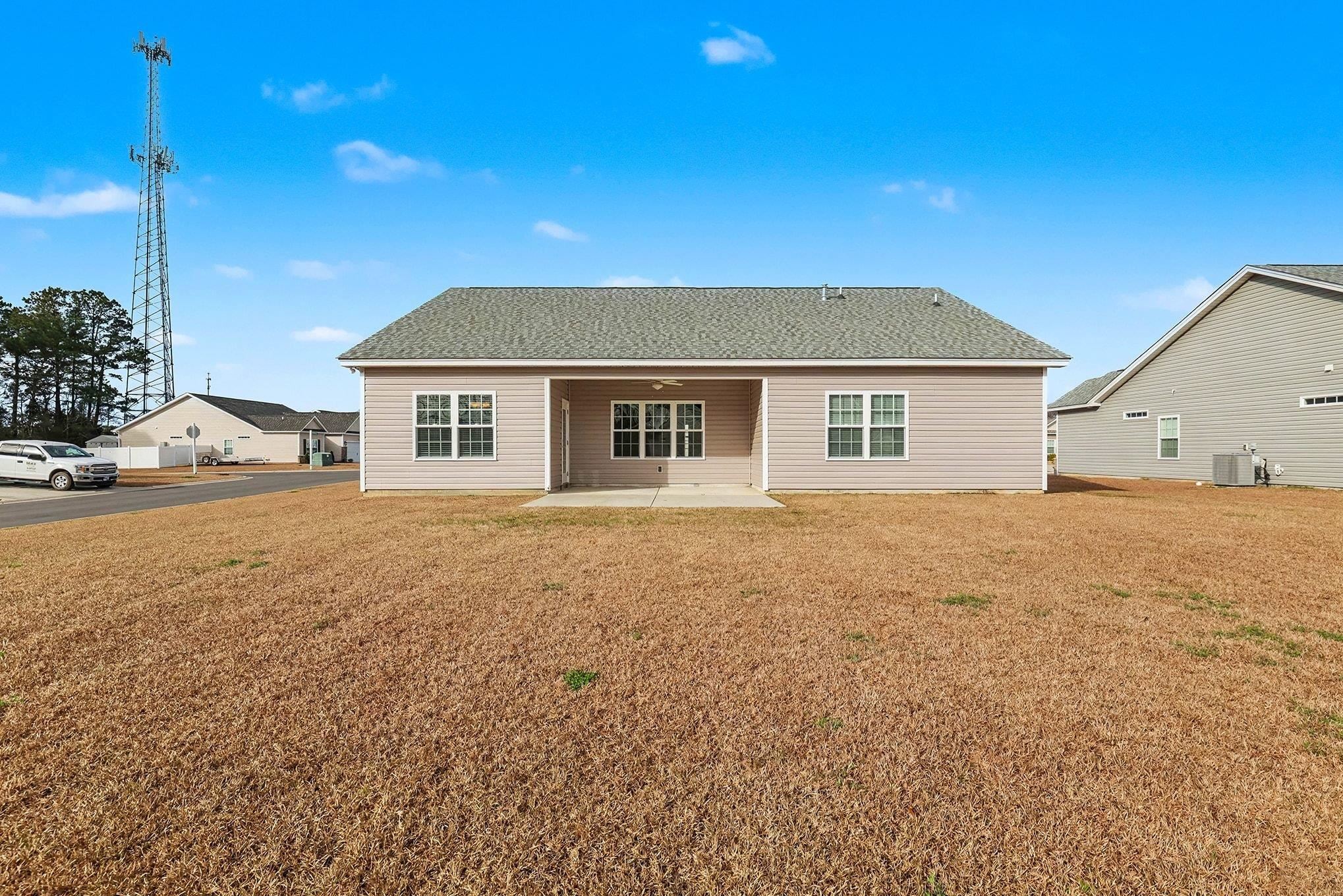 Move-in ready and loaded with upgrades, this immaculate single-level 3-bedroom, 2-bath home in The Village at Longs offers modern living just 10-15 minutes from the beach in a natural gas community. Built in 2022 with 1,701 heated square feet on a spacious .22-acre corner lot, the home features smooth ceilings throughout and upgraded laminate flooring that replaces all original carpet and vinyl for a clean, seamless look. A wide foyer opens to a bright, open great room and kitchen with an impressive 11'9" vaulted ceiling, filling the space with natural light. The kitchen includes quartz countertops, staggered white cabinetry with crown molding, a large island with breakfast bar and double undermount sink, stainless steel Frigidaire appliances, and a double-door pantry. The dining area leads to a covered back porch and extended concrete patio, ideal for outdoor enjoyment. The split bedroom layout offers privacy, with two guest bedrooms featuring added ceiling fans and a full guest bath, while the primary suite includes a tray ceiling, dual-sink vanity, oversized walk-in shower with seat, dual linen closets, and a large walk-in closet. Additional highlights include a full irrigation system, Rinnai tankless gas water heater, energy-efficient 14 SEER HVAC with gas furnace, Low-E windows and doors, termite bond, hardwired security system, and a spacious laundry room with washer and dryer. The 2-car garage includes pull-down attic storage, and the location provides quick access to grocery stores, the new post office, dining, shopping, the Intracoastal Waterway, and the beaches of North Myrtle Beach.
