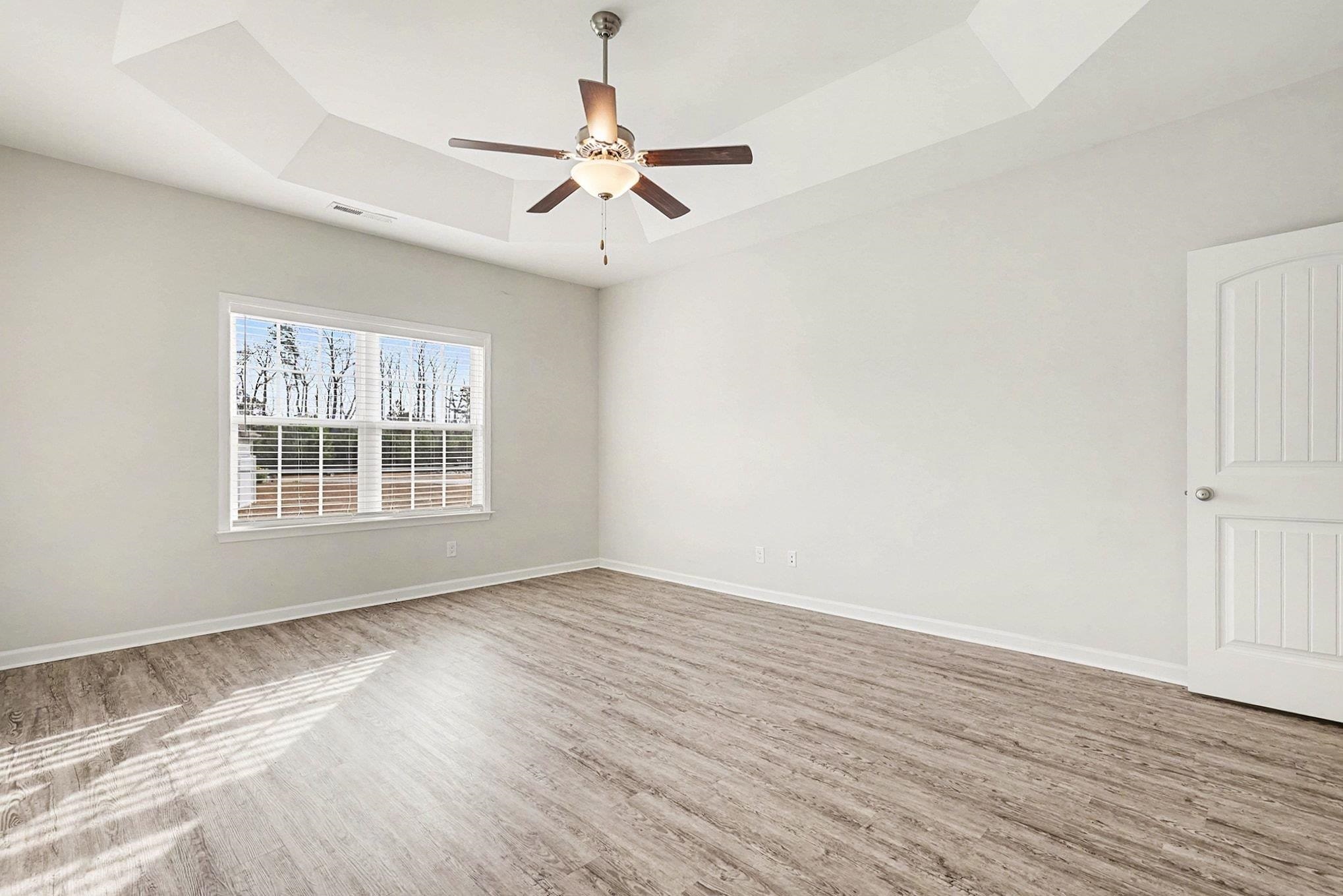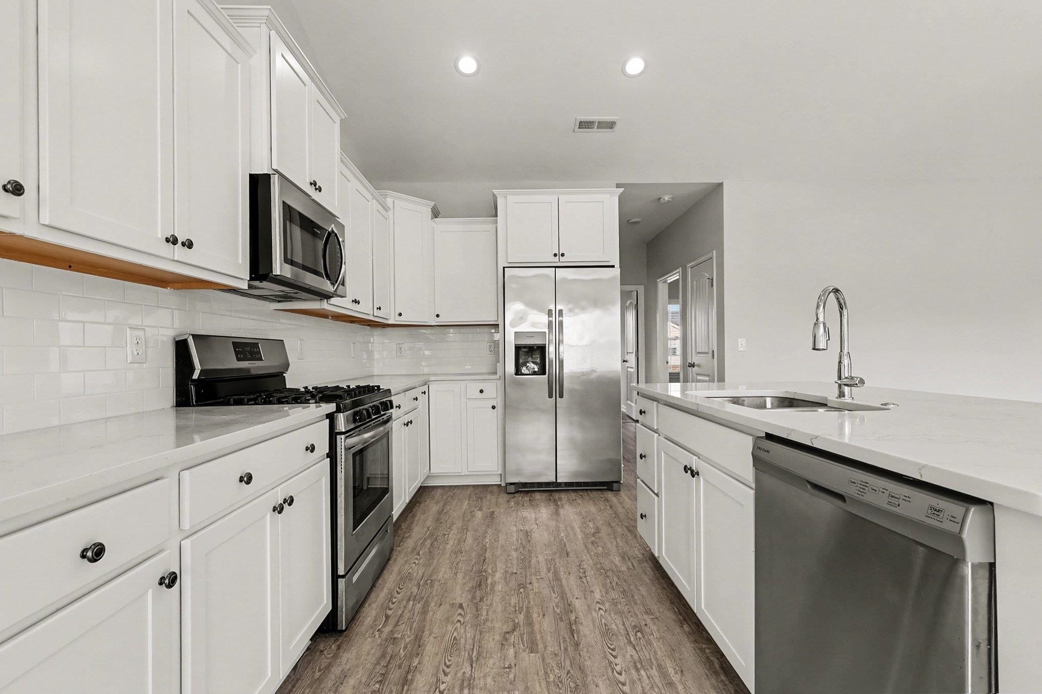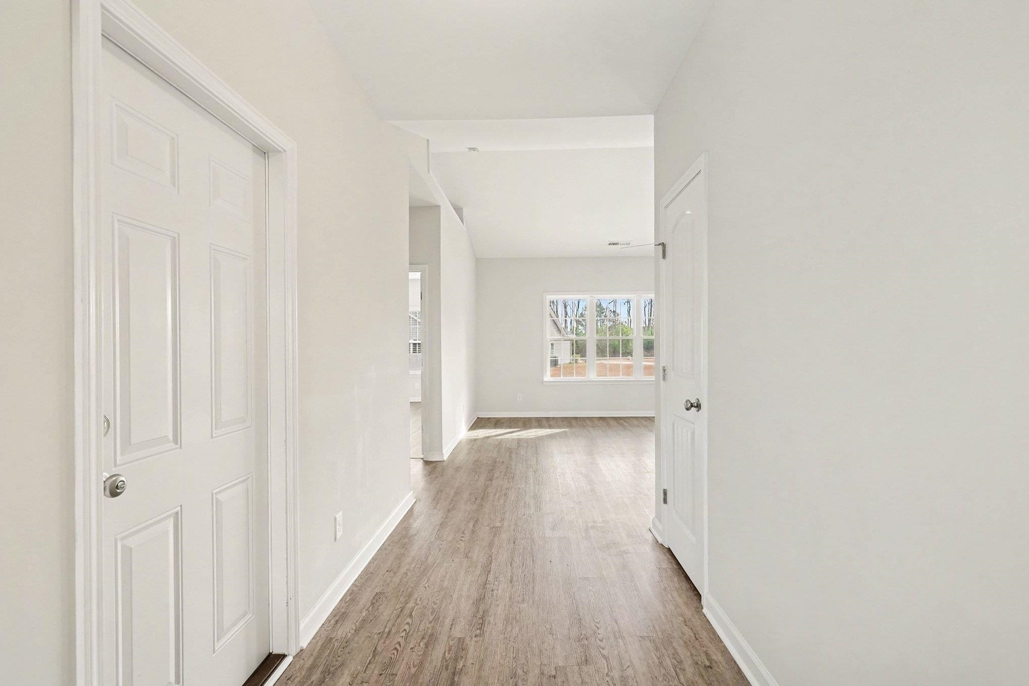 Move-in ready and loaded with upgrades, this immaculate single-level 3-bedroom, 2-bath home in The Village at Longs offers modern living just 10-15 minutes from the beach in a natural gas community. Built in 2022 with 1,701 heated square feet on a spacious .22-acre corner lot, the home features smooth ceilings throughout and upgraded laminate flooring that replaces all original carpet and vinyl for a clean, seamless look. A wide foyer opens to a bright, open great room and kitchen with an impressive 11'9" vaulted ceiling, filling the space with natural light. The kitchen includes quartz countertops, staggered white cabinetry with crown molding, a large island with breakfast bar and double undermount sink, stainless steel Frigidaire appliances, and a double-door pantry. The dining area leads to a covered back porch and extended concrete patio, ideal for outdoor enjoyment. The split bedroom layout offers privacy, with two guest bedrooms featuring added ceiling fans and a full guest bath, while the primary suite includes a tray ceiling, dual-sink vanity, oversized walk-in shower with seat, dual linen closets, and a large walk-in closet. Additional highlights include a full irrigation system, Rinnai tankless gas water heater, energy-efficient 14 SEER HVAC with gas furnace, Low-E windows and doors, termite bond, hardwired security system, and a spacious laundry room with washer and dryer. The 2-car garage includes pull-down attic storage, and the location provides quick access to grocery stores, the new post office, dining, shopping, the Intracoastal Waterway, and the beaches of North Myrtle Beach.
