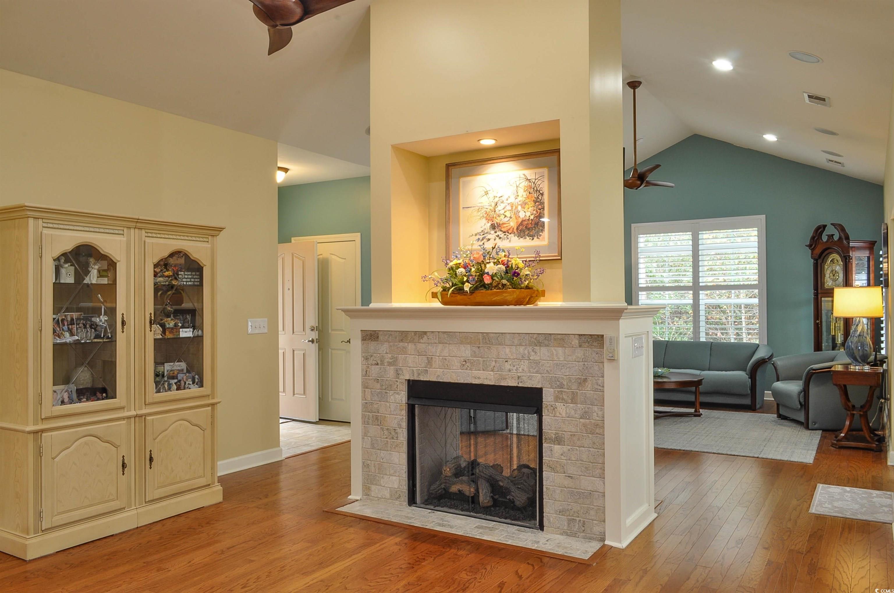 Are you seeking a Condo and want to maintain that spacious and gracious single family home feeling? Look no further. As you enter the front foyer with coat closet, the feeling that you are in a beautiful single family with wide open spaces sets in your mind. This one level home with vaulted ceilings and open floor plan allows you to age in place. The Living Room features a large seating/conversation area with a vaulted ceiling, luscious hardwood floors, custom plantation shutters, a ceiling fan and double-sided fireplace. As you viewed from the foyer, there is a double slider off the Living Room as well; this leads to a paver patio/courtyard with propane firepit and flowing fountain both of which remain. This patio adjoins the primary bedroom on its far side for easy access and morning coffee. Moving just off the living room area is a small 3rd bedroom. It is a cozy room and can be used as a den, study-office, craft room, or TV room. With French doors and custom drapes, this room can be completely closed off for privacy. The second side of the double-sided fireplace reveals a flex space which escorts a formal dining area (with room to mingle and enjoy a lovely buffet) and leads into the kitchen. The split bedroom plan devotes a full wing to the guest suite with double closets and silhouette blinds This bedroom is served by a next- door hallway bath with gracious appointments, lovely vanity, and a tub shower combo. In this wing is a large laundry room with a sink, cabinetry, a huge storage closet with abundant hot water heater. On the other side of the beautiful Double Fireplace is a flex space where flooring goes from luscious Hardwoods to Porcelain Tile. This space is an expansion of the formal dining area and leads into the kitchen. The heart of any home IS the kitchen. The owners have spared no expense in updating it with all new cabinetry, porcelain tile floors, new range, double convection ovens, and dishwasher. The joy of cooking an every-day meal, setting out a huge buffet for family holidays, or simply having a glass of wine with friends at the massive solid surface island, is proof positive this is NOT A ONE PERSON KITCHEN! Just off the kitchen is the oversize 480 Sq Ft 2 Car Garage with built in cabinetry, a workshop atmosphere, pull- down stairs to the attic, and floored attic storage. Get out of the car, take the groceries in thru the kitchen door, and put them away in TWO large kitchen pantries. There are 2 wings off of the Dining Walk Thru. One is the King Size Primary suite which brings us back to the double slider doors leading to the private patio/courtyard. This suite features reading lights over the bed, a huge walk- in closet, spa-like primary bath with double vanity and tumbled stone shower, vaulted ceilings, and a ceiling for coastal breezes. The second wing of the home features the private guest suite, with double closets and a well- appointed large bath with tub/shower off the immediate hallway. The dedicated laundry room with sink, cabinetry, a large closet, and abundant hot water heater rounds it out. Keep in mind, all 3 bedrooms boast total privacy in this split floor plan. We have introduced you verbally to this home, now it is time that you see it with your own eyes. Measurements for this home were taken from courthouse records; buyers and their agents are welcome to measure. With any offer involving a lender, a letter from intended lender is requested along with proof of cash funds to close. Call for your private showing today and make this luxury home your own.
