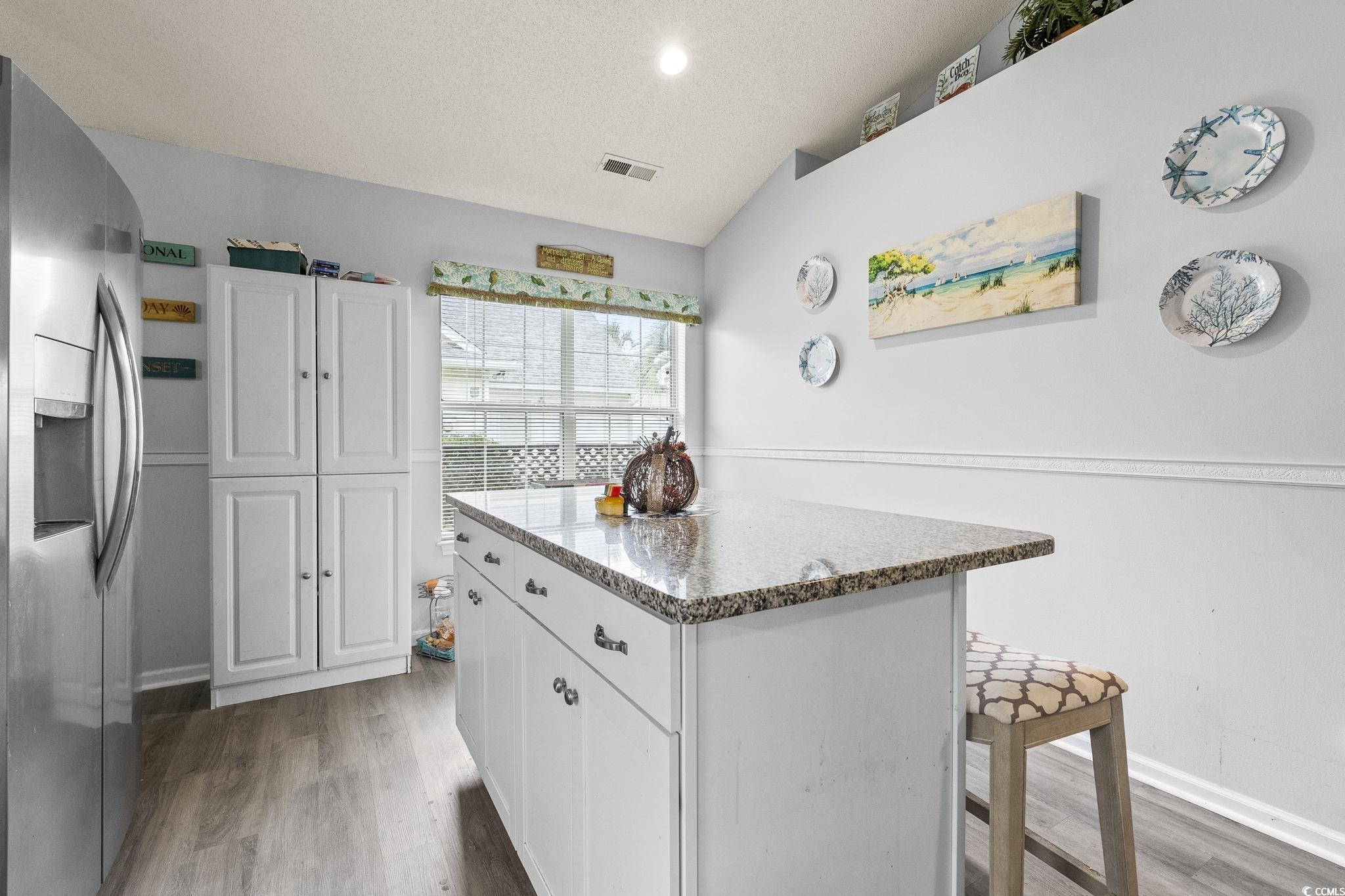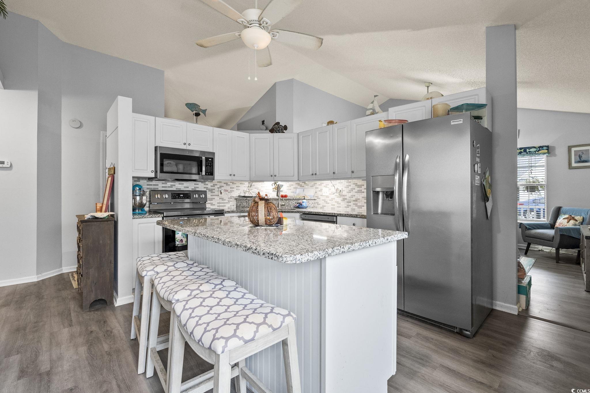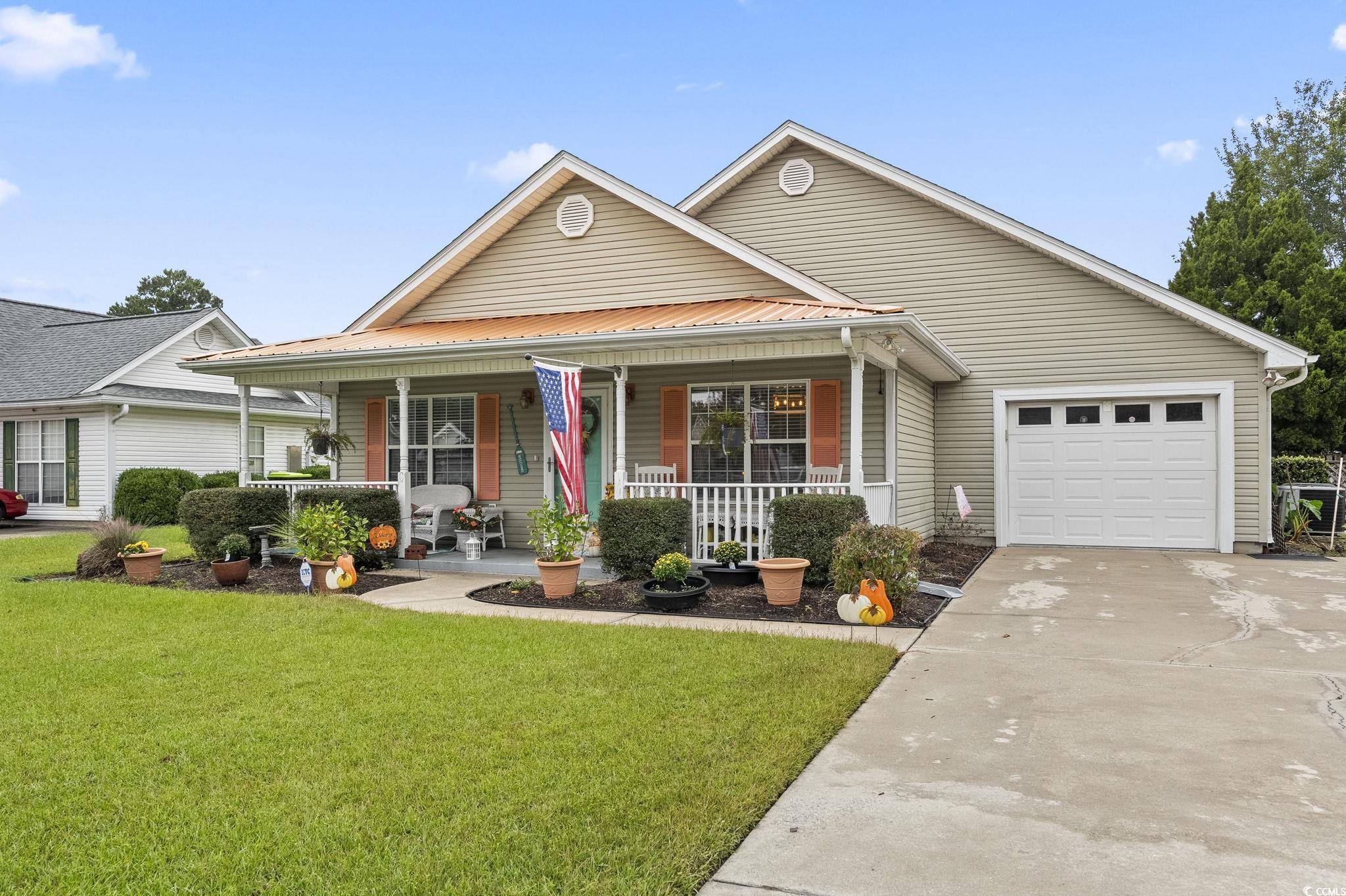 This beautifully maintained single-level home offers a bright, open layout with coastal charm throughout. The spacious living room features vaulted ceilings, neutral tones, and abundant natural light - an ideal space for relaxing or gathering. The kitchen is designed for both style and functionality with granite countertops, stainless steel appliances, tile backsplash, and a large peninsula with bar seating that opens seamlessly into the main living area. The split-bedroom floor plan provides privacy, with the primary suite featuring a tray ceiling, walk-in closet, and private en-suite bath. Two additional bedrooms are perfect for guests, or a home office, offering flexible options to suit your lifestyle. A bright sunroom extends the living space and opens to a covered patio, ideal for outdoor dining or morning coffee. The fenced backyard includes a storage shed - great for tools, outdoor equipment, beach chairs, and coolers. Out front, a welcoming porch framed by mature landscaping creates a perfect spot to relax and enjoy the coastal breeze. This home is ideally located just a short drive to Market Common, golf courses, restaurants, water sports, entertainment, and the Murrells Inlet MarshWalk - plus the beautiful Atlantic beaches. If you've been searching for a convenient, low-maintenance lifestyle close to everything the Grand Strand has to offer, this is the one. Square footage is approximate and not guaranteed. Buyer is responsible for verification.