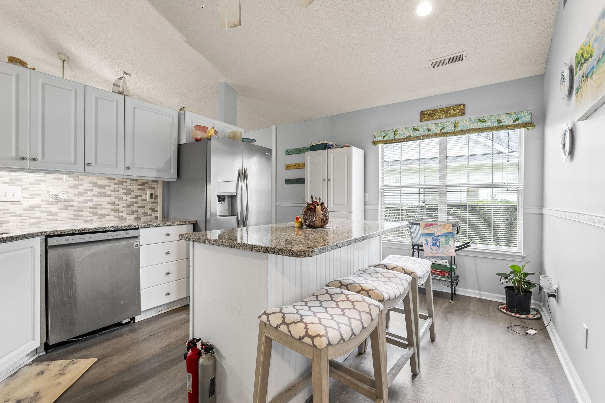 Thoughtfully designed for everyday living, affordable entry into homeownership, perfect for downsizing! This beautifully maintained single-level home offers a bright, open layout with coastal charm throughout. The spacious living room features vaulted ceilings, neutral tones, and abundant natural light - an ideal space for relaxing or gathering. The kitchen is designed for both style and functionality with granite countertops, stainless steel appliances, tile backsplash, and a large peninsula with bar seating that opens seamlessly into the main living area. The split-bedroom floor plan provides privacy, with the primary suite featuring a tray ceiling, walk-in closet, and private en-suite bath. Two additional bedrooms are perfect for guests, or a home office, offering flexible options to suit your lifestyle. A bright sunroom extends the living space and opens to a covered patio, ideal for outdoor dining or morning coffee. The fenced backyard includes a storage shed - great for tools, outdoor equipment, beach chairs, and coolers. Out front, a welcoming porch framed by mature landscaping creates a perfect spot to relax and enjoy the coastal breeze. This home is ideally located just a short drive to Market Common, golf courses, restaurants, water sports, entertainment, and the Murrells Inlet MarshWalk - plus the beautiful Atlantic beaches. If you've been searching for a convenient, low-maintenance lifestyle close to everything the Grand Strand has to offer, this is the one. Square footage is approximate and not guaranteed. Buyer is responsible for verification.