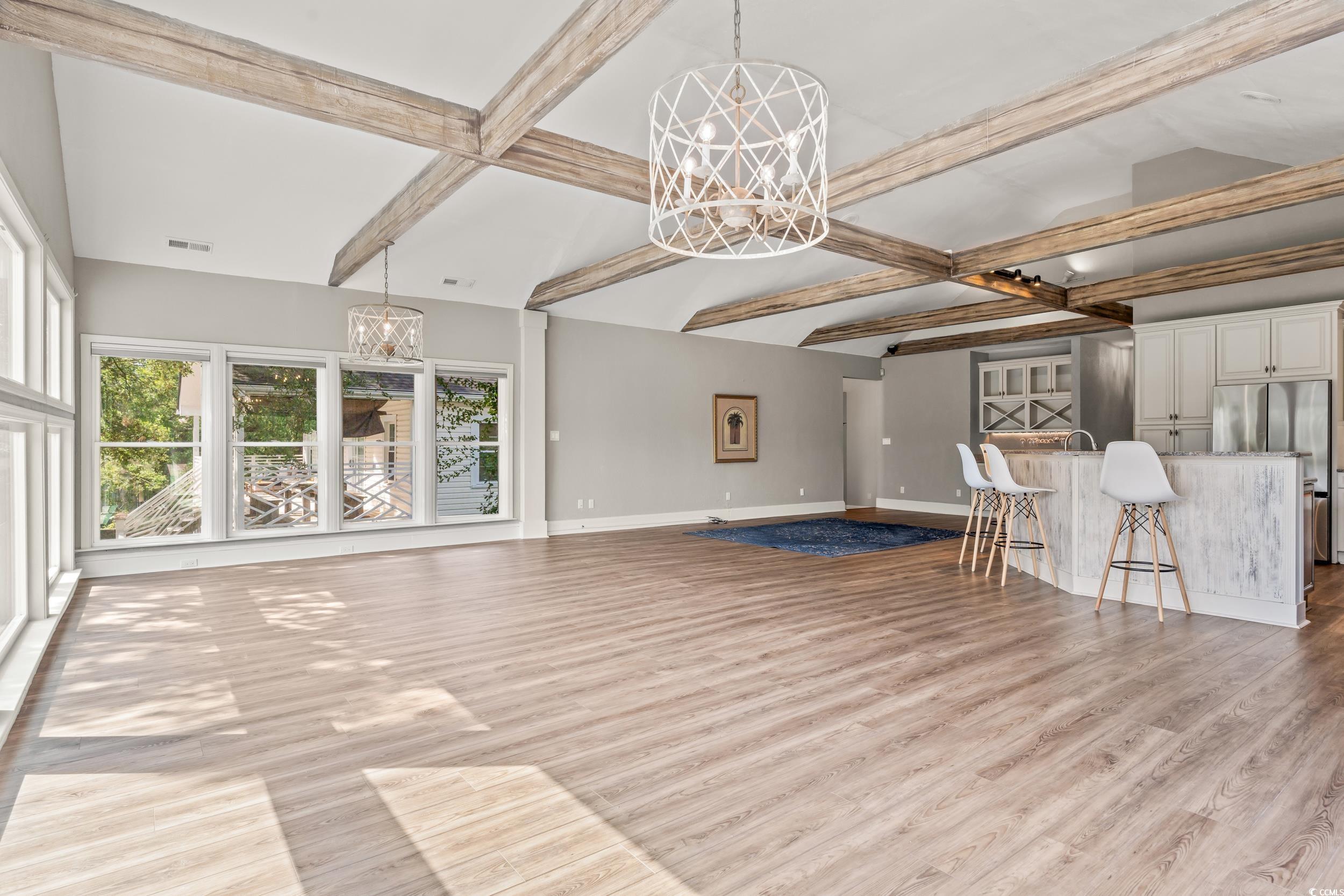 3597 Sunfish St. is nestled along Murrells Inlet creek, this 4-bedroom, 4-bathroom home offers the perfect blend of coastal charm and versatility. Enjoy direct access to the creek for kayaking, paddle-boarding, boating or simply soaking in the waterfront views. The main residence features a spacious, open-concept layout with two well-appointed bedrooms and two full bathrooms on the main level, ideal for both everyday living and entertaining. The rich, wood-toned beams draw the eye upward, creating a sense of height and rustic elegance. Thoughtfully integrated accent lighting along the beams cast a warm, ambient glow throughout the room! Expansive windows and multiple living spaces bring in natural light and provide serene views of the water. The heart of the home is a beautifully updated kitchen, featuring granite countertops and kitchen island, this space offers ample room for meal prep and entertaining. A striking ornate range hood serves as a stunning focal point, adding a touch of sophistication and craftsmanship to the room. Stainless steel appliances, including a modern refrigerator, dishwasher, and professional-grade range, complement the upscale finishes and ensure a seamless cooking experience. Designed to impress! There is an elevator to each level! A unique highlight of the home is the full apartment on the ground level, complete with its own separate entrance, kitchen, living area, fireplace, two bedrooms, two bathrooms and washer/dryer—perfect for guests, extended family, or rental income opportunities. The screened porch is a great extension from the living area overlooking the swimming pool and covered sitting area with rocking chairs that connects to the dock. The pool deck is a great place to cool off and enjoy the Carolina sunshine after a day boating on the creek. Designed for both convenience and enjoyment, the dock features a boat lift perfectly suited for a pontoon boat, making it easy to launch and store your vessel with minimal effort. Tucked beneath the shade of mature trees, a hammock invites relaxation! Another great feature is solar panels! The outdoorsmen will appreciate the attached storage room for fishing, tackle and your other creek life needs. Conveniently located to everything Murrells Inlet has to offer, golf cart/bike ride distance to the to the famous, Marsh-walk, restaurants and entertainment! Whether you're seeking a primary residence, a vacation getaway, or an investment opportunity, this creekfront gem offers the best of Murrells Inlet living in a peaceful, natural setting.