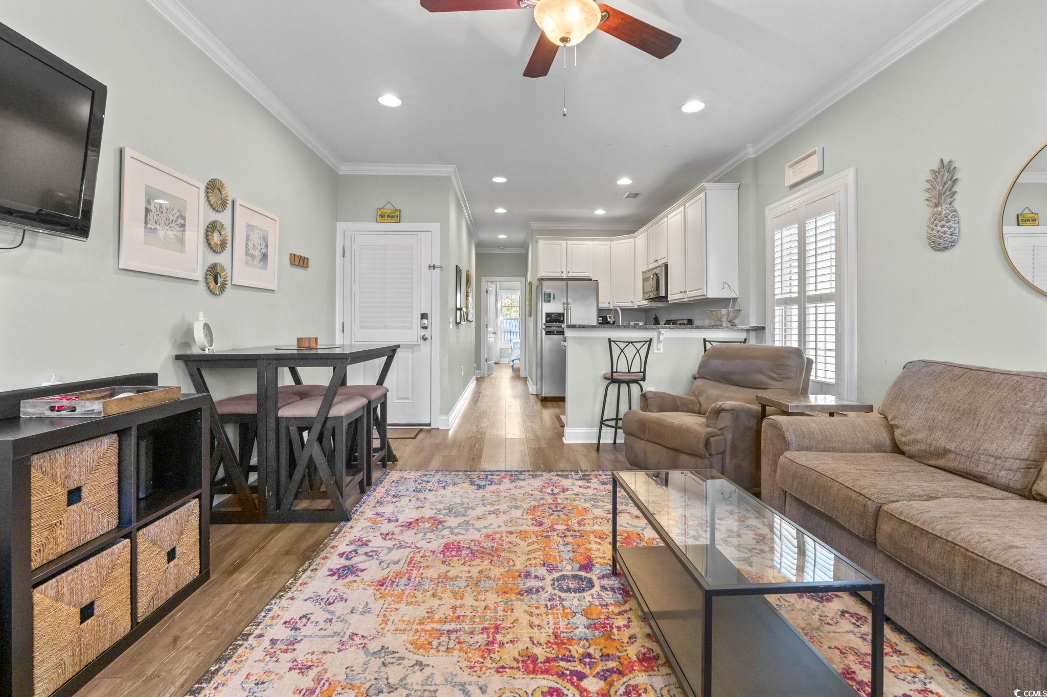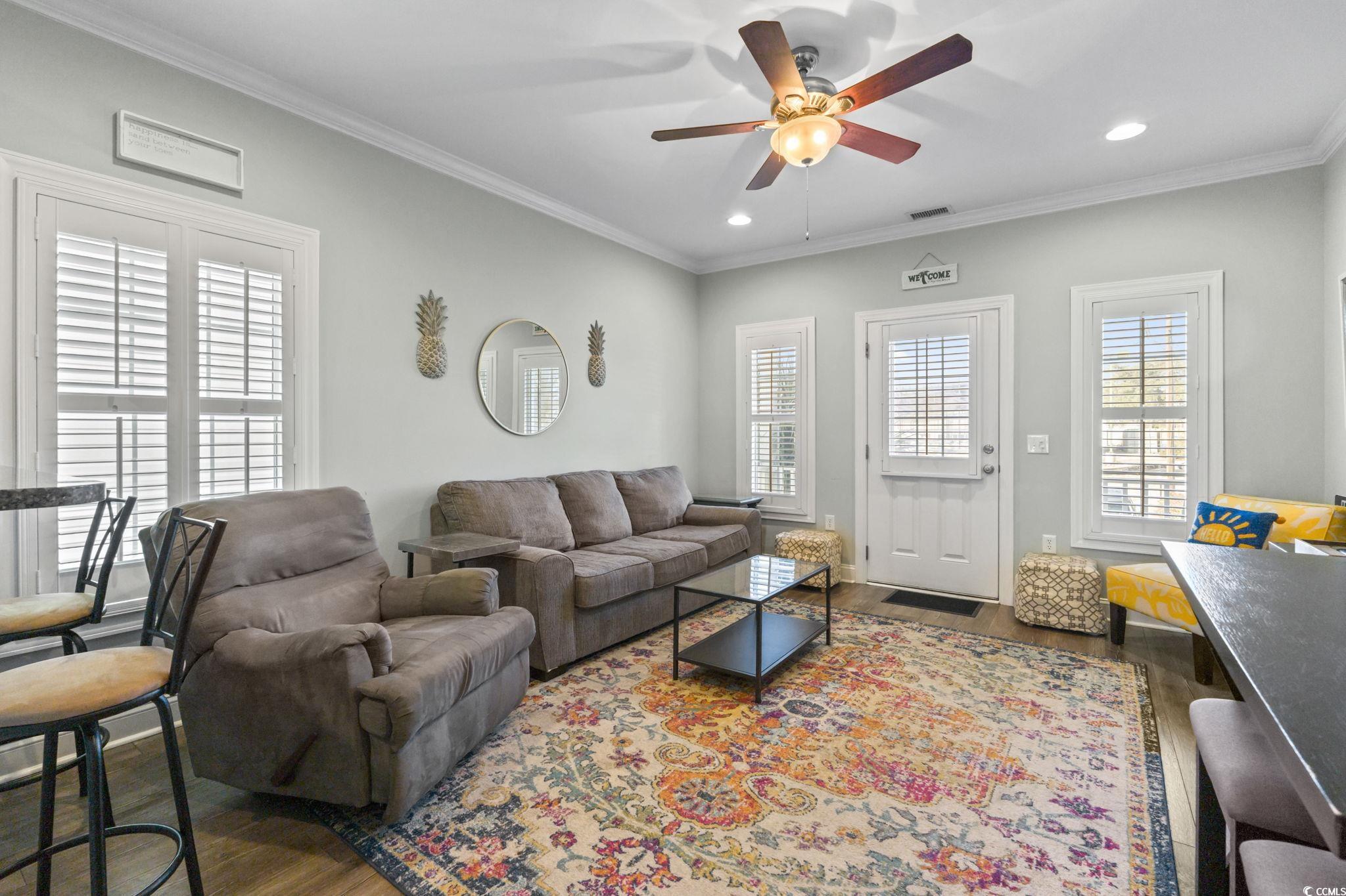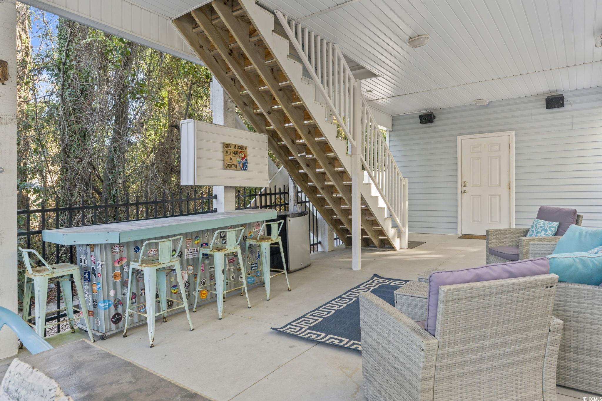 3-bed raised beach home with no HOA, balcony, and golf cart ride to the beach! Looking for a beach home close to the ocean with no HOA and room to relax and entertain? This 3-bedroom, 2-bath raised beach - style home offers the coastal lifestyle many buyers search for near Myrtle Beach and the Grand Strand. Located just a short golf cart ride to the beach, this home blends comfort, flexibility, and easy coastal living. When you enter the main living space, you are welcomed by luxury vinyl plank flooring, neutral paint, recessed lighting, and crown molding, creating a clean and inviting feel. Natural light fills the home, making mornings feel bright and calm. Just off the living area is a 14x4 balcony with a ceiling fan, perfect for enjoying your morning coffee, reading a book, or unwinding in the evening. The kitchen is designed for both daily living and entertaining, featuring 42-inch white cabinets, granite countertops, stainless steel appliances, and a breakfast bar. The primary bedroom is located on the first living level and includes a Jack-and-Jill style bathroom that also connects to the hallway, offering convenience for guests. Upstairs, you will find two additional guest bedrooms with carpeting, ceiling fans, and crown molding, along with an updated full bathroom. The ground level offers open space with recessed lighting, ideal for outdoor gatherings, hobbies, or relaxing after a beach day. The lot is fully fenced, providing added privacy with room for a small pool or spa, and includes a 14x6 attached storage area for beach gear, bikes, or tools. With no HOA, there are no community restrictions, making this home a great option for a primary residence, second home, or investment property. This raised beach home is conveniently located near shopping, dining, entertainment, and local attractions including Barefoot Landing, with easy access to main roads for commuting around the Grand Strand. Whether you are enjoying quiet mornings on the balcony or spending your days at the beach, this home offers a relaxed coastal lifestyle in a highly desirable location. Measurements are not guaranteed and are the buyer's responsibility to verify.