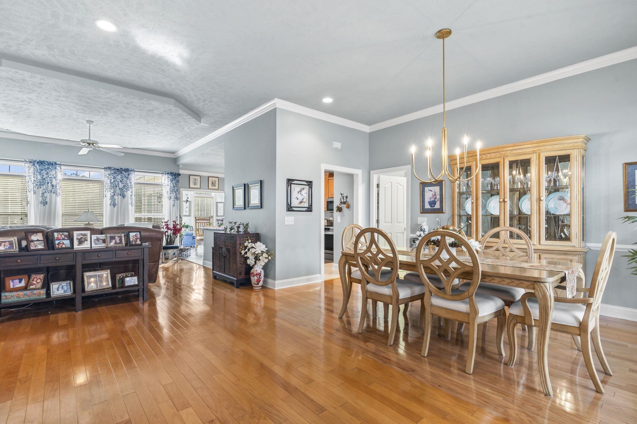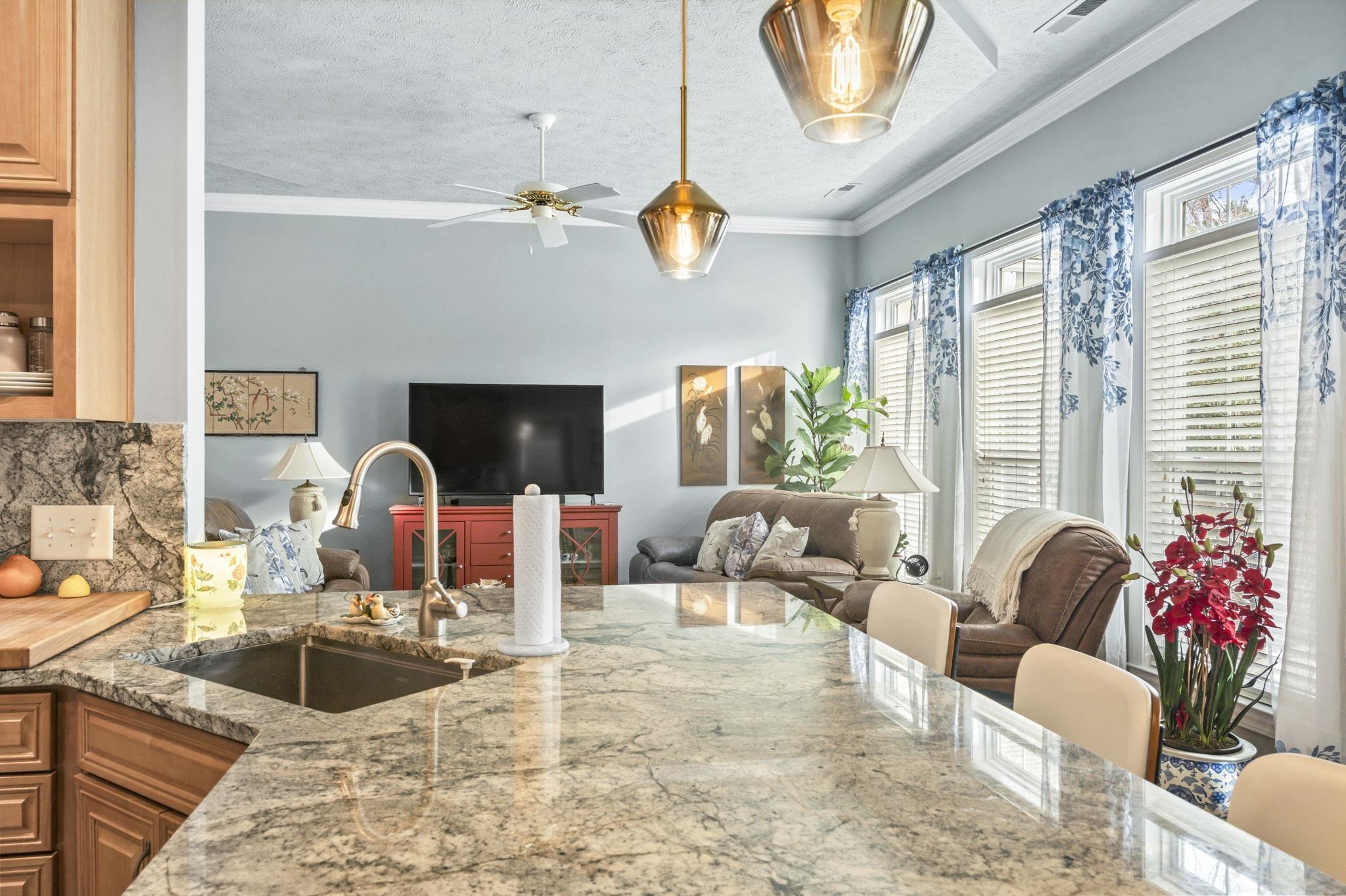 Three-bedroom, two-bathroom single-level home with a sunroom, private patio, pond views, wooded backdrop, and a two-car garage in the Laurel Bay section of Prince Creek in Murrells Inlet, South Carolina. Major systems updated in 2023, including a new roof, new HVAC, and new water heater. The floor plan features a formal dining room, a dedicated living room or study, a family room with soaring ceilings, a breakfast area, and a sunroom with large windows overlooking the private backyard. The kitchen includes Jasper Blue granite countertops, a full-height tile backsplash, stainless steel appliances, and ample cabinetry. Crown molding, upgraded lighting, and fresh paint run through the main living spaces. The primary suite includes a tray ceiling, bay window sitting area, garden tub, step-in shower, double-sink vanity, and a large walk-in closet. Two guest bedrooms share a full bathroom on the opposite side of the home. A dedicated laundry room connects to the two-car garage with additional storage. The professionally coated front porch and private rear patio with pond views complete the outdoor living spaces. Laurel Bay at Prince Creek amenities include a clubhouse, swimming pool, and tennis courts. Prince Creek is located minutes from Huntington Beach State Park, Brookgreen Gardens, Murrells Inlet MarshWalk, TPC Myrtle Beach, and the dining and shopping corridor along US-17 Business. Myrtle Beach International Airport is approximately 20 miles north. 2023 roof, 2023 HVAC, 2023 water heater, sunroom, pond views, Jasper Blue granite, soaring ceilings, bay window, garden tub, formal dining room, study, two-car garage, single-level, Laurel Bay, Prince Creek, Murrells Inlet, SC 29576. Measurements approximate; buyer responsible for verification.