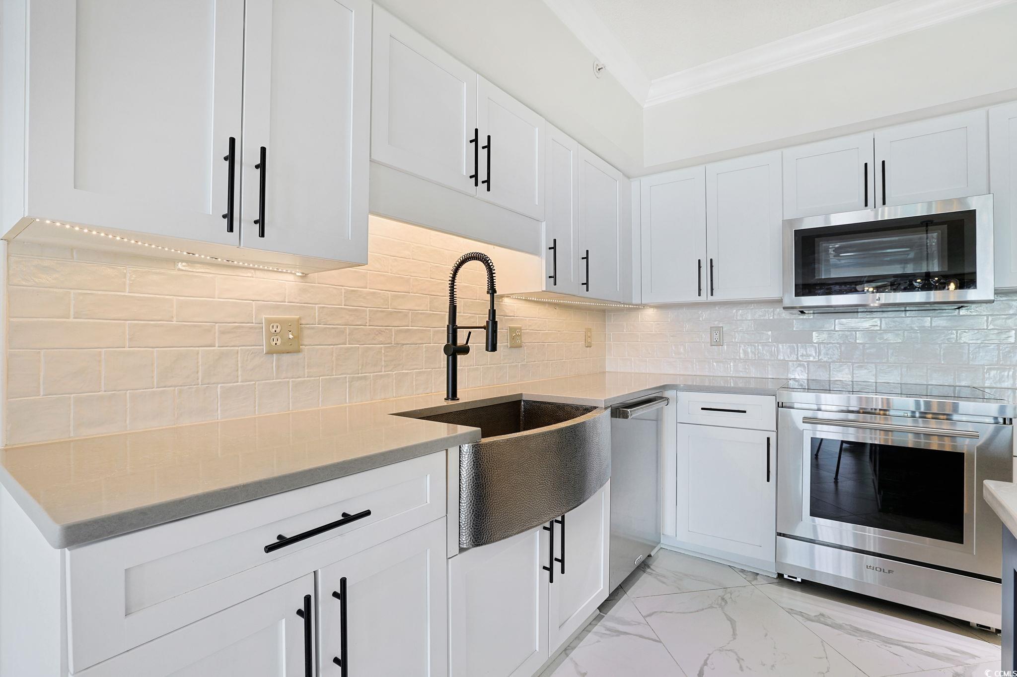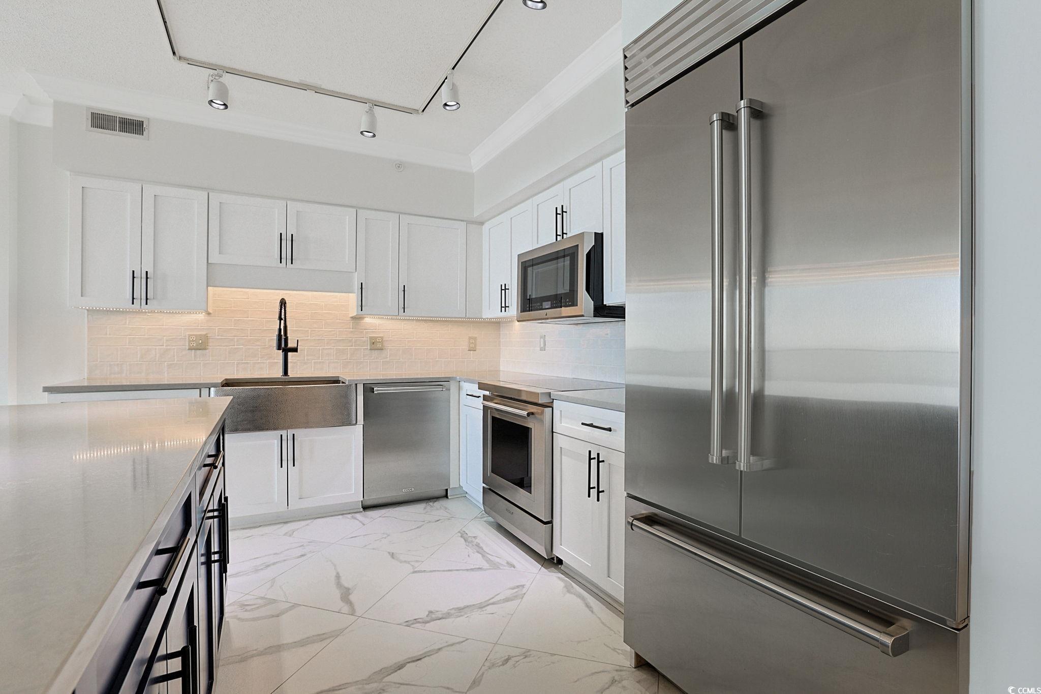Introducing this luxurious 3 bedroom 3 bath condo located in the Captains Quarters complex in the Litchfield by the Sea gated community. The condo has an incredible and spectacular penthouse wide ocean view will take your breath away along with stylish tile flooring, ceiling fans, crown moulding, and a classic living/dining room combo elegantly adorned with three pilasters that add a touch of architectural sophistication to the space. The kitchen is equipped with a Subzero refrigerator, Wolf range, Cove dishwasher, high end farm style sink, quartz counter tops, a kitchen island, cabinet spaces, and a computer niche. The primary bedroom offers a double door entryway and showcases a sliding glass door that opens up to the large balcony looking out to the sparkling Atlantic Ocean. It also includes a unique double barn door with one side that opens up to the large walk-in closet, and the other side opens up to the primary bath hosts a vanity, a comfort station, and a deluxe step-in shower. This delightful condo is completed with two additional bedrooms each with an en-suite full bath, laundry closet, and an extra storage closet. Litchfield by the Sea residents have access to a private beach club, scenic trails for biking and walking, a pier for fishing, a dock for crabbing, tennis facilities, a Starbucks, and the Coastal Dish dining experience. This home affords you easy access to the beach and golfing along with all of the other activities and happenings in Pawleys Island and Myrtle Beach, including fun eateries, award winning off-Broadway shows, public fishing piers, Marsh Walk, and intriguing shopping adventures along the Grand Strand. Conveniently located to your everyday needs, including grocery stores, banks, post offices, medical centers, doctors’ offices, and pharmacies. Check out our state of the art 3-D Virtual Tour.