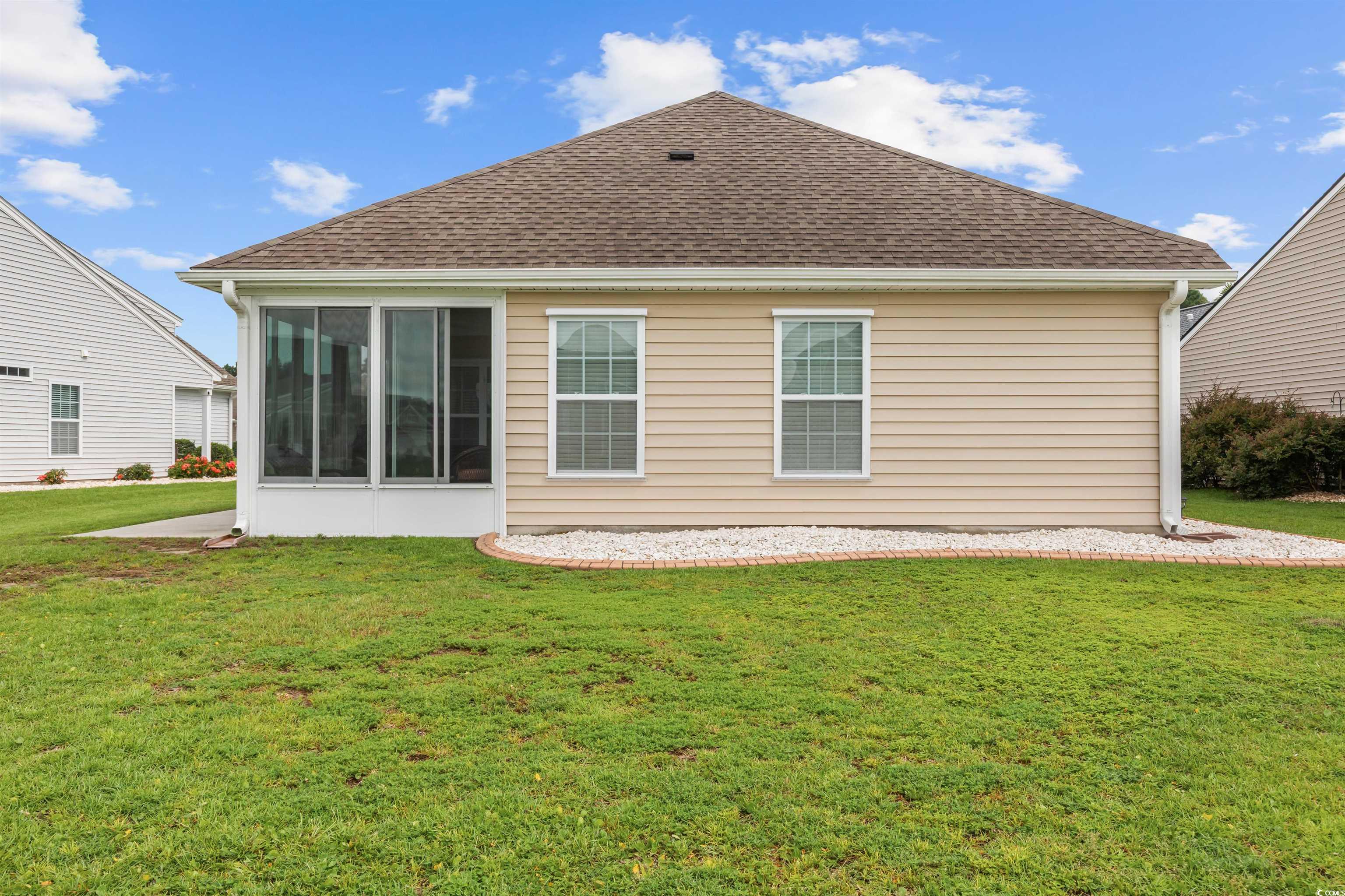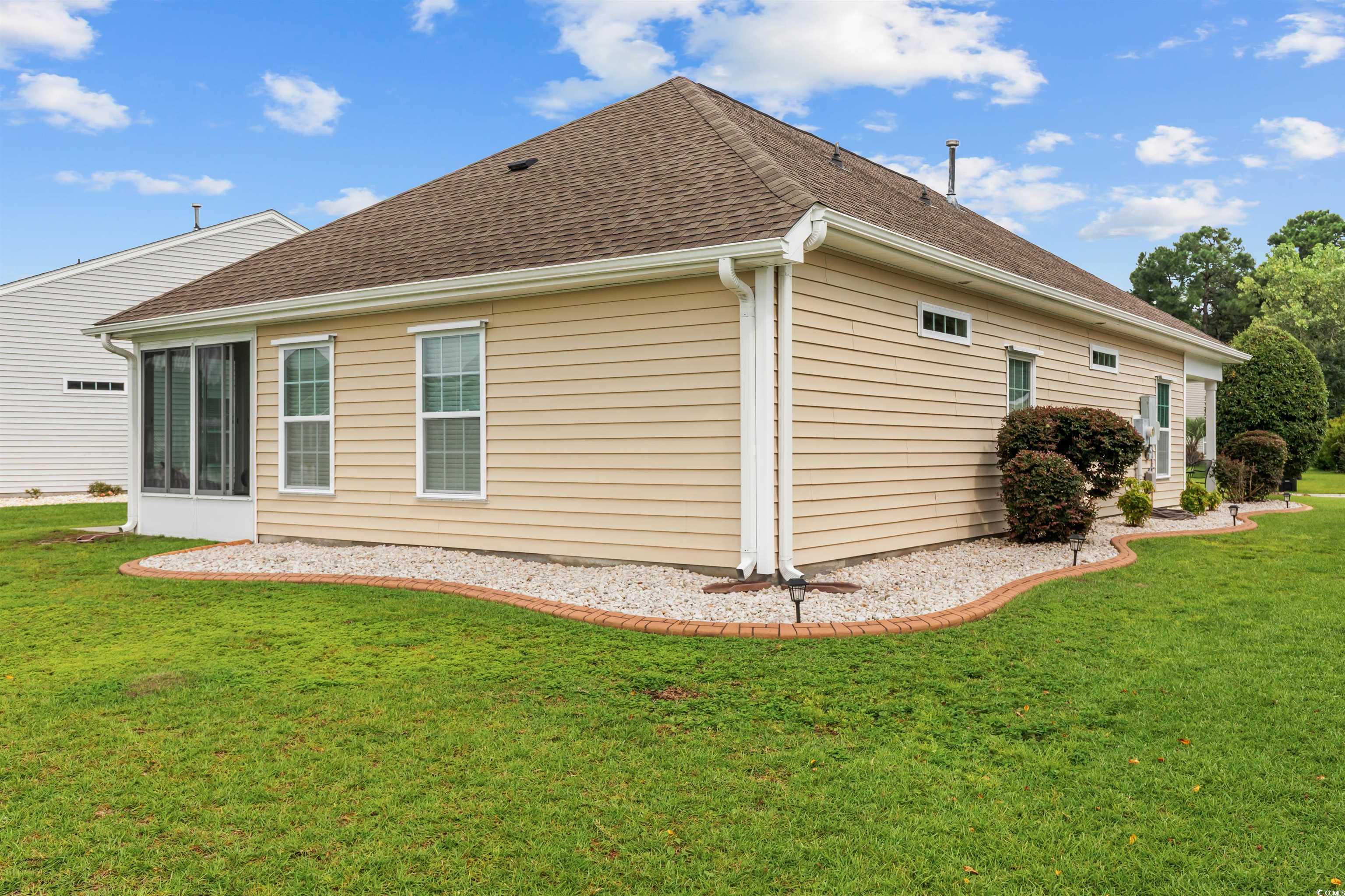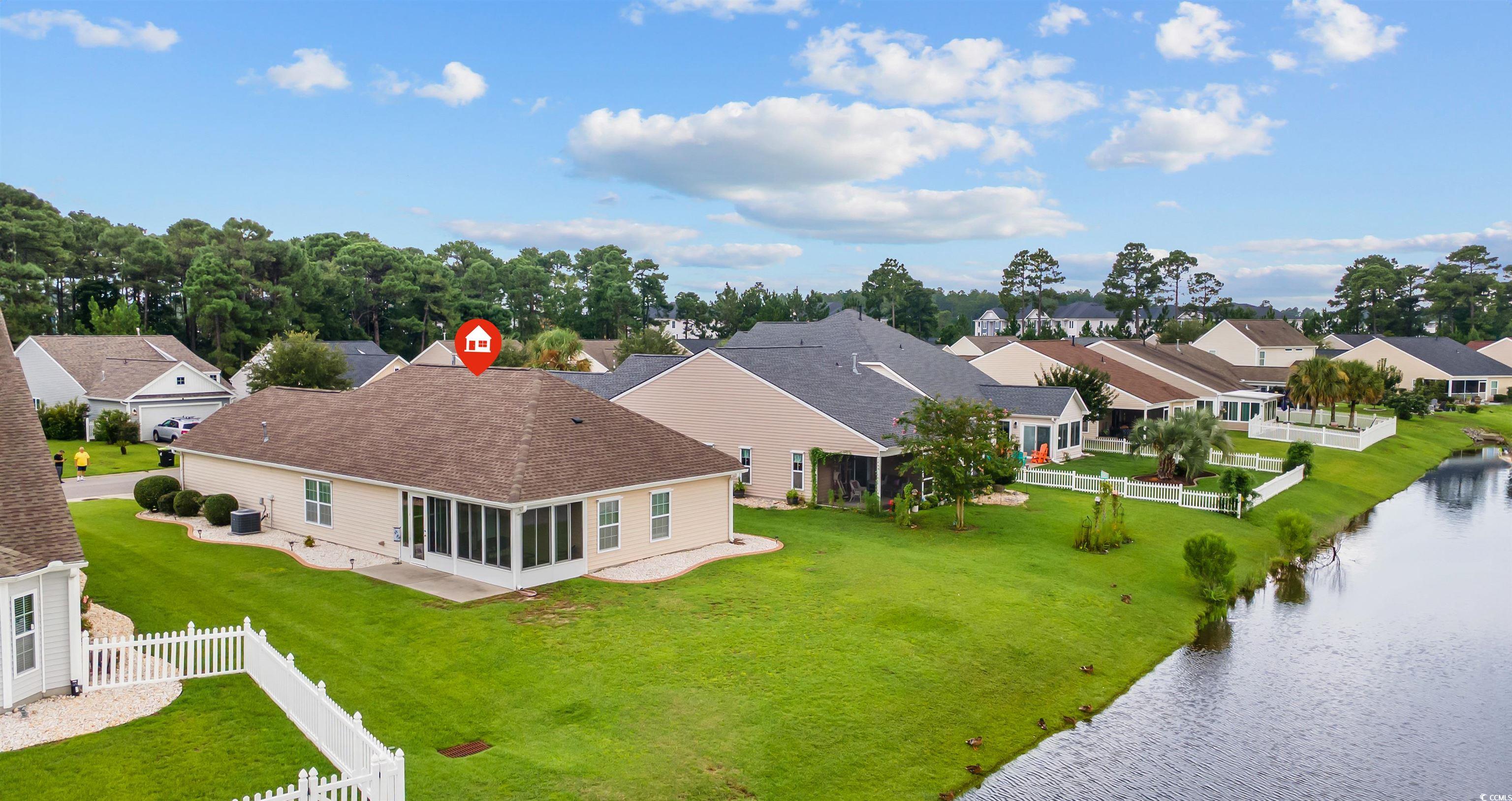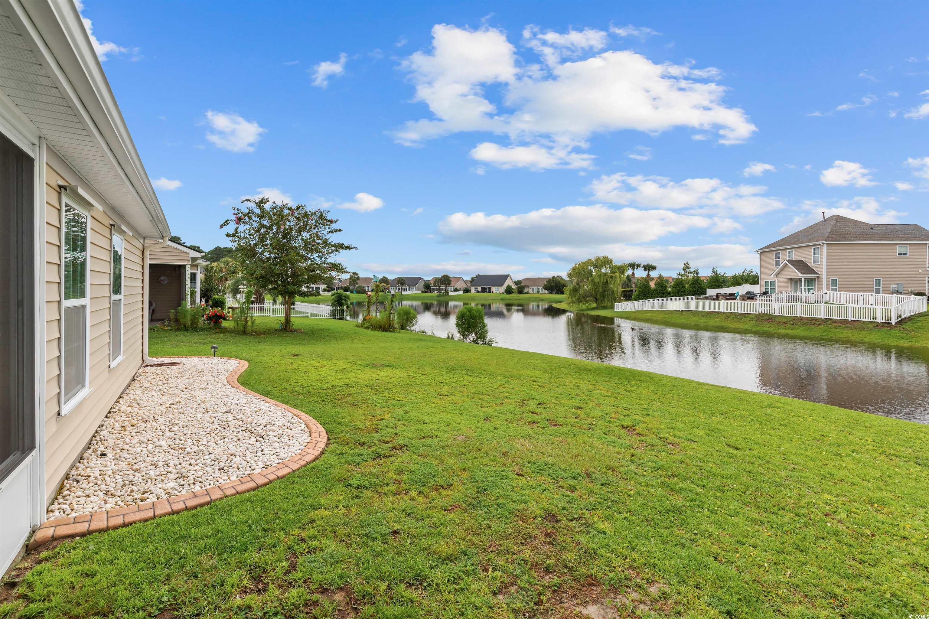 This meticulously maintained home still shows like new and has only been used a few times a year as a second residence. Featuring 3 bedrooms and 2 bathrooms, this single-story home boasts an open floor plan and sits on a beautiful pond lot with direct water views. The kitchen is a standout with an expansive 8-foot work island with bar seating, stainless steel appliances, ceiling-height cabinetry for a clean, elegant look, and tile flooring. The split-bedroom layout offers privacy, while the combined living and dining area is filled with natural light. The spacious master suite includes a large walk-in closet and an en suite bath with a walk-in shower. One of the newest features is the fully enclosed 8x19 sunroom, completed in the past year, providing the perfect spot to relax and take in the serene water views. Additional upgrades include a new architectural roof installed in 2020 and Mid-Atlantic storm shutters for extra protection. The exterior is equally impressive with mature, manicured landscaping, CurbScape edging, and an irrigation system. Located in the sought-after Carolina Forest area, Summerlyn offers fantastic community amenities including a pool, clubhouse, picnic area, and playground—all surrounded by lush palms and overlooking the scenic pond. Don’t miss this rare opportunity to own a like-new home in a prime location!