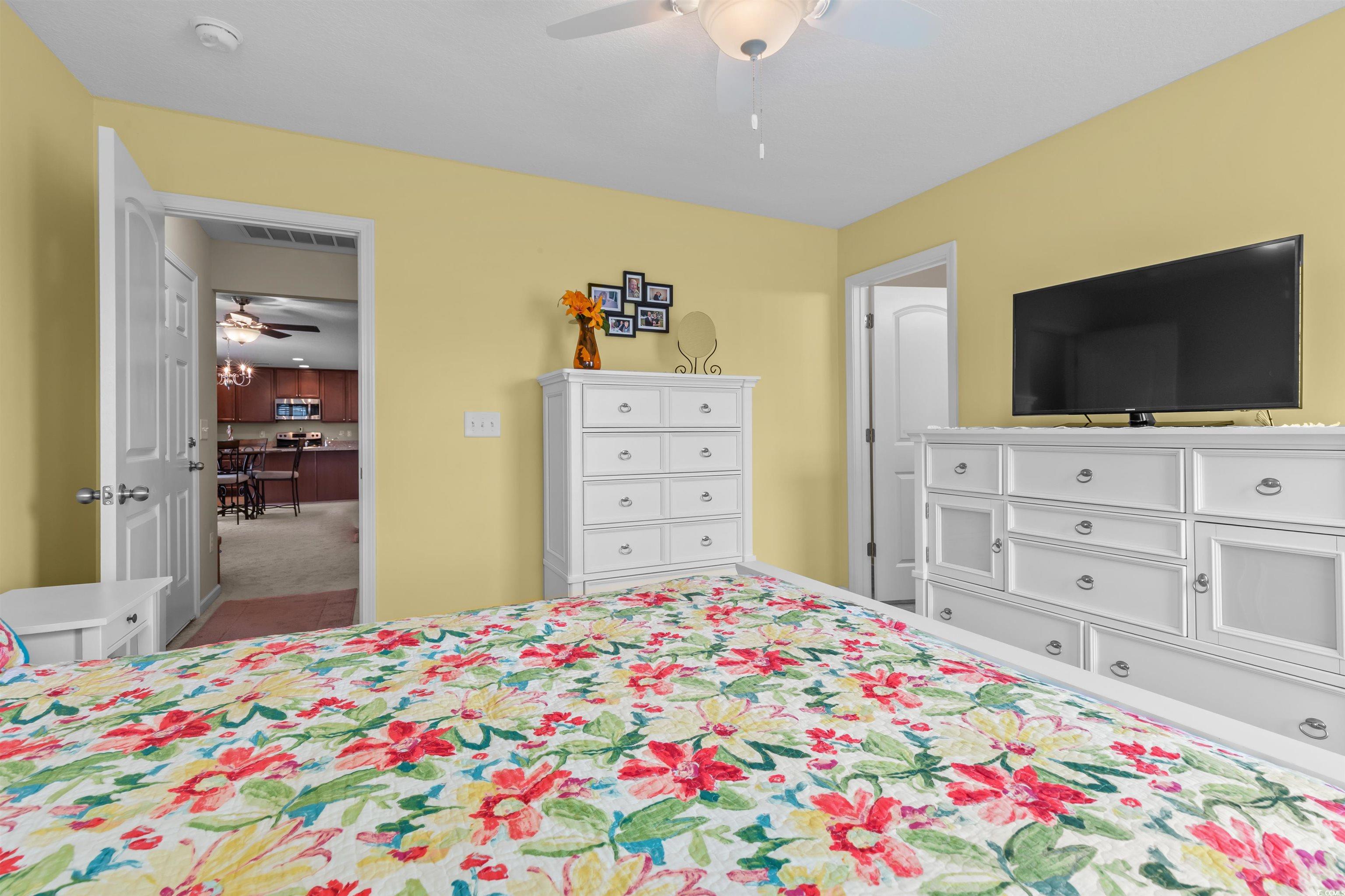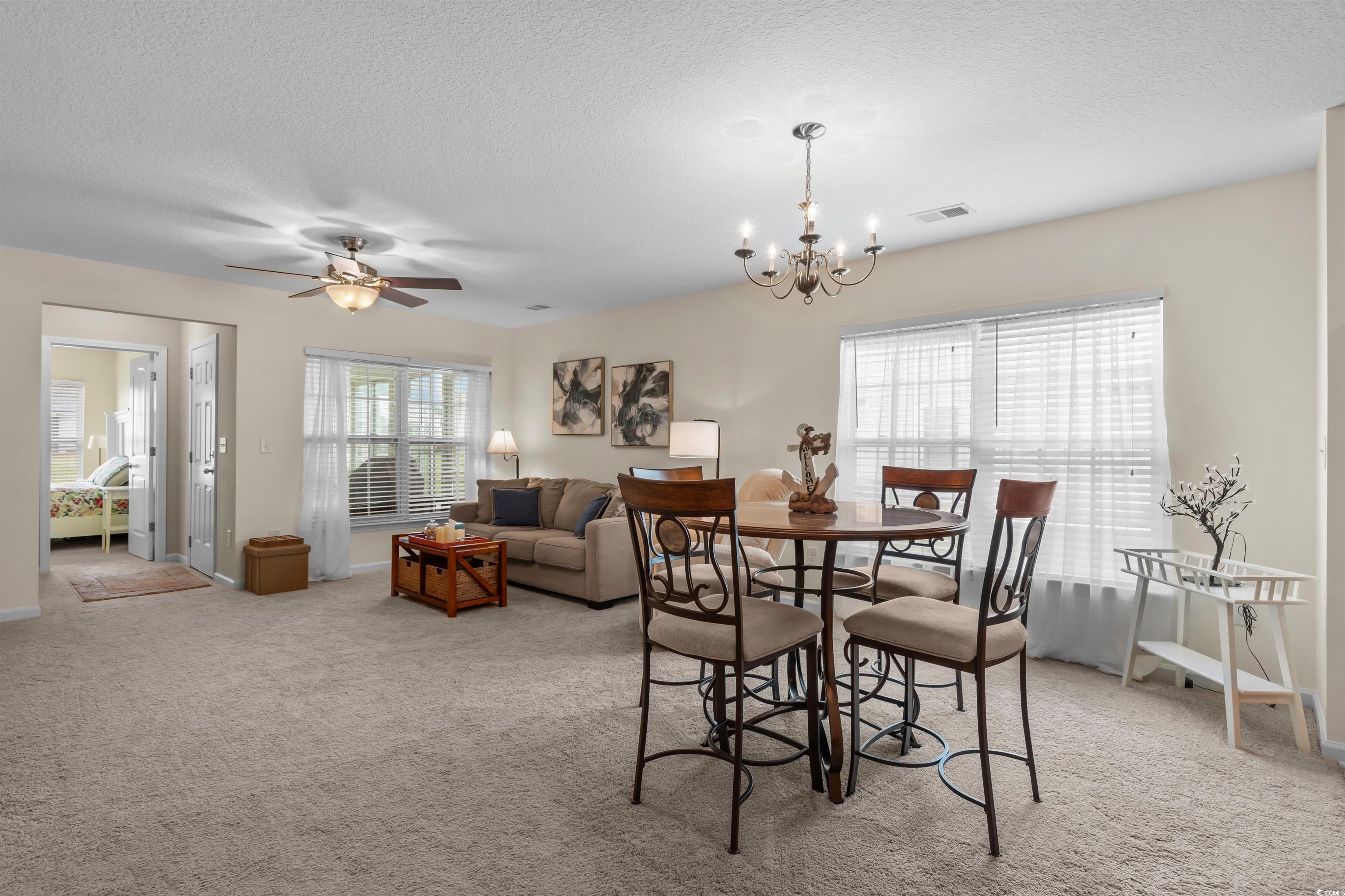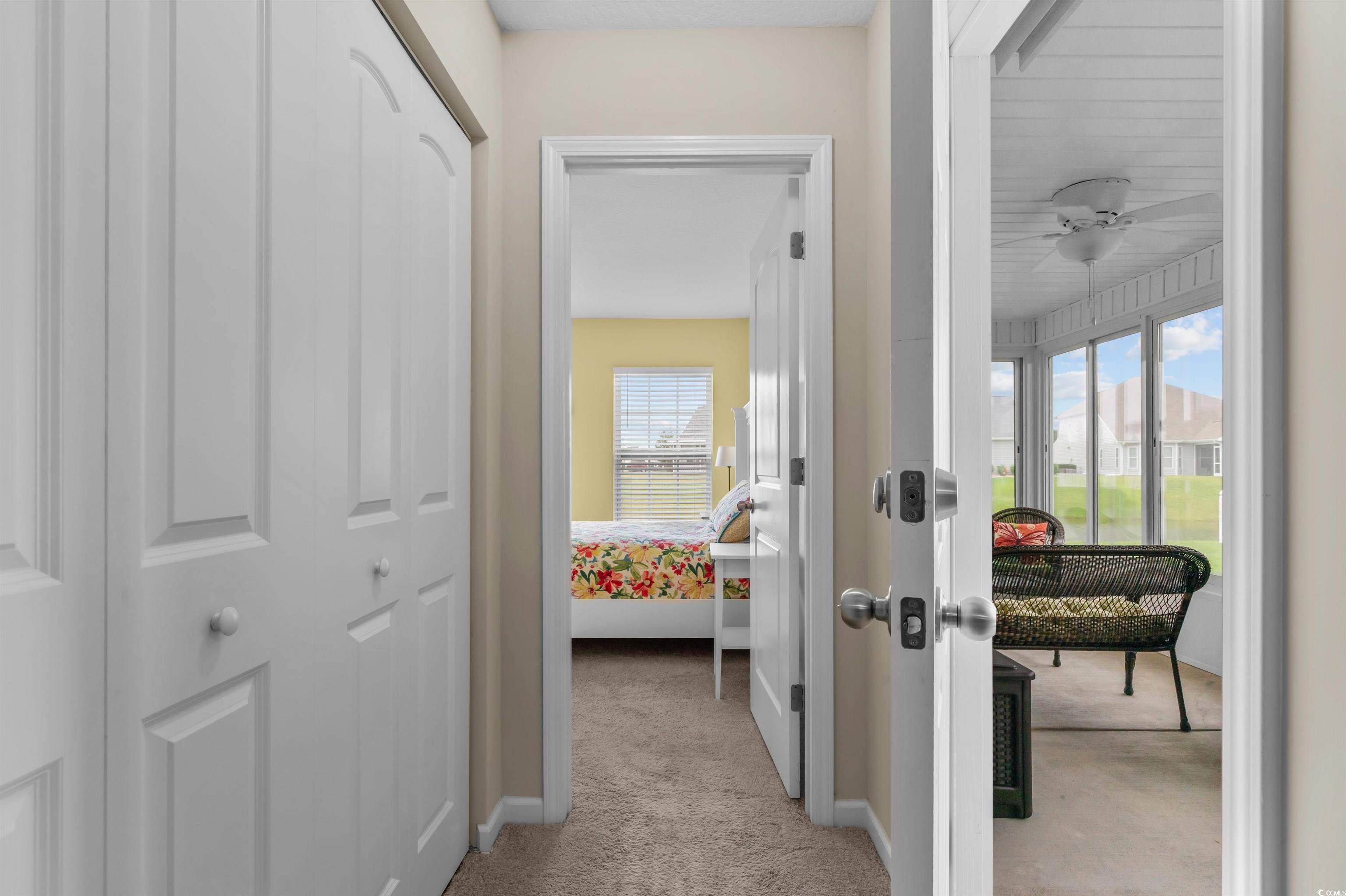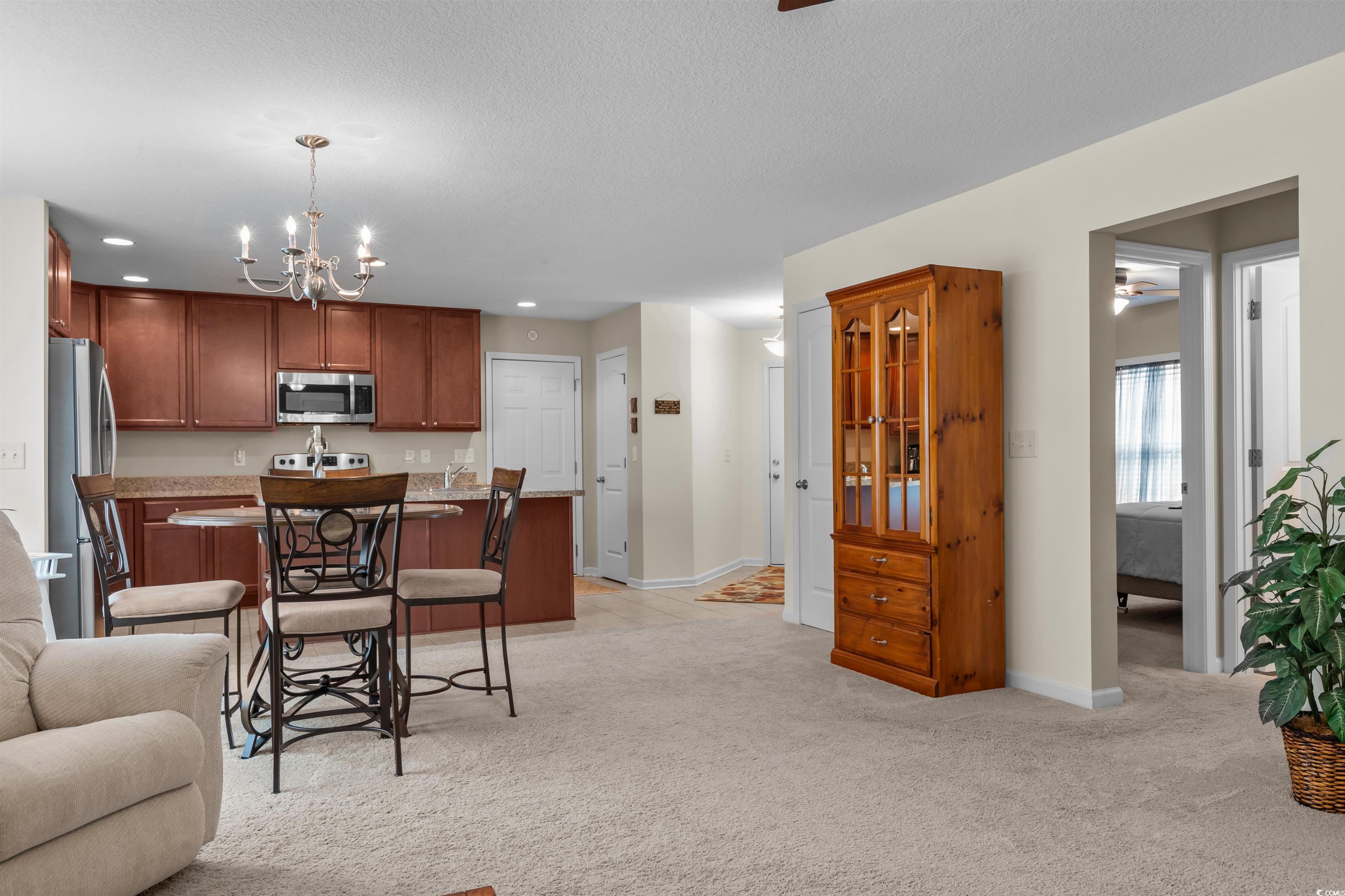 This meticulously maintained home still shows like new and has only been used a few times a year as a second residence. Featuring 3 bedrooms and 2 bathrooms, this single-story home boasts an open floor plan and sits on a beautiful pond lot with direct water views. The kitchen is a standout with an expansive 8-foot work island with bar seating, stainless steel appliances, ceiling-height cabinetry for a clean, elegant look, and tile flooring. The split-bedroom layout offers privacy, while the combined living and dining area is filled with natural light. The spacious master suite includes a large walk-in closet and an en suite bath with a walk-in shower. One of the newest features is the fully enclosed 8x19 sunroom, completed in the past year, providing the perfect spot to relax and take in the serene water views. Additional upgrades include a new architectural roof installed in 2020 and Mid-Atlantic storm shutters for extra protection. The exterior is equally impressive with mature, manicured landscaping, CurbScape edging, and an irrigation system. Located in the sought-after Carolina Forest area, Summerlyn offers fantastic community amenities including a pool, clubhouse, picnic area, and playground—all surrounded by lush palms and overlooking the scenic pond. Don’t miss this rare opportunity to own a like-new home in a prime location!