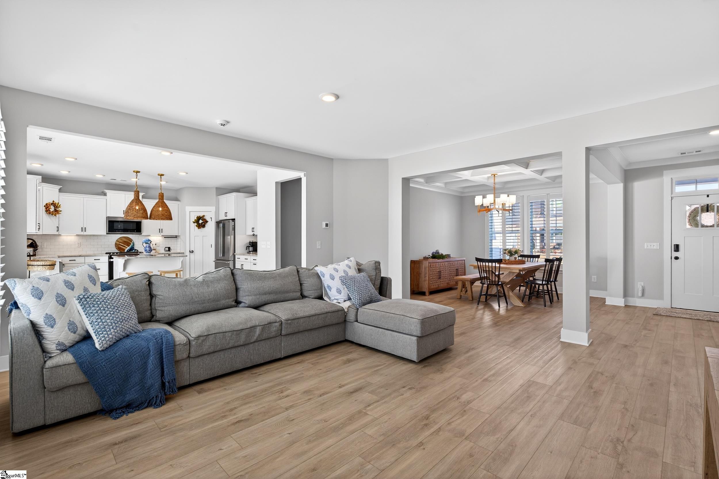 Built in 2023, this DRB Homes "Arlington" plan in Anderson Grant feels better than new with over $20,000 in upgrades that today's buyers value. A covered front porch welcomes you into a formal dining room with coffered ceilings, setting the tone for the thoughtful layout. The main level opens into a spacious great room that flows seamlessly to the covered rear porch, creating an easy indoor-outdoor connection for relaxing or entertaining. At the heart of the home, the kitchen shines with granite countertops, beautiful cabinetry, pantry, stainless-steel appliances, and a gas range, along with a breakfast area for everyday meals. A flex space just off the living area adds versatility—ideal for a home office, playroom, or second sitting room. Upstairs, a generous loft creates a second living zone, while the owner’s suite serves as a private retreat with double vanities, a walk-in closet, and a Roman-tiled shower with dual shower heads and a built-in seat. Two additional bedrooms, a full bath with double sinks, and a convenient upstairs laundry room complete the second level. Throughout the home, you’ll appreciate thoughtful finishes including tilt-out thermal windows paired with custom plantation shutters. Outside, enjoy a level, low-maintenance yard with a 6' white vinyl privacy fence and both covered front and rear porches—and the real standout is the setting: the HOA-owned green space behind the home creates a natural buffer, adding a premium sense of privacy and breathing room you don’t always find in newer neighborhoods. Anderson Grant residents also enjoy neighborhood amenities including a pool and pavilion, pickleball courts, playground, dog park, and fire-pit area. Conveniently located between downtown Greenville and downtown Spartanburg with quick access to Five Forks, Greer, I-26, and I-85, plus proximity to major Upstate employers.