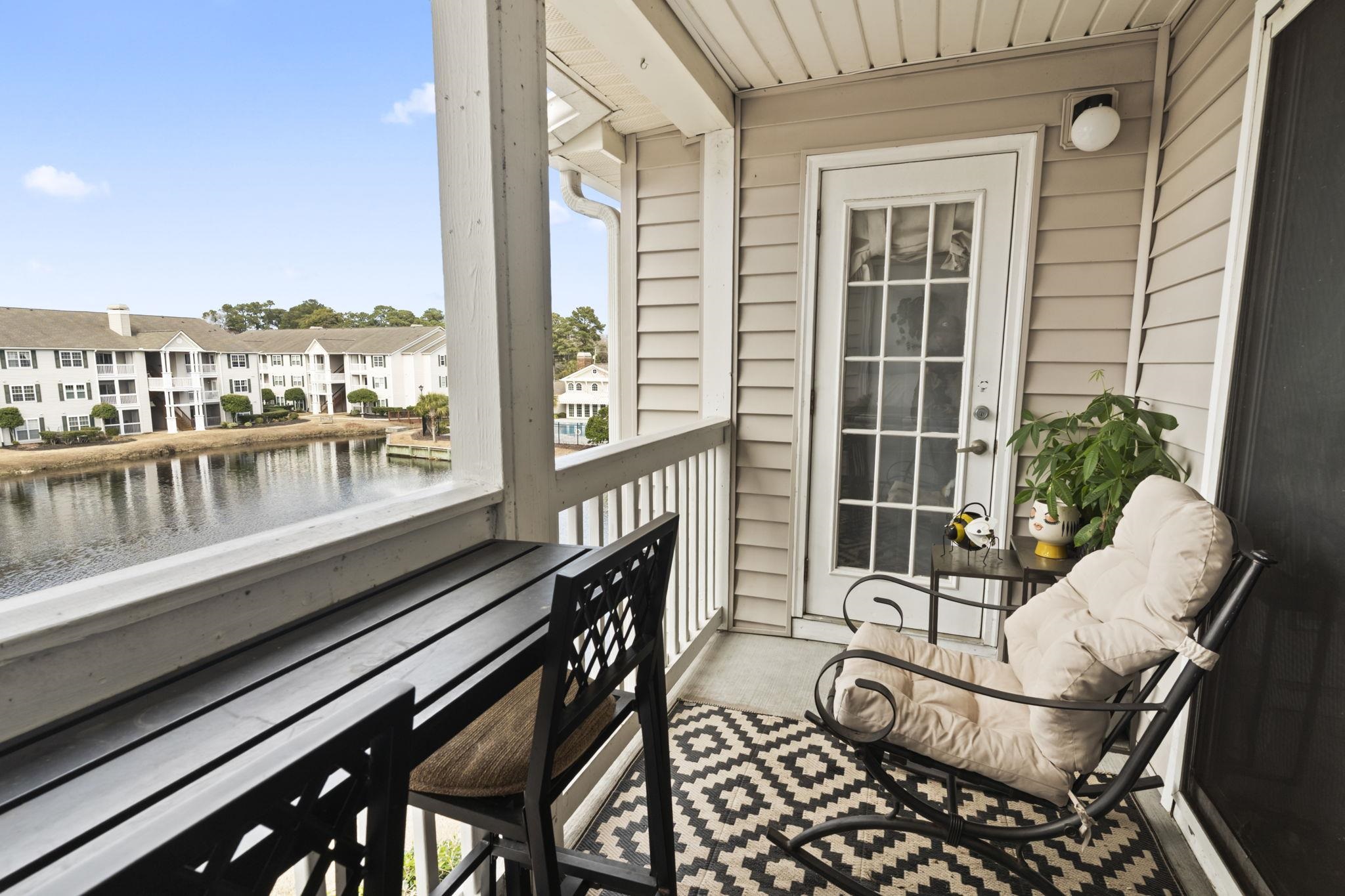 Top-floor private end unit in the gated community of Broadway Station! This spacious 2-bedroom, 2-bath condo offers stunning, unobstructed views of the pond and pool from the living room, private balcony, and both bedrooms. The open-concept floor plan is filled with natural light and features cathedral ceilings that create an airy, inviting feel. The dining area showcases elegant wainscoting, while the kitchen is equipped with newer stainless steel appliances and an extra large kitchen sink. Luxury vinyl plank flooring was installed in 2022, along with a new HVAC system and hot water heater, providing peace of mind for years to come. A newer washer and dryer are also included. This unit also features custom closet systems for optimal organization and storage, along with upgraded, spacious attic storage — a rare and valuable bonus in condo living. Ideally located in the heart of Myrtle Beach, you’re just a short walk to the ocean, shopping, dining, and entertainment. Relax in the evenings on your private balcony and enjoy peaceful sunset views overlooking the water. Broadway Station offers outstanding amenities including a community pool, BBQ area, fitness center, private car wash station, and a clubhouse with a full kitchen. The unit is conveniently located close to the entrance, pool, and waste disposal area. HOA dues cover insurance, water, sewer, landscaping, amenities, termite bond, security, and trash service. Private, centrally located, and move-in ready — this condo truly checks all the boxes!