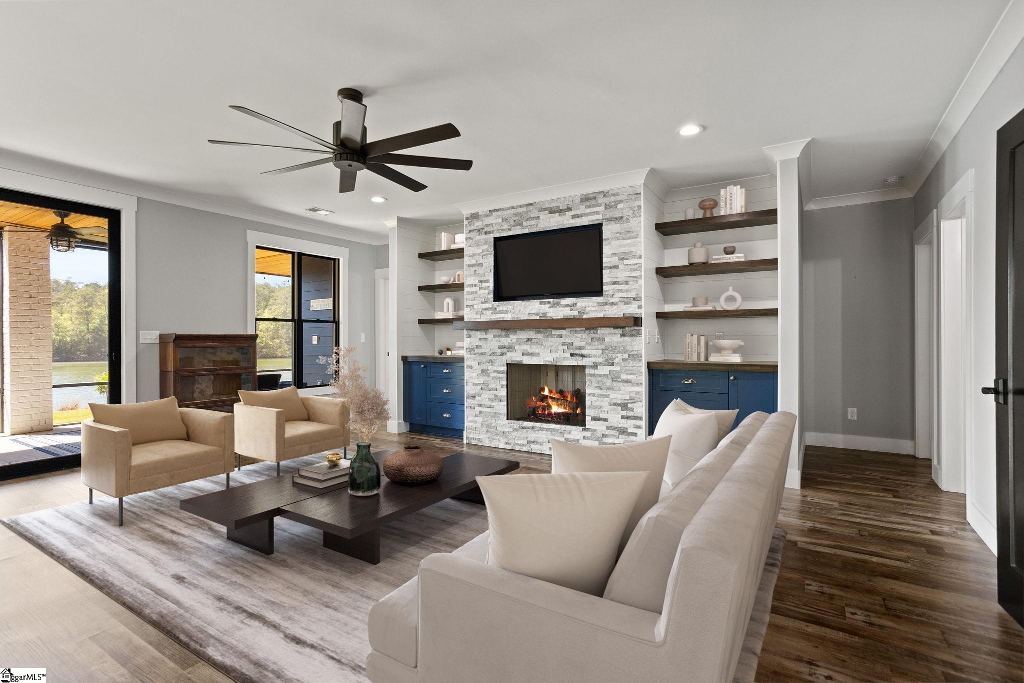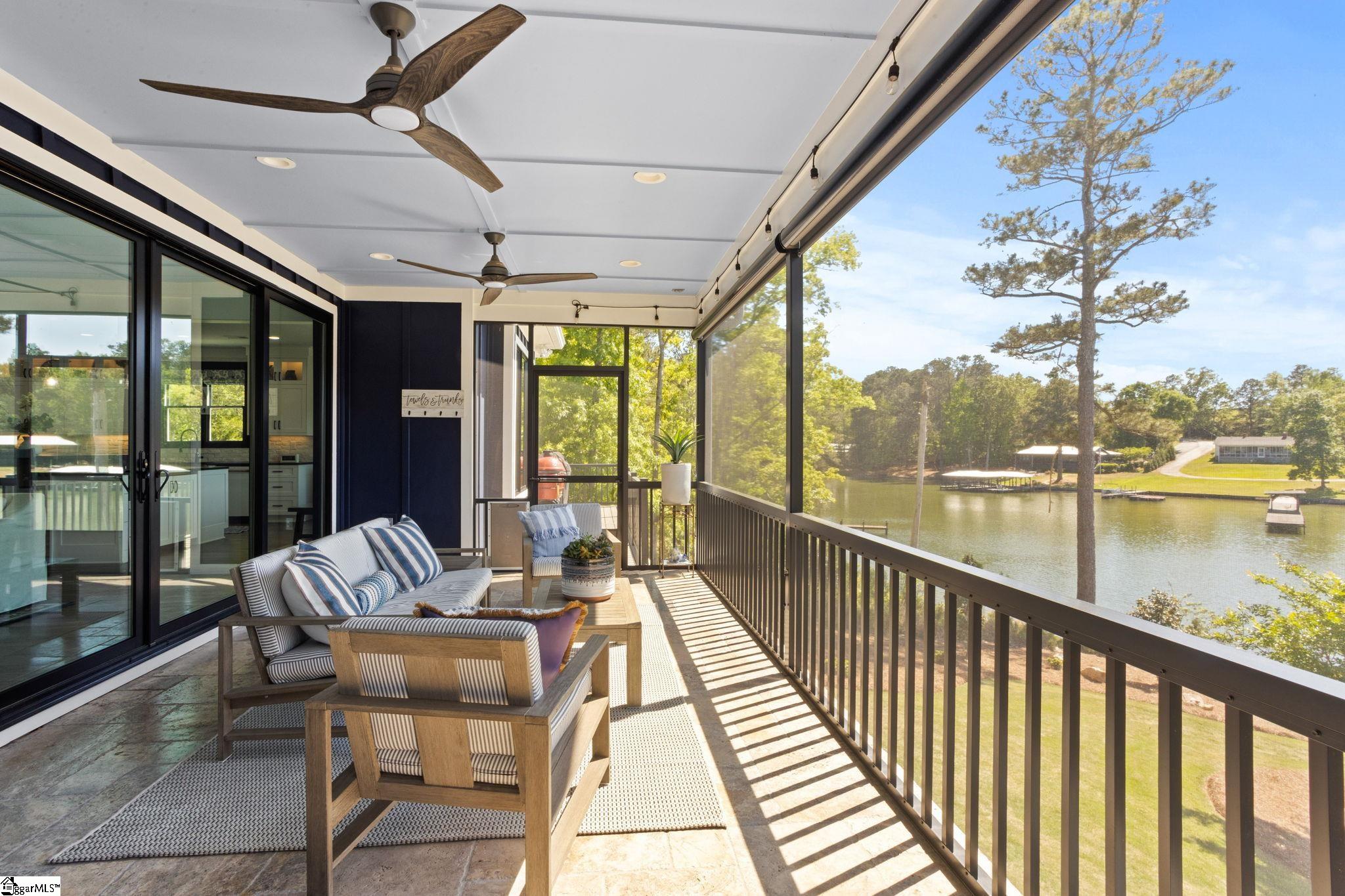 Rare MULTI-GENERATIONAL waterfront living on Lake Greenwood in the gated Retreat at Grand Harbor. Built in 2019, this custom Lake Greenwood waterfront home offers approx. 5,800 sq ft, 6 bed, 5.5 bath, and a full SECOND RESIDENCE on the terrace level with its own covered private entry, separate driveway, full kitchen, living room, oversized laundry room, and its own compact 1 car garage. Ideal for in law suite living, extended family, long term guests, or private guest quarters, this home delivers flexibility that is hard to find within the LUXURY LAKE AND GOLF LIFESTYLE of Grand Harbor, with access to a Davis Love III designed golf course, marina, clubhouse dining, tennis, fitness center, pickleball, pools, amenities, and an active social calendar. The main level is designed for both everyday living and entertaining, anchored by a beautifully appointed kitchen with full height custom cabinetry, illuminated glass display accents, an oversized island, integrated wine and beverage refrigeration concealed behind cabinet matched panels, Café appliances with custom brushed bronze hardware, a PROFESSIONAL GRADE WOLF GAS COOKTOP set into custom leathered granite with countertop mounted controls, and a hammered copper double farmhouse sink. The kitchen opens seamlessly to a spacious living room with soaring ceilings, a floor to ceiling painted brick fireplace, custom built ins, and large black framed windows that flood the space with natural light while drawing the eye toward the lake. From here, access flows easily to the screened porch and outdoor living spaces overlooking the water. The main level primary suite is equally impressive, offering water views, direct outdoor access, and custom his and hers walk in closets. The primary bath was designed to be a true focal point, centered around a freestanding SOAKING TUB WITH HAMMERED COPPER EXTERIOR and vintage inspired matte black fixtures. A walk in tile shower with pebble flooring and contrasting wall tile adds texture and depth, while dual vanities with vessel sinks, custom cabinetry, and designer lighting complete the space. On the terrace level, the second residence feels every bit as substantial and well appointed as the main home. Designed for multi generational living or private guest suite use, it includes a full kitchen centered around a large island with upgraded granite countertops, custom cabinetry with detailed molding, crown molding throughout, a spacious living area with a custom fireplace and built ins, its own mudroom entry, oversized laundry room, and two bedrooms. This is true separate living quarters within the home, not just additional basement space. Outdoor living is equally well executed with two oversized screened porches designed to maximize the lakefront setting. The main level porch features stone style tile flooring with ample space for dining and lounging, plus an adjoining sun and grilling deck that functions as a true extension of the home. The terrace level screened porch offers a more relaxed setting with tongue and groove ceilings and direct access to the backyard and waterfront. A private full sized floating dock with 8,000LB BOAT LIFT provides year round Lake Greenwood access, while the elevated architecturally finished seawall offers both shoreline protection and a refined edge to the waterfront. Positioned in a peaceful cove protected from main channel wake, this waterfront property is ideal for both relaxation and recreation. A dedicated office on the main level adds functional flexibility for remote work, while the spacious flex room above the garage offers ideal overflow space for a media room, bunk room, playroom, or home gym. Grand Harbor Social membership is mandatory $600/mo w/ the option of full golf membership of $1100/mo. $25,000 initiation fee has been paid & conveys w/ the sale. 24 hour notice and VOF required prior to showings. Call today!