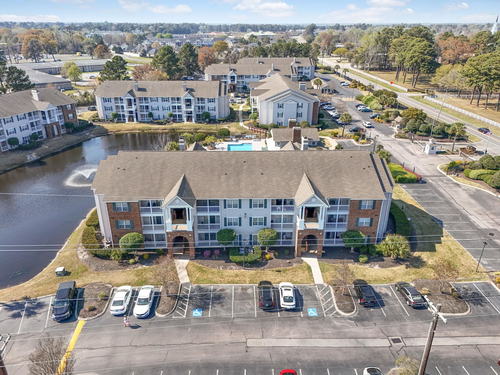 If you're searching for a top-floor, fully furnished condo in Myrtle Beach with water views, a private balcony, and a cozy fireplace, this one stands out. Located in the gated Broadway Station community between the Hwy 17s off 38th Ave, and less than a mile from the beach, this 2-bedroom, 2-bath condo offers low-maintenance coastal living with strong appeal as a primary home, vacation getaway, or investment property. Step inside and you're welcomed into a bright, open living space filled with natural light. The living room is centered around a fireplace focal point, creating a warm and inviting place to relax at the end of the day. The space flows easily into the dining area, making it ideal for both everyday living and hosting. Sliding glass doors lead out to the private balcony, where you can enjoy peaceful views overlooking the pond and community pool - perfect for morning coffee or unwinding in the evening. The kitchen sits just off the main living area and features stainless steel appliances, ample cabinet storage, and a functional layout that makes cooking simple and efficient. Just beyond, the split-bedroom floor plan offers both privacy and flexibility. The primary bedroom is tucked away and features its own access to the balcony, allowing you to wake up to soft light and calming water views. It also includes a walk-in closet and en-suite bath. The second bedroom and full bath are positioned on the opposite side of the condo, ideal for guests or a home office setup. Additional highlights include top-floor positioning for added privacy and quiet, in-unit laundry space, and a layout that feels both open and practical. Broadway Station is a gated community known for its resort-style amenities, including an outdoor pool with lake views, hot tub, clubhouse, fitness center, grilling areas, onsite trash pickup, and secure gated access. Living here means you're within walking distance to grocery stores, schools, and daily essentials, while also being just minutes from the beach, Broadway at the Beach, shopping, dining, and entertainment. Quick access to Hwy 17 makes commuting around Myrtle Beach easy and convenient. This is the kind of property buyers search for when they want a move-in ready condo with balcony views, top-floor privacy, a fireplace focal point, and close proximity to the beach and everything Myrtle Beach has to offer. Schedule your showing today. Measurements are not guaranteed. Buyer is responsible for verifying.
