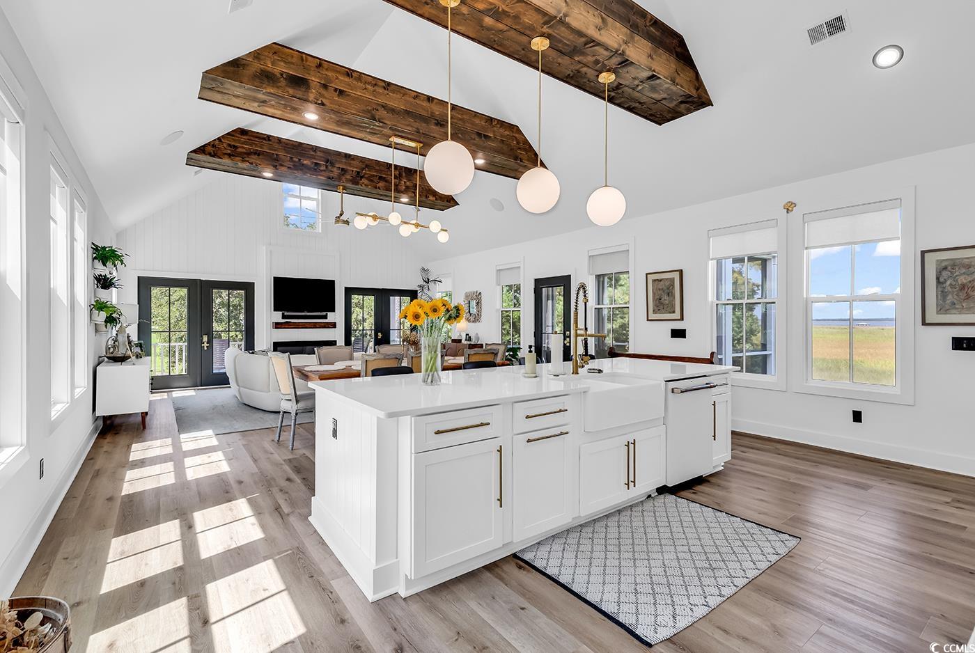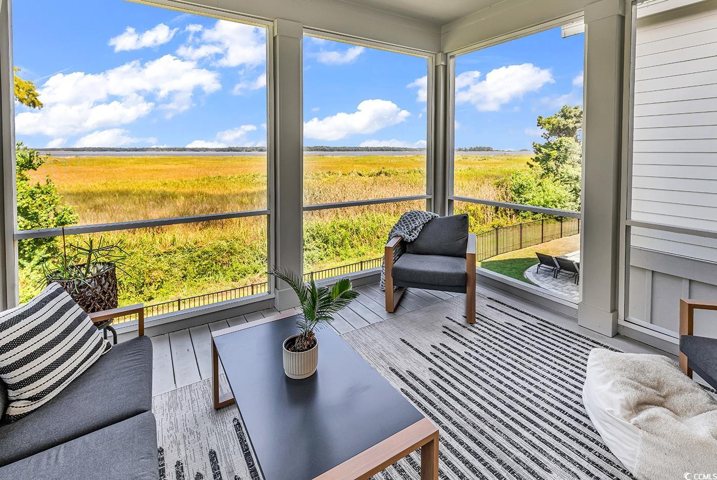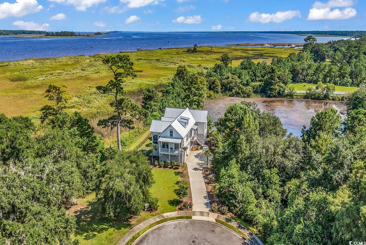 Panoramic Water Views from this home on Winyah Bay! This home constructed in 2023 is at the end of a cul-de-sac and is surrounded by Winyah Bay on one side and a serene pond on the other. Enter the open living room with vaulted ceilings and exposed beams to give it beautiful charm. The gourmet kitchen is a chef's dream with GE Cafe Appliances, walk-in pantry and beautiful tile backsplash. The primary bedroom has vaulted ceilings, shiplap wall and a massive 14x14 closet with island for storage. The primary bath has a beautiful tub and separate shower, two sinks and beautifully appointed. There also is a sitting area, laundry room and powder room on the main floor. The downstairs has two spacious bedrooms with walk-in closets and private bedrooms. Enjoy a morning coffee on your screened porch while watching the sun rise over the beautiful bay. There is another room that can be used as a bedroom or office and a separate sitting area/den. Outdoors will be your private oasis with an outdoor cooking/grilling area and pool with tanning ledge to watch the boats pass by! The outdoor area is surrounded with a wrought iron fence. Large garage with floor coating. South Island Plantation is a gated community on Winyah Bay the southern end of Georgetown. It is less than 60 miles to historic Charleston, SC and 40 miles to Myrtle Beach. Just a few miles to Georgetown's Front Street with boutique shopping and dining. This community has a beautiful clubhouse with a fitness center, an outdoor pool, community dock on Winyah Bay and many outdoor walking and biking trails!
