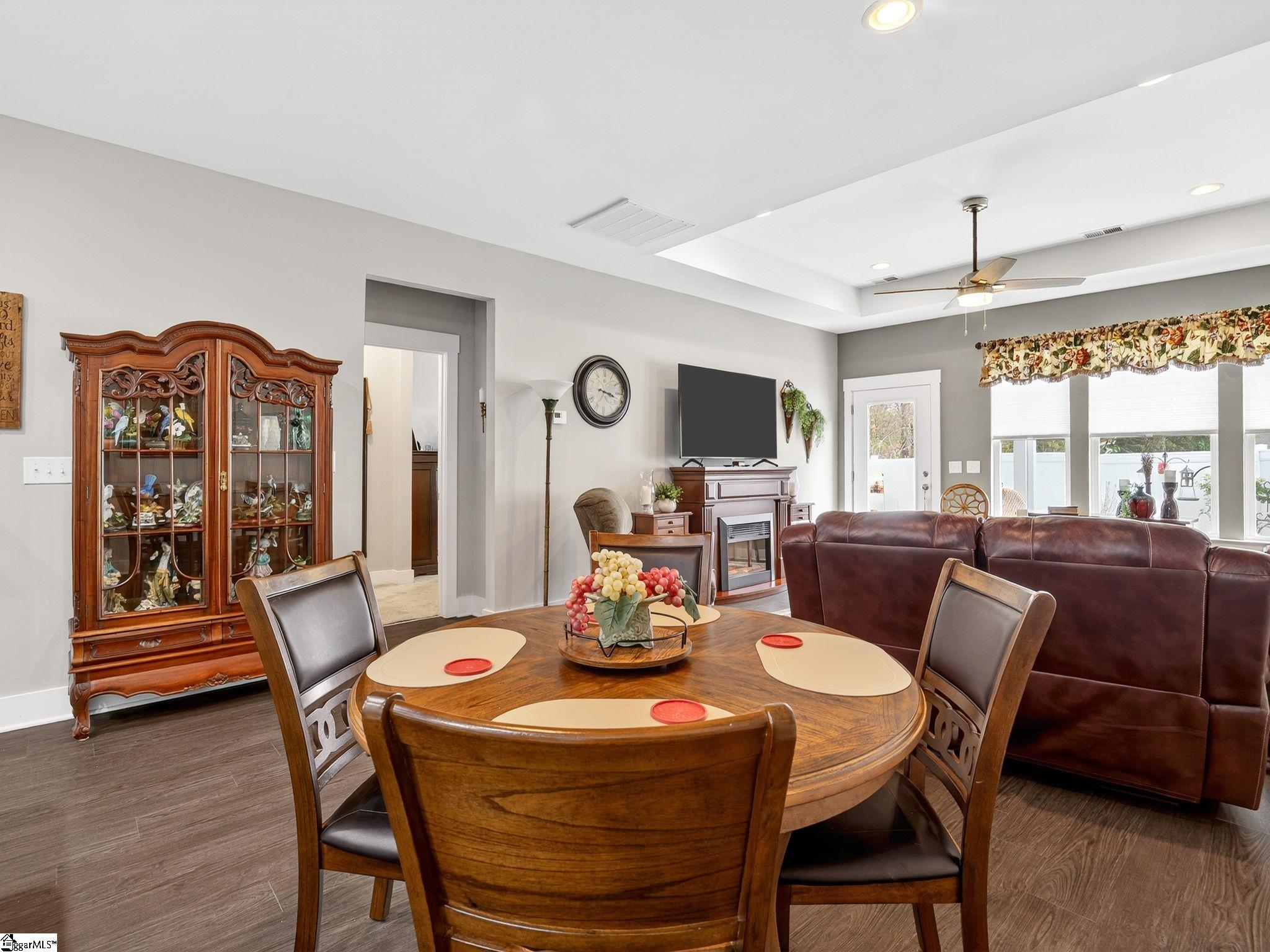 Welcome home to this beautifully maintained townhome at Brookside Villas! Step inside to an inviting foyer that opens to a spacious dining room - perfect for hosting gatherings and holiday events. The living areas feature attractive laminate flooring, complemented by fresh, washable paint and custom lighting. The kitchen offers solid surface countertops, stainless steel appliances (including a refrigerator that conveys), pull-out cabinet drawers and a stylish backsplash added in the past year. The living room boasts a tray ceiling with recessed lighting, creating a warm and comfortable atmosphere. Window shades will convey with the home and the fireplace is negotiable. Retreat to the warm, spacious and inviting primary suite. In 2025, the owners completed a bathroom renovation featuring a custom tiled shower with glass doors, updated LVP flooring added the addition of a linen cabinet. Upstairs you'll find a functional split floor plan. One side offers a large bedroom, full bathroom and a finished room over the garage - perfect for a bonus space or guest suite. On the opposite side, there is another generously sized bedroom along with a large storage closet that could easily serve as a craft room or office. Step back downstairs and enjoy outdoor living on the covered patio with ceiling fan. The fully fenced (vinyl) backyard provides privacy and a beautiful landscape with mature oak trees lining the rear of the property - bringing nature right to your doorstep! Exterior maintenance is provided by the HOA to include: grass cutting, mulching, irrigation and pest treatment. Home is so convenient to Taylors, Greer and downtown Greenville. The neighborhood is a rental restricted neighborhood. All units must be a primary residence for 2 years prior to becoming a rental property. Book your showing today for this show stopper on the Eastside!