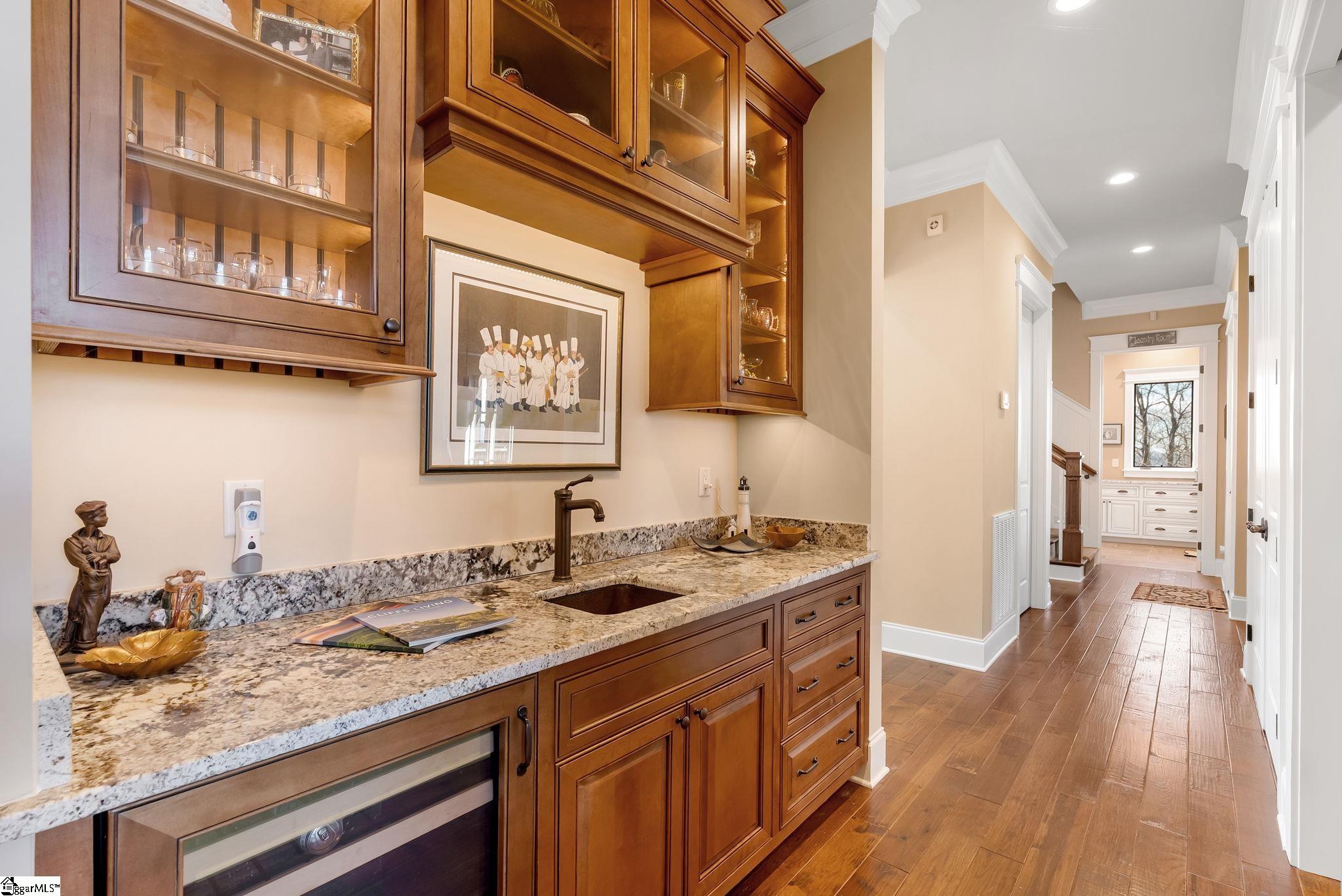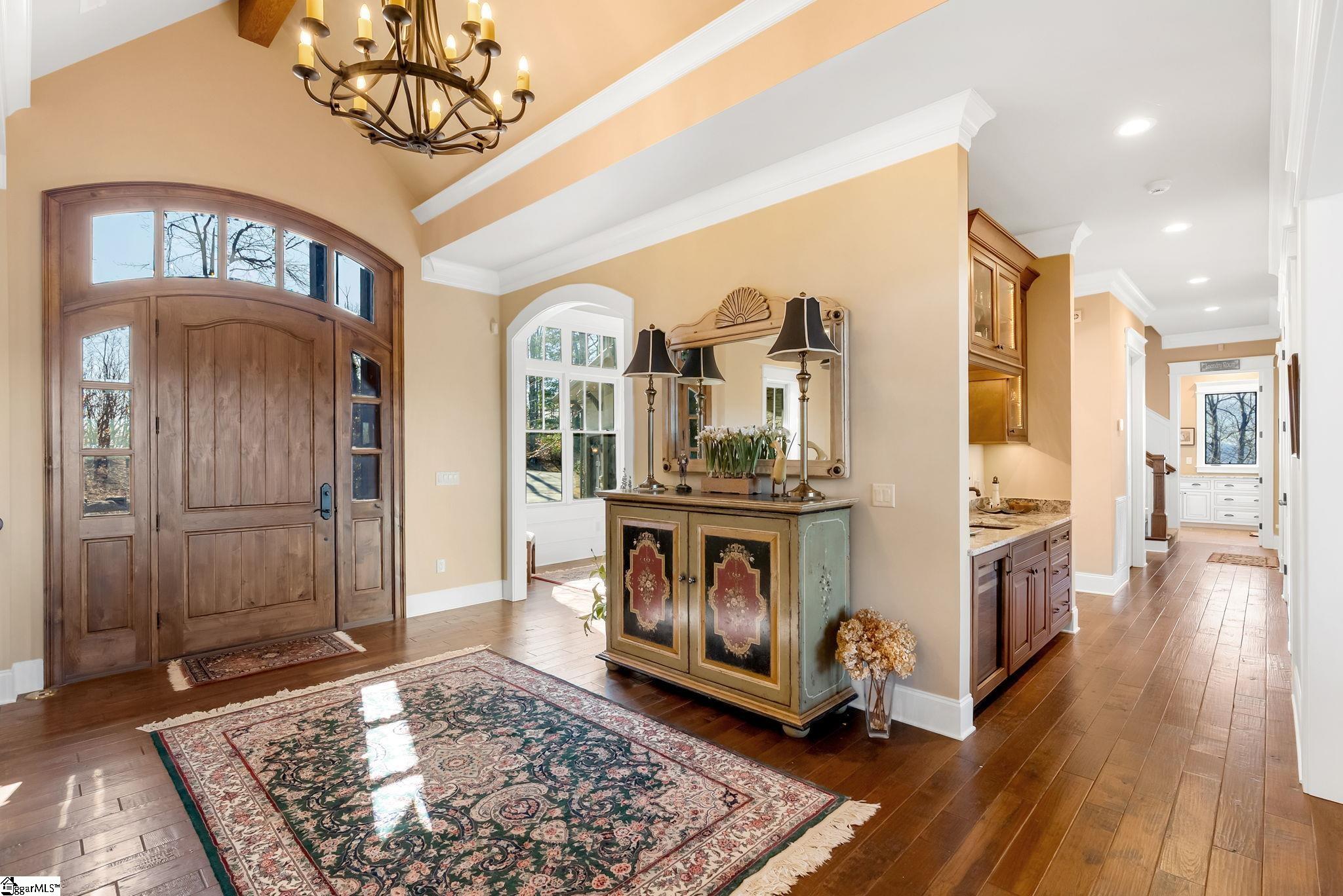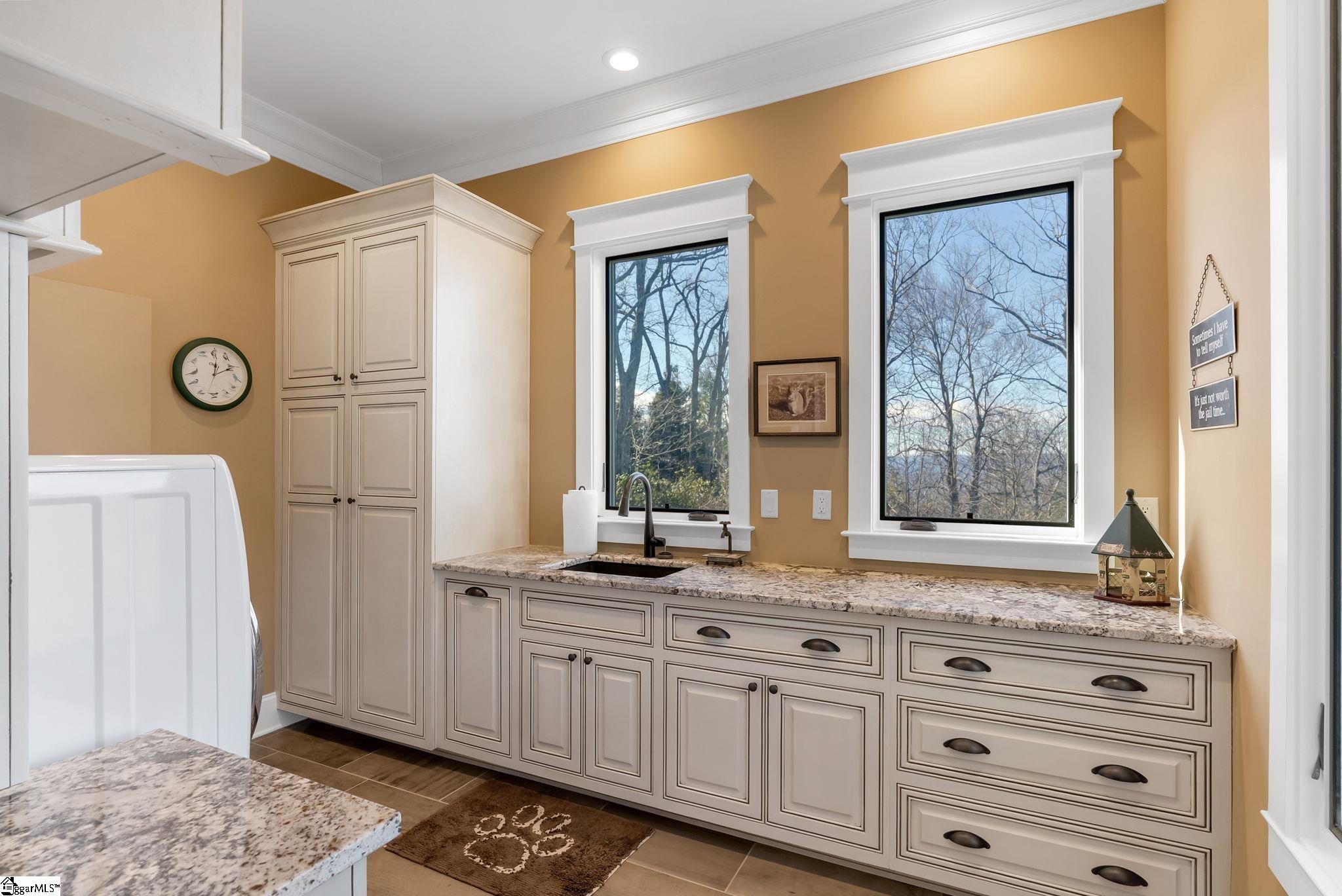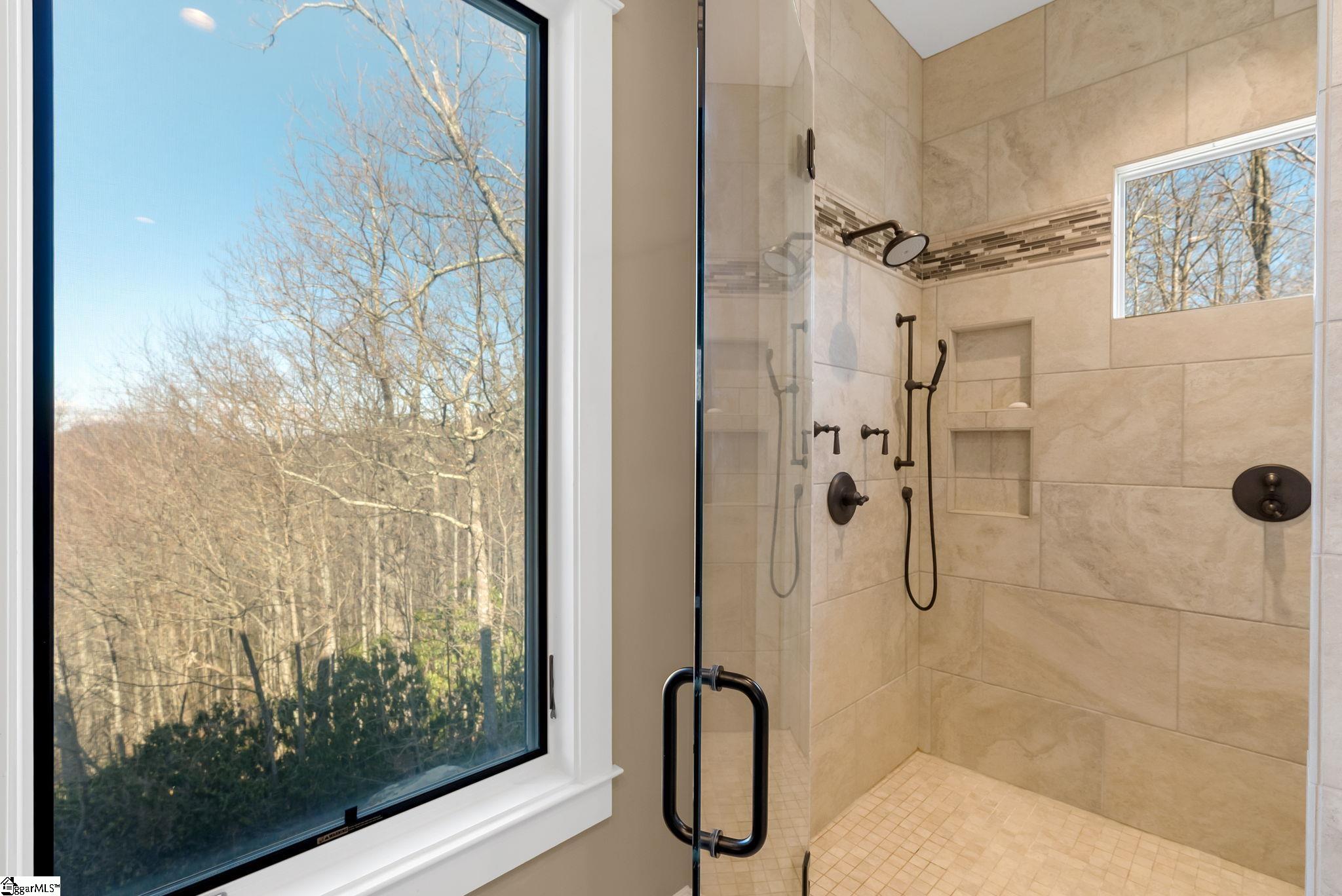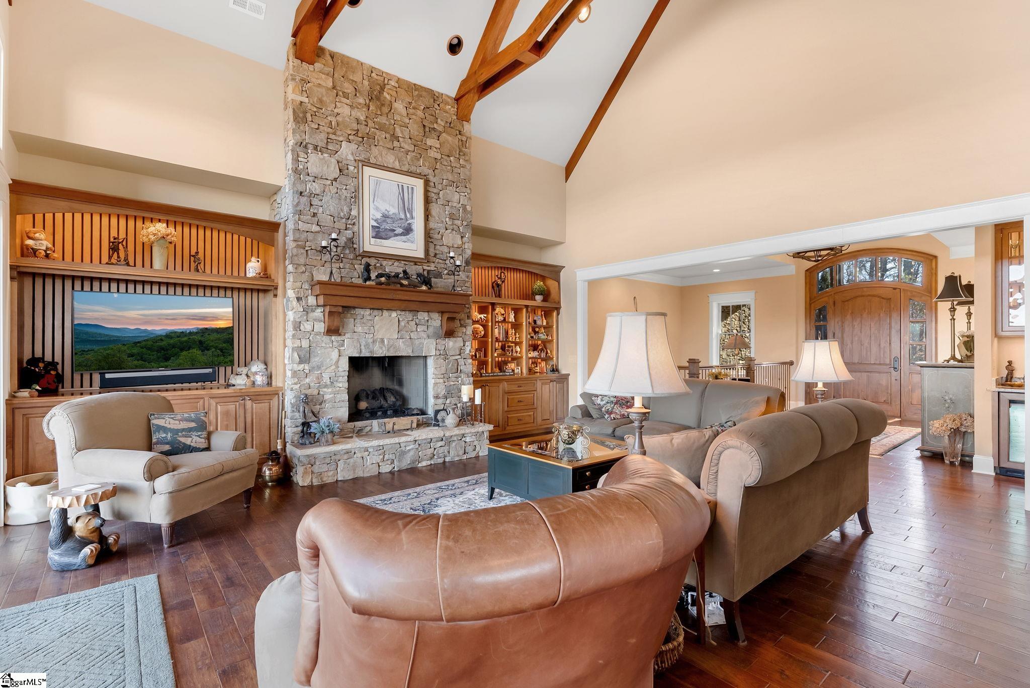 This mountain estate sits at over 2,600’ unfolding panoramic, long-range mountain views that stretch endlessly to the horizon. Tucked away on a private, non-through street, this home is oriented to capture north-to-northwest light and ever-changing vistas. Exterior porches and interior living spaces offer peaceful sanctuaries in an effortless blend of natural grandeur and sophisticated mountain living atop the cliffs at glassy. The welcoming entry and artfully landscaped grounds set the tone for this curated home, where rustic character is balanced with timeless traditional accents. Upon entering, you’re drawn to long-range mountain views that anchor the home’s design. The great room showcases vaulted, beam-accented ceilings and a dramatic floor-to-ceiling stone fireplace with custom wood mantel, creating a warm yet refined focal point. Illuminated built-in cabinetry adds both function and elegance, while the adjoining dining room and butler’s pantry wet bar offer an inviting setting for entertaining, gathering, and enjoying relaxed evenings at home. Just off the main living area, the gourmet kitchen and adjoining breakfast area are designed to satisfy both the passionate home chef and effortless everyday living. Custom Maple Ridge cabinetry anchors the space, blending warmth with refined craftsmanship. A generous island with bar seating invites connection, while luxury branded appliances, six-burner gas cooktop with electric griddle, and dedicated secondary prep sink support ambitious culinary pursuit. Framed by breathtaking mountain views, the kitchen becomes not only a workspace, but a welcoming gathering place where cooking, conversation, and comfort come together. Adjacent outdoor living spaces include covered porches, a stone fireplace, and expansive Trex decking, positioned to capture panoramic Blue Ridge Mountain views. The large walk-in pantry features custom shelving, while the laundry room boasts extensive built-ins, pantry cabinet, & work sink. The oversized, attached three-car garage provides exceptional functionality with built-in cabinetry, utility sink, front & rear service doors, & tiled dog bath. The primary suite exudes warmth and sophistication, featuring direct deck access and high windows that frame the stunning mountain views. The spa-inspired bath delivers exceptional comfort with dual vanities with built-in storage garages with interior outlets, walk-in shower, soaking tub, & generous walk-in closet with center double-sided drawer bank, built-in laundry hampers & ironing board cabinet. A full bath & additional bedroom, ideal for home office or studio, complete the main level. An upper level en-suite bonus room is suitable as guest room, home office, or flex space, & offers mountain views & privacy while maintaining convenient access to the main living areas below. Large attic spaces are accessible for additional storage. The lower level is designed as a welcoming guest retreat from which to enjoy views from the expansive deck and rear yard which features striking natural rock outcroppings. Along with two well-appointed bedrooms with baths en suite, this level features a spacious recreation room with custom built-ins and two unfinished areas for storage or future expansion. Additional features include JeldWen windows & exterior doors, Hickory hardwood floors through the main level, whole-house Generac generator, Carolina Closet organizers, recessed audio speakers and ceiling fans in most rooms, exterior cameras, and Control 4 home automation system with two keypads. This residence effortlessly combines superior craftsmanship, thoughtful design, and timeless elegance, framed by stunning layered mountain views, backing up to 18,000 acres of the Greenville Watershed. Experience the perfect harmony of mountain tranquility just minutes from the Glassy clubhouse & Glassy Chapel. A Club membership at The Cliffs is available for purchase with this property giving you access to all seven communities.