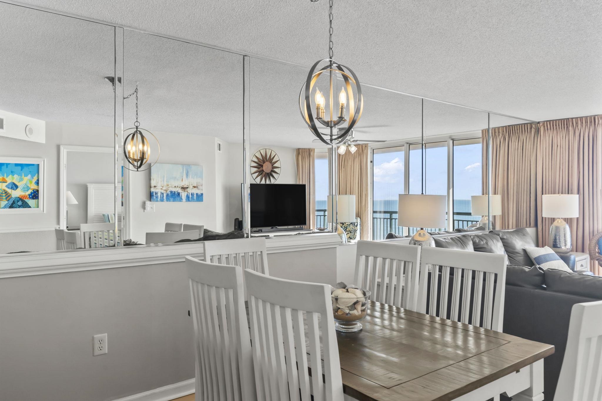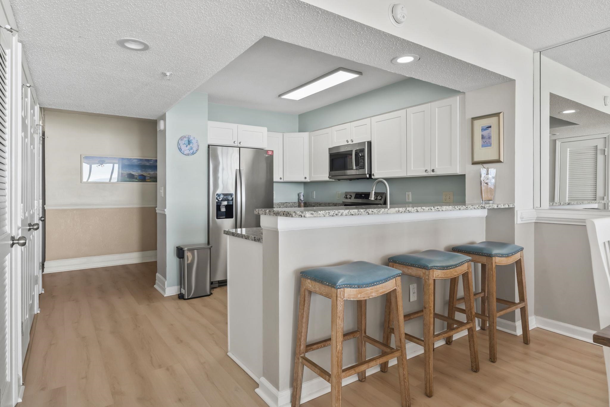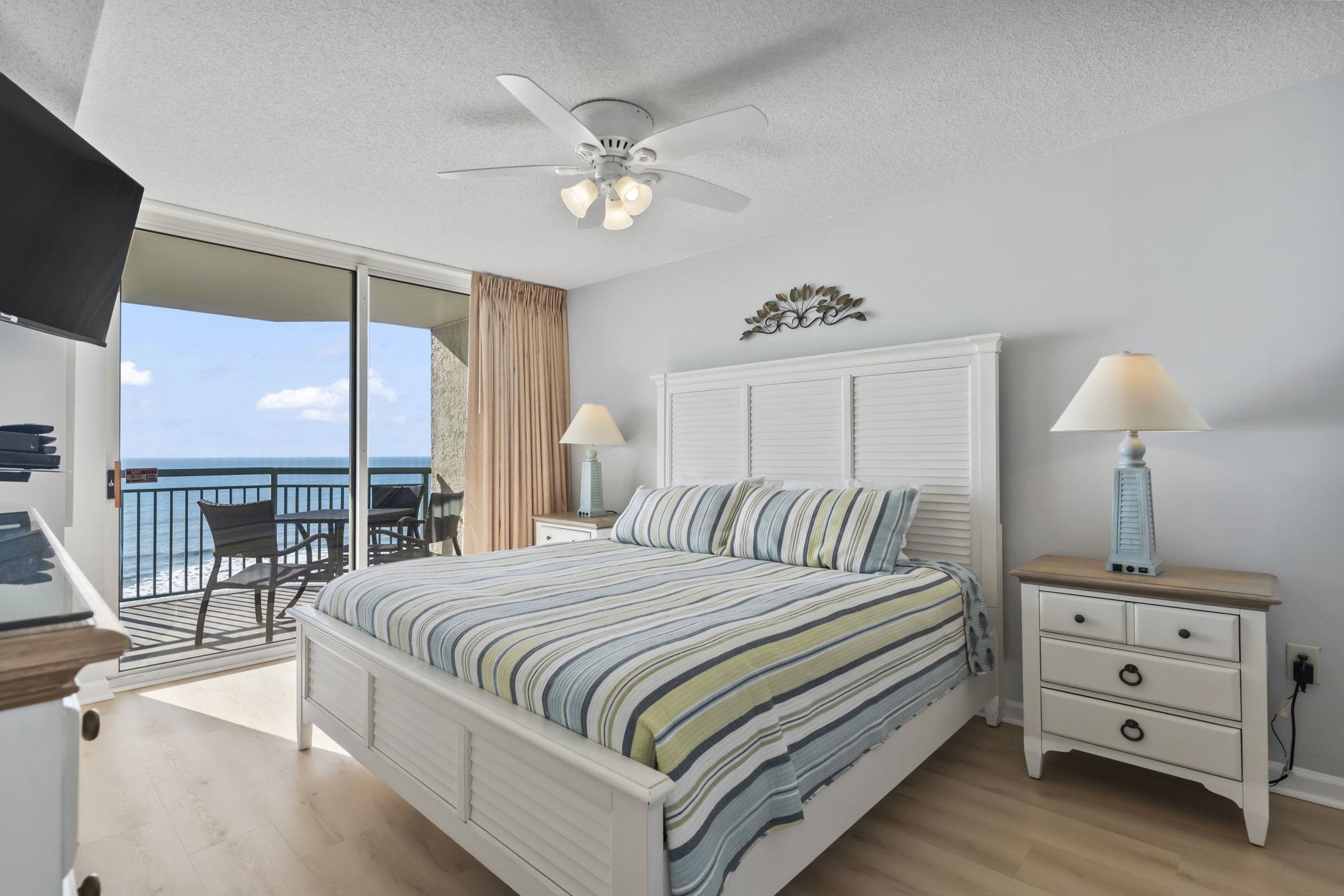 Welcome to your beautifully maintained fully furnished direct oceanfront 3-bedroom, 3-bath condo in the heart of North Myrtle Beach, where sweeping views of the Atlantic greet you the moment you step inside. Used only as a second home, this seventh-floor retreat offers the perfect blend of comfort, style, and coastal living. Enter into a bright, open floor plan enhanced by new LVP flooring throughout and tile in all bathrooms. The spacious kitchen, dining, and living areas flow seamlessly together, ideal for entertaining or simply relaxing while taking in the floor-to-ceiling ocean views. The kitchen is designed for cooks and beach lovers alike, featuring upgraded granite countertops, a new stainless-steel GE dishwasher, GE range, GE Profile microwave with a unique slide-out vent, new flat-panel lighting, and updated brushed-nickel hardware on the laundry and pantry doors. The refrigerator and washer/dryer are included for added convenience. This condo comes fully furnished, including bar stools for the counter-height breakfast bar, a complete dining set, and comfortable living room furniture with a pull-out sofa, flat-panel TV, and sound bar. Step onto the private balcony from the living room, or directly from the oceanfront primary bedroom and enjoy the sound of the waves and the endless horizon. The primary suite features two closets (one perfect as a locked owner’s closet), a jacuzzi tub, separate shower, double-sink vanity, and updated Moen faucets, hardware, and lighting. The second bedroom offers its own private bath, while the third bedroom includes two full beds. Just outside your front door, you’ll find a convenient private storage closet for beach chairs and gear. The HVAC was replaced in July 2024, giving you peace of mind for years to come. Resort-style amenities elevate the experience: an oceanfront pool, hot tub, kiddie pool, lazy river, comfortable loungers, fitness room, koi pond, bike rack, and four Green Egg grills for outdoor cooking. Enjoy private direct beach access, each unit has 2 unassigned parking spaces in the parking garage with a covered and climate-controlled walkway to the building. The HOA includes building insurance, internet/cable, water, trash, and pest control. From the lobby, the building offers three elevators. Whether you're searching for a primary residence, a vacation home, or a strong investment property, this condo checks every box. Located close to Barefoot Landing, top-rated restaurants, shopping, golf, and entertainment, it’s the perfect place to enjoy the best of North Myrtle Beach oceanfront living.