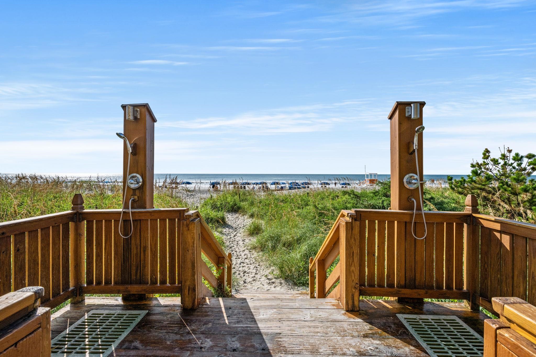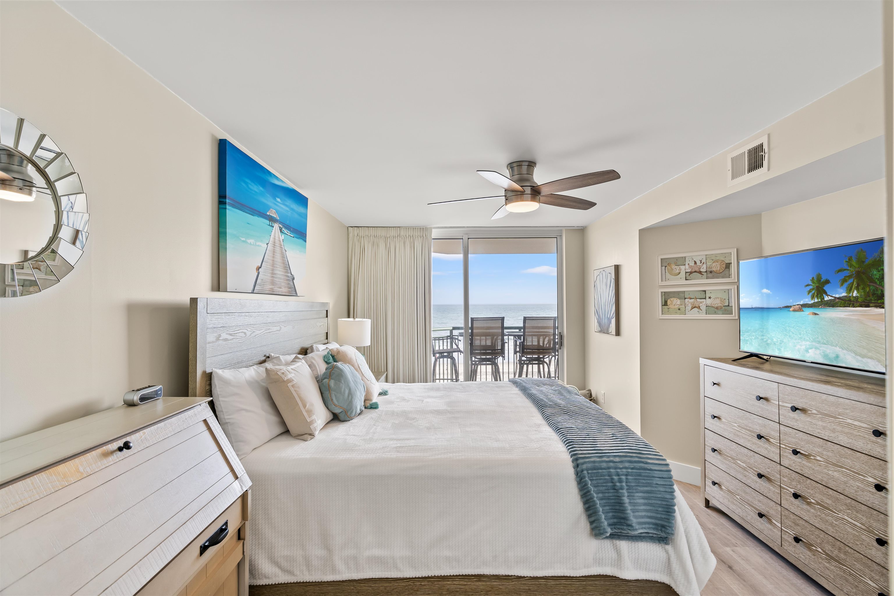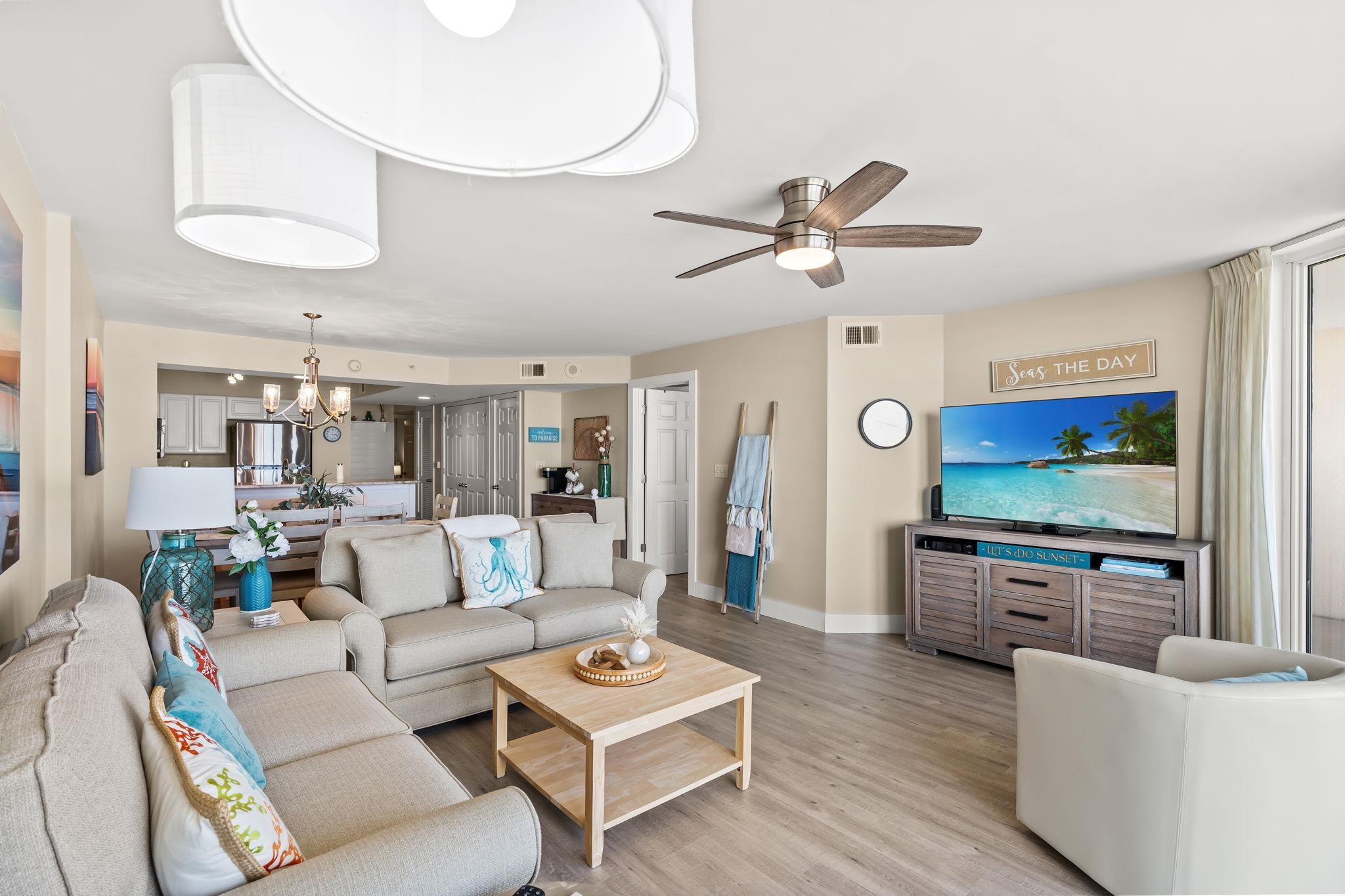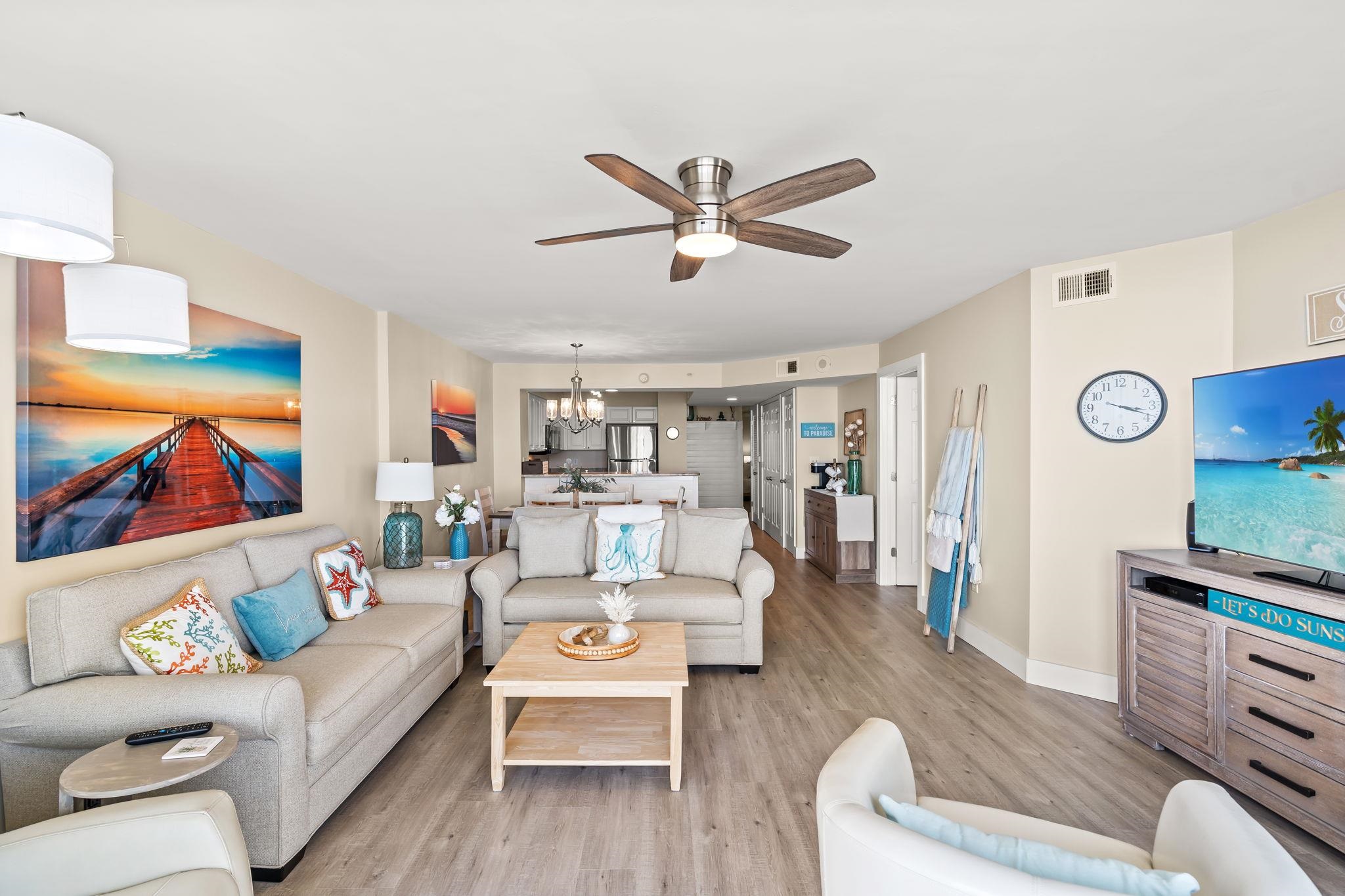EXCEPTIONAL oceanfront condo WITH EXPANSIVE VIEWS. Experience true coastal living in this beautifully maintained oceanfront condo, offering sweeping ocean views and a large private balcony perfect for alfresco dining and entertaining. The immaculate open floor plan showcases a modern kitchen with quartz countertops, stainless-steel appliances, engineered hardwood flooring, smooth ceilings, and fresh paint for a crisp, move-in–ready presentation. Recent upgrades include a fully remodeled third bathroom with stylish shiplap accents, echoed on the entry wall and breakfast bar to create a modern coastal flair. The primary bedroom features a walk-in closet, linen closet, and an ensuite bath complete with a jetted tub, separate shower, and double-sink quartz vanity. All furnishings, ceiling fans, and baseboards were replaced during the Seller’s ownership, giving the unit a like-new feel. Washer and dryer included. All furnishings and décor convey. Outside storage closet included. Trane HVAC with Wi-Fi thermostat installed in 2022. Resort-style amenities elevate the experience with a pool, lazy river, hot tub, beach access with showers, fitness center, and multiple grilling stations featuring four Big Green Eggs. A spacious parking deck connects via a climate-controlled over-street walkway for added convenience. This low-maintenance condo, finished with contemporary touches and thoughtful upgrades, is ideal as a primary residence, seasonal retreat, or investment property.