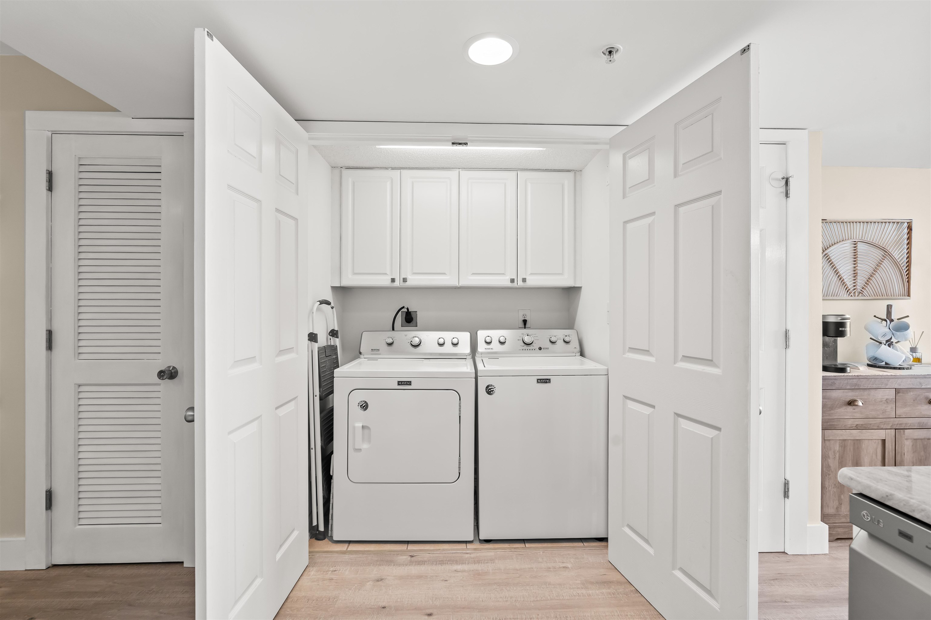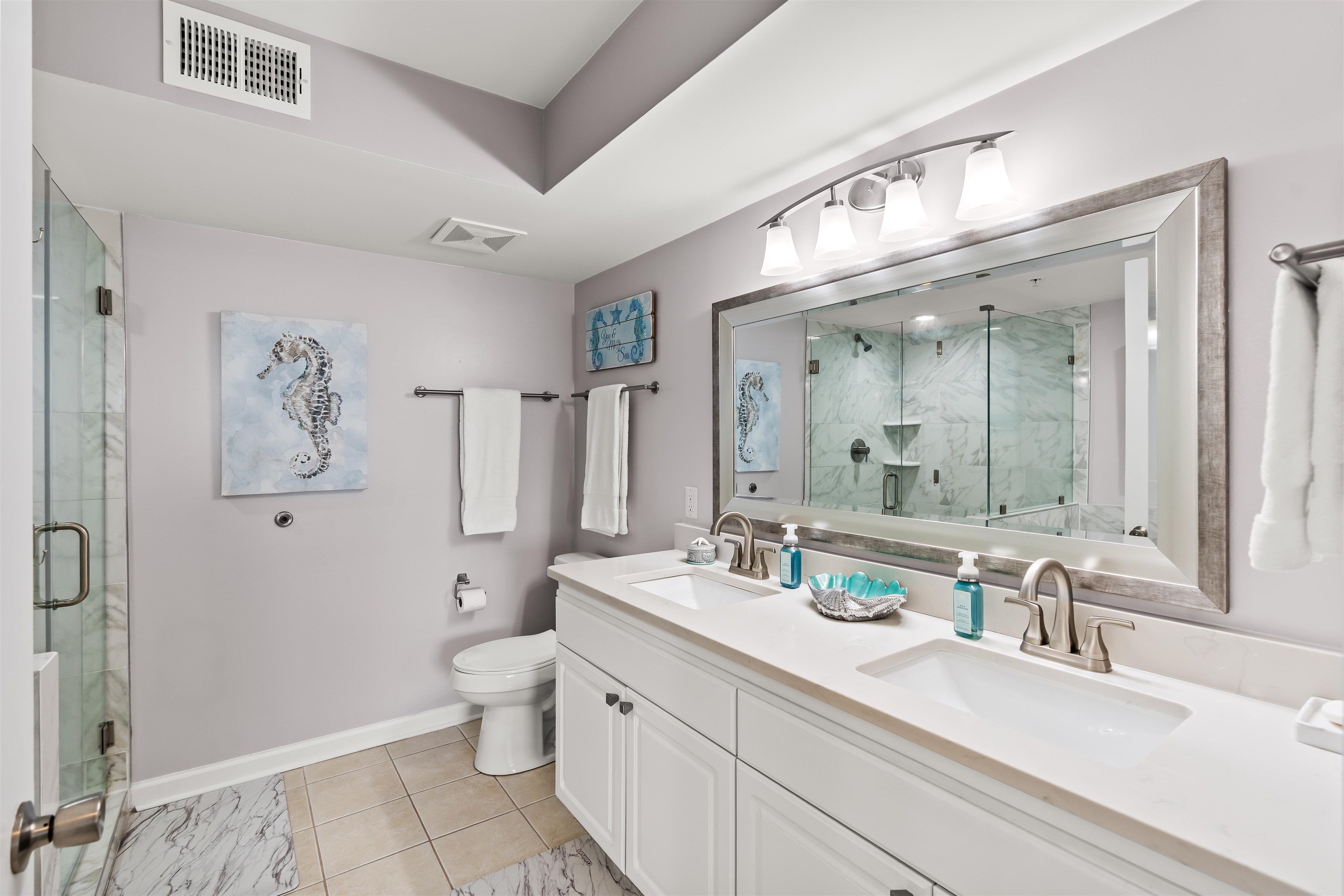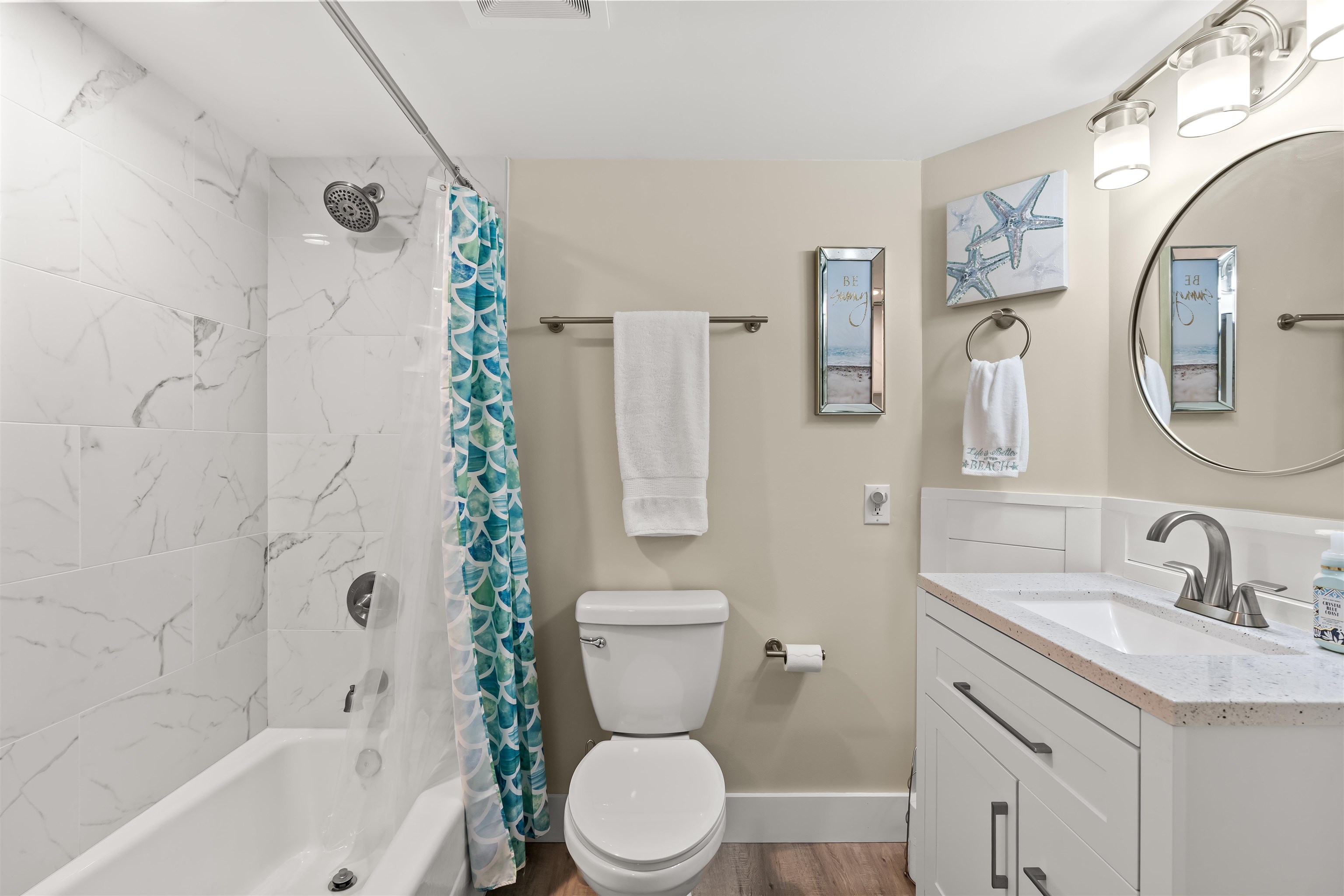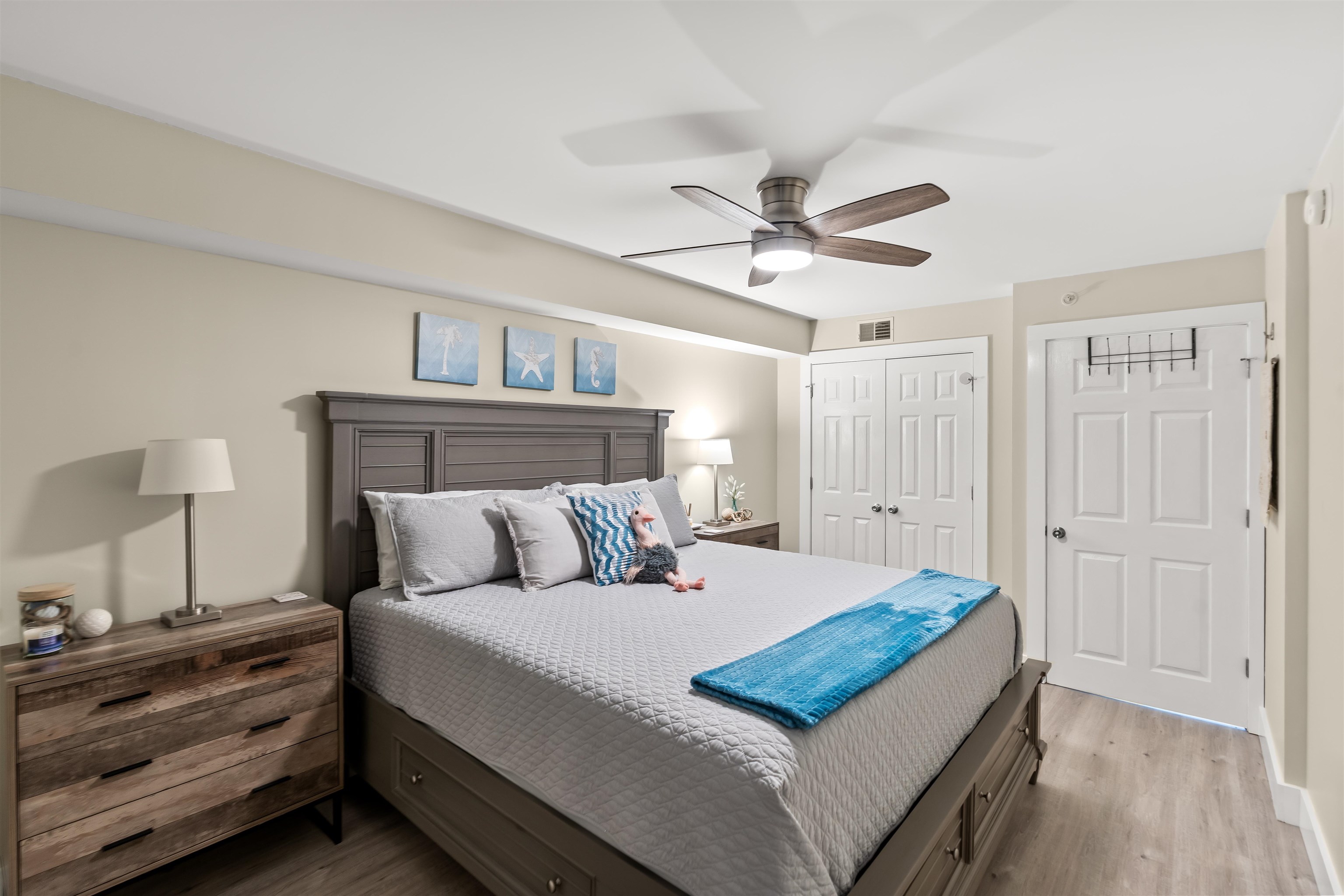EXCEPTIONAL oceanfront condo WITH EXPANSIVE VIEWS. Experience true coastal living in this beautifully maintained oceanfront condo, offering sweeping ocean views and a large private balcony perfect for alfresco dining and entertaining. The immaculate open floor plan showcases a modern kitchen with quartz countertops, stainless-steel appliances, engineered hardwood flooring, smooth ceilings, and fresh paint for a crisp, move-in–ready presentation. Recent upgrades include a fully remodeled third bathroom with stylish shiplap accents, echoed on the entry wall and breakfast bar to create a modern coastal flair. The primary bedroom features a walk-in closet, linen closet, and an ensuite bath complete with a jetted tub, separate shower, and double-sink quartz vanity. All furnishings, ceiling fans, and baseboards were replaced during the Seller’s ownership, giving the unit a like-new feel. Washer and dryer included. All furnishings and décor convey. Outside storage closet included. Trane HVAC with Wi-Fi thermostat installed in 2022. Resort-style amenities elevate the experience with a pool, lazy river, hot tub, beach access with showers, fitness center, and multiple grilling stations featuring four Big Green Eggs. A spacious parking deck connects via a climate-controlled over-street walkway for added convenience. This low-maintenance condo, finished with contemporary touches and thoughtful upgrades, is ideal as a primary residence, seasonal retreat, or investment property.