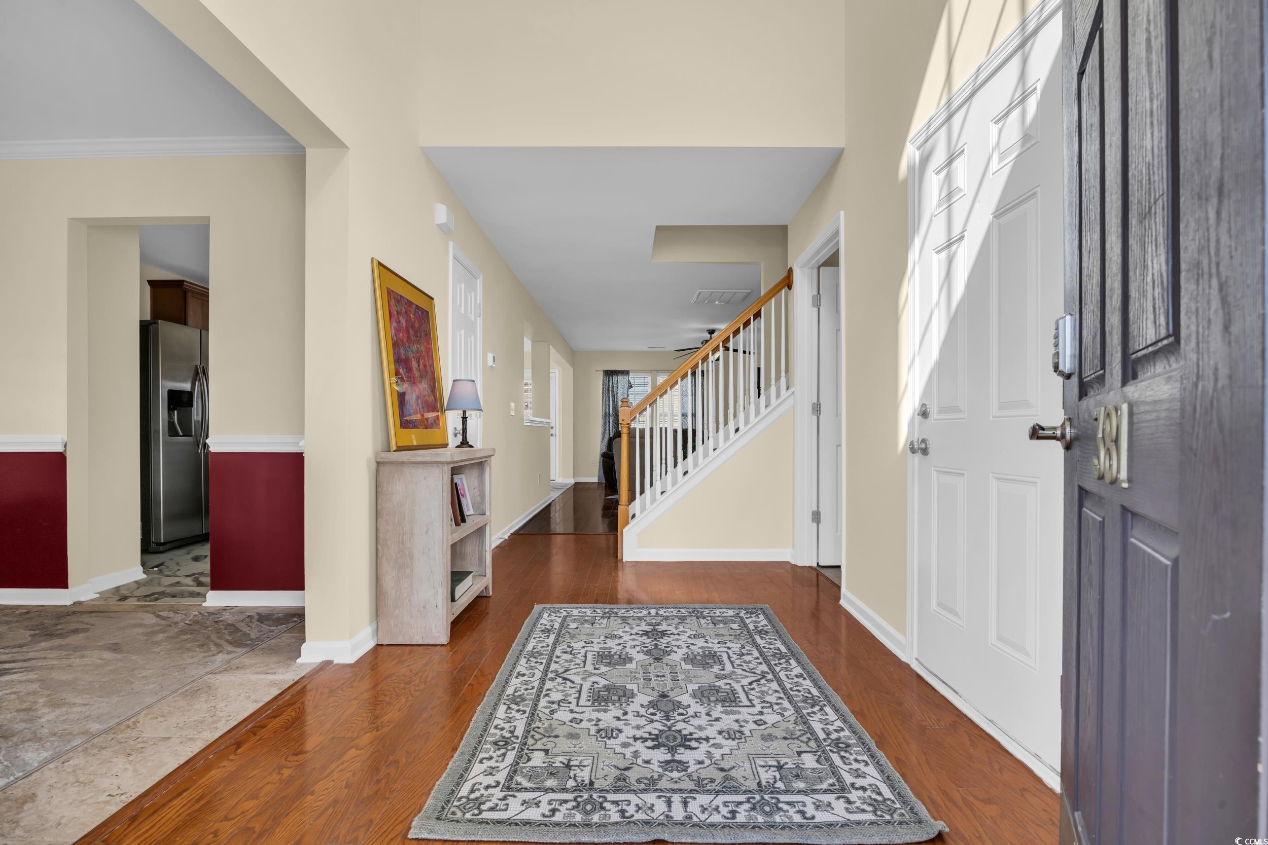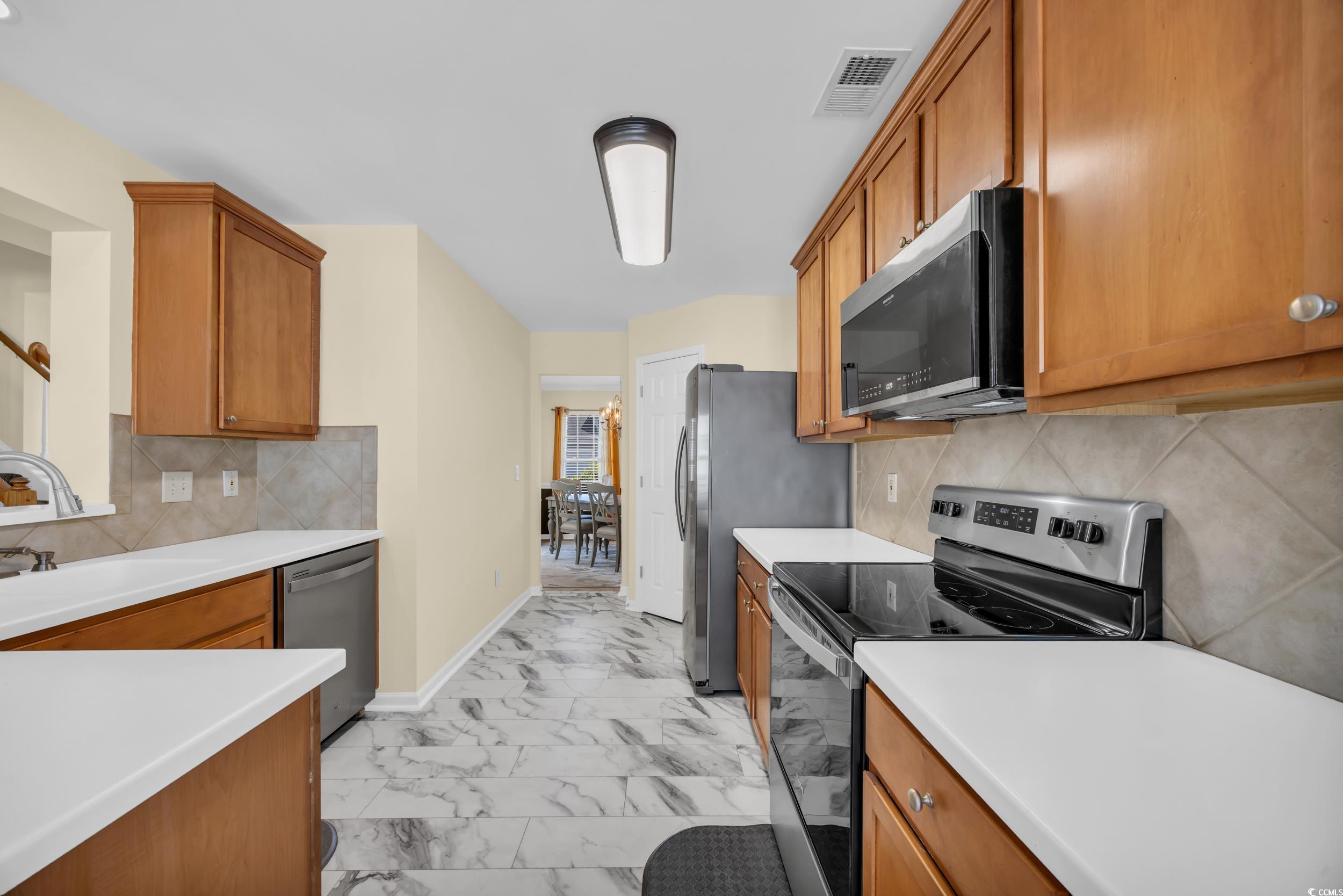 Welcome to 381 Winslow Avenue, a spacious 4-bedroom home located in the desirable Brighton Woods subdivision of Myrtle Beach. Zoned for the highly regarded St. James school district, this home offers both comfort and convenience. The primary suite is situated on the main level and features an en-suite bath with a garden tub, separate shower, and a generous walk-in closet. Also on the first floor, you'll find a half bath, a formal dining room perfect for holiday gatherings, and a well-appointed kitchen with stainless steel appliances, solid surface countertops, and a full washer and dryer included. Upstairs, three additional bedrooms and a versatile loft provide an ideal space for movie nights, game time, or simply relaxing with friends and family. Step outside to enjoy an oversized patio and fully fenced backyard, perfect for entertaining, grilling, or soaking up the sun. A two-car garage completes the homes practical features. Don't miss your chance to live just minutes from the beach, shopping, and dining in this inviting Myrtle Beach community.
