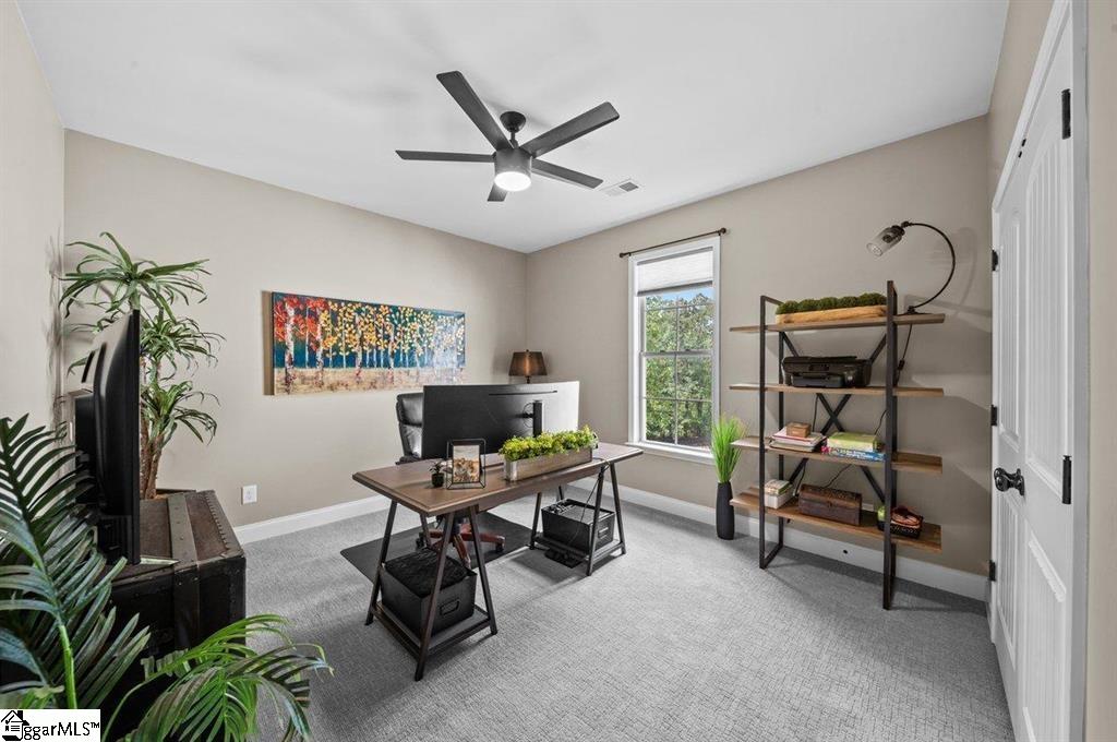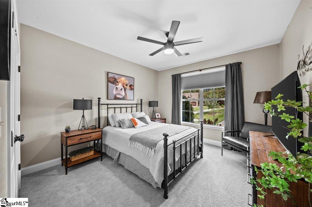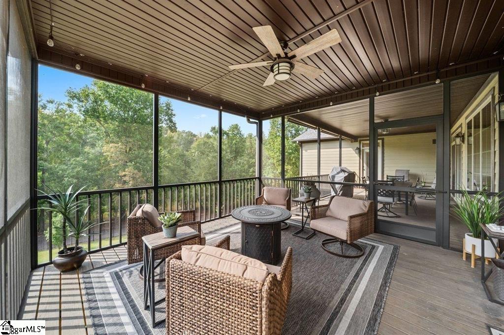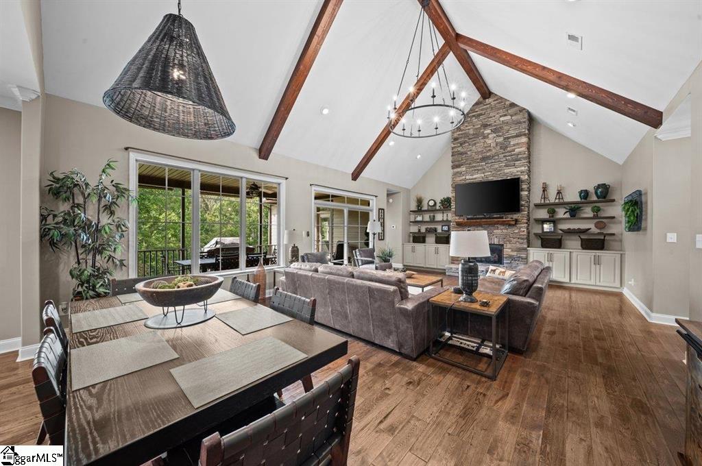 Spring is here and you'll love 383 Island Green Lane, Inman SC — a stunning custom-built home nestled in the prestigious Woodfin Ridge Golf Course community. Perfectly situated at the end of a quiet cul-de-sac with no through traffic, this exceptional property offers peace, privacy, and beautiful water views of Lake Bowen Reservoir right from your own backyard. This spacious residence features 5bedrooms, 4.5bathrooms, and a finished basement, combining luxury, functionality, and thoughtful design across every level. As you step through the foyer, you’re greeted by an inviting family room highlighted by a stone gas-log fireplace, custom built-ins, and soaring ceilings with exposed wooden beams. The open-concept layout flows seamlessly into a gourmet kitchen designed for entertaining, complete with a large island, quartzite countertops, custom cabinetry, gas range, tile backsplash, and under-cabinet lighting A screened-in porch just off the breakfast area offers the perfect spot for morning coffee while watching hummingbirds, and the main-level owner’s suite is a true retreat with a spa-inspired bath featuring a tiled shower, oversized jetted tub, dual vanities, and two walk-in closets. Two additional guest bedrooms and a full bath complete the main level, while upstairs you’ll find a guest suite with a bathroom and walk-in tile shower. The finished basement expands the home’s living space with a versatile rec room, wet bar/kitchenette, additional bedroom, and full bath —ideal for guests or multi-generational living. There’s also 1200 sq. ft. of unfinished basement space with a workshop, storage, and a roll-up door for easy access to lawn equipment or a golf cart. Outdoor living is at its finest here, with multiple covered porches and entertaining areas on both levels — perfect for grilling, relaxing by the outdoor stone fireplace, or simply taking in the peaceful water views. A cleared path down to the water’s edge offers a quiet place to fish or unwind by the stocked lake. Additional upgrades make this home truly move-in ready, including a new 5-ton HVAC system, renovated laundry room with new cabinets and counters, fresh carpet, new backyard sod and fencing, and an irrigation system. Did I mention a Generac generator?! Located just minutes from the golf clubhouse, restaurant, pool, tennis courts, and playground, and close to shopping, schools, and I-26 for easy commuting, this home truly has it all — space, luxury, views, and a lifestyle you’ll love.