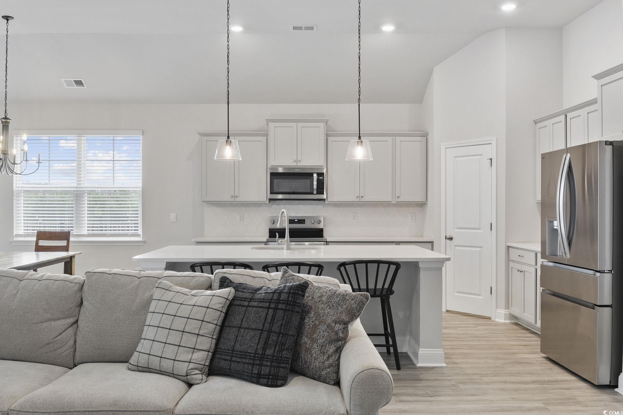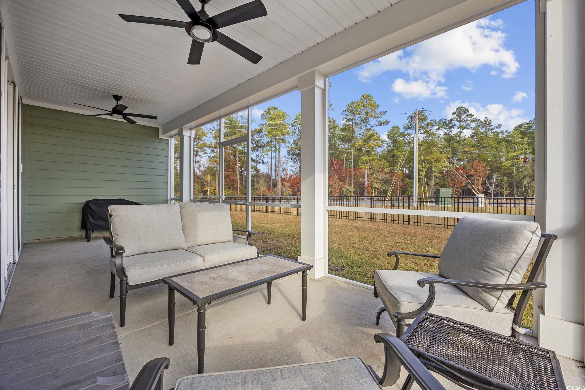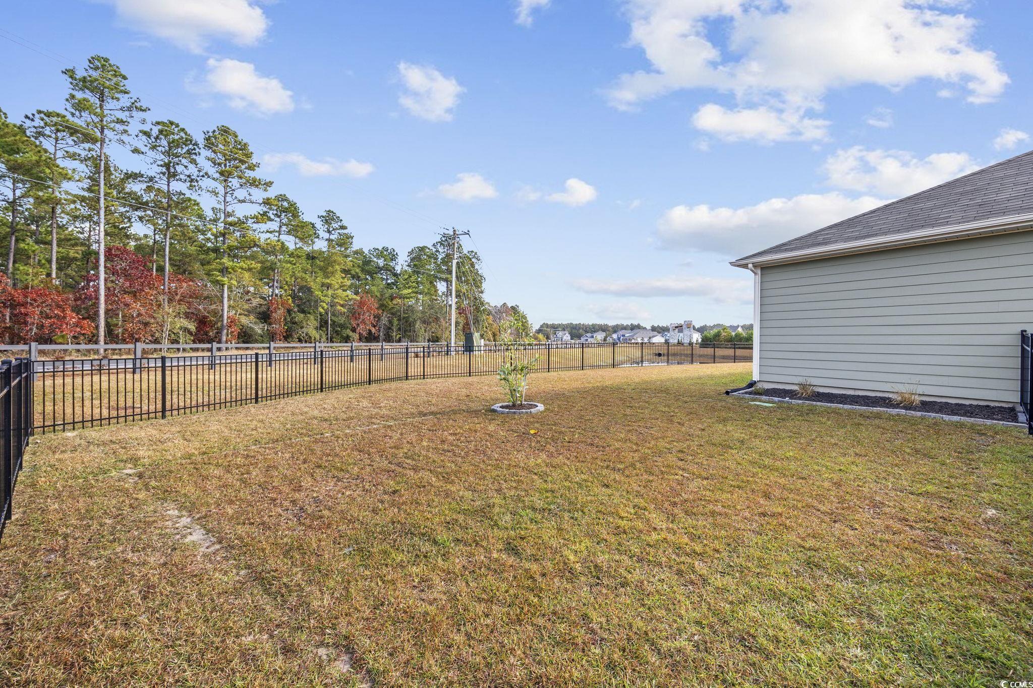 Better than new! This exceptional home showcases the highly desired Litchfield floor plan in Auberon Woods, offering all the benefits of new construction without the wait AND with upgrades you won’t find in a standard build. Step into an impressive open-concept living area featuring high ceilings, abundant natural light, and a split-bedroom layout that provides both comfort and privacy. The kitchen stands out with granite countertops, a spacious island, stainless steel appliances, glass island pendants, and blinds that were installed as part of the original purchase. Barstools at the breakfast bar convey. The dining room chandelier adds an elegant touch, while all four bedrooms are equipped with lighted ceiling fans for year-round comfort. Enjoy two additional lighted ceiling fans on the screened-in back porch, leading out to a beautifully enhanced backyard complete with fresh landscaping, new bushes across the property, a striking palmetto palm, and large New England river rock. The exterior also includes a black aluminum fence and a Hunter five-zone irrigation system. Modern comforts extend to an oversized LG stainless steel refrigerator, complete with a bottom freezer and a handy snack drawer. In the laundry room is a GE Profile washer and dryer that are only three months old and a secondary refrigerator in the garage. With its thoughtful upgrades, stylish finishes, and meticulous care, this home truly delivers a better-than-new living experience in one of the area’s most desirable communities.