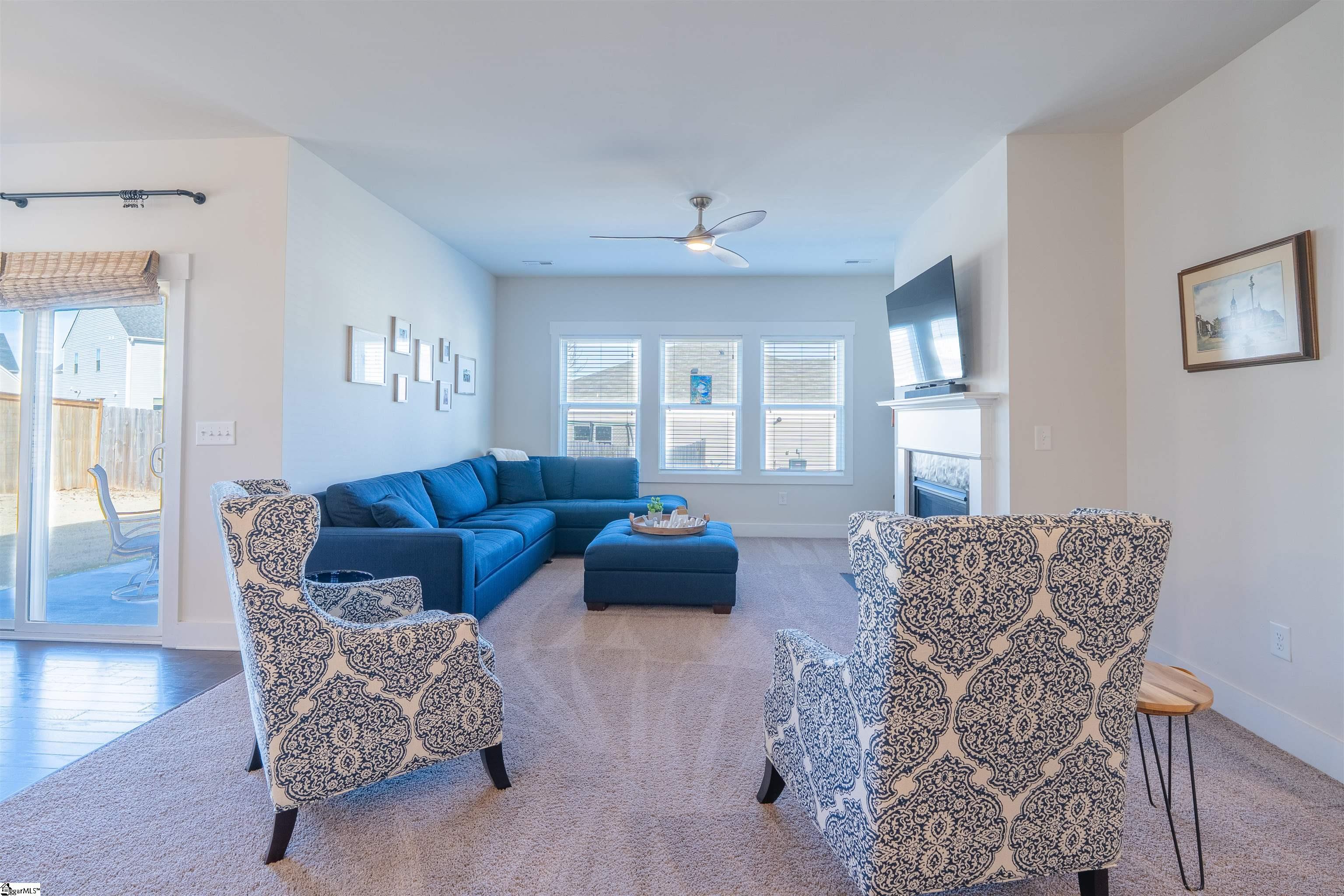 Beautifully designed one-level home on a desirable corner lot in a prime Simpsonville location, zoned for highly sought-after Fountain Inn schools. This thoughtfully laid-out residence offers 4 bedrooms and 3 full baths, with an open-concept living, kitchen, and breakfast dining area ideal for both everyday living and entertaining. The foyer, kitchen, and breakfast area feature engineered hardwood floors, while the living area is anchored by a cozy gas log fireplace. The kitchen showcases walnut-colored cabinetry, granite countertops, stainless steel appliances including a gas slide-in range, over-the-range microwave, and dishwasher, along with a statement island wrapped in shiplap. A built-in wine/bar cabinet and modern farmhouse glass pendant lighting complete the space with style and function. The spacious primary suite features a tray ceiling and a well-appointed ensuite bath with tile flooring, dual vanity, separate water closet, and a walk-in closet. The shower is enhanced with a barn-door style sliding glass door and an upgraded shower head with handheld massager. Two secondary bedrooms share a convenient Jack-and-Jill bath, while a third full bath is located adjacent to the fourth bedroom, ideal for guests or a home office. Additional highlights include covered front and back porches for outdoor enjoyment, a tankless water heater located in the garage, and access to the community pool. This home offers comfort, quality finishes, and a location that truly delivers.