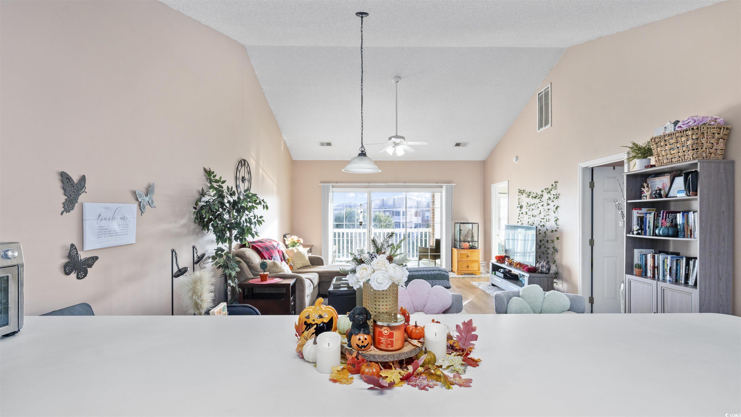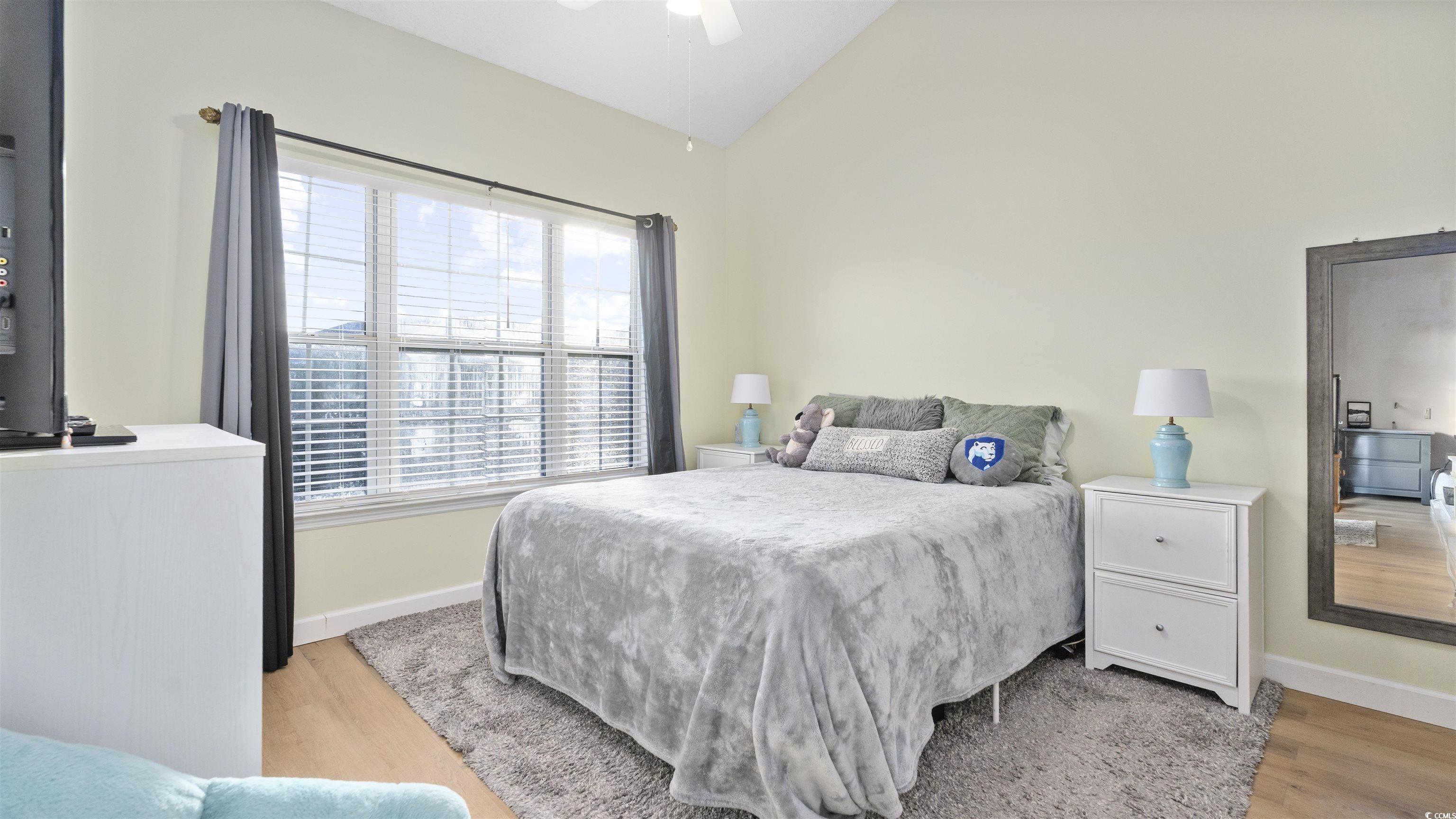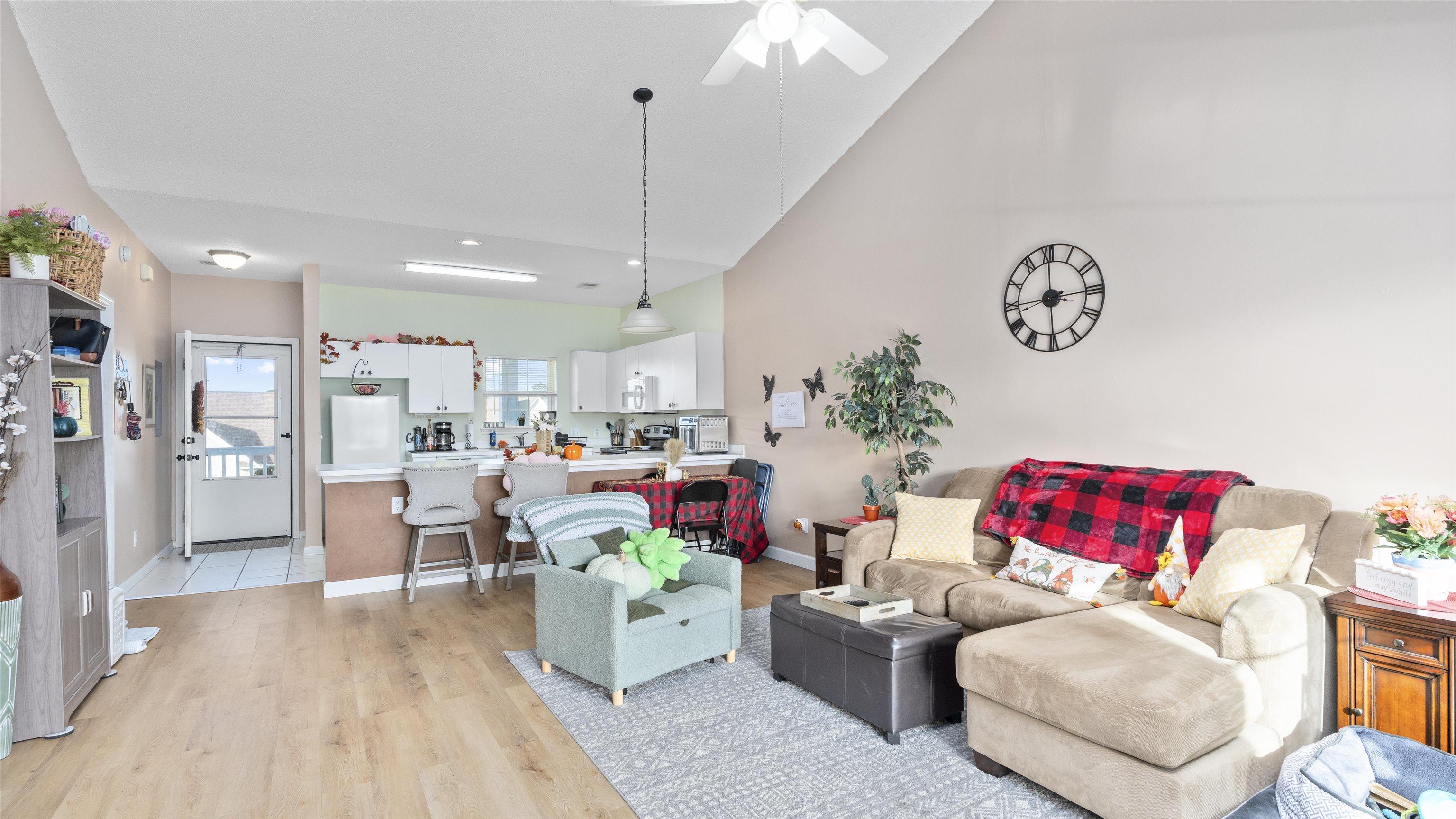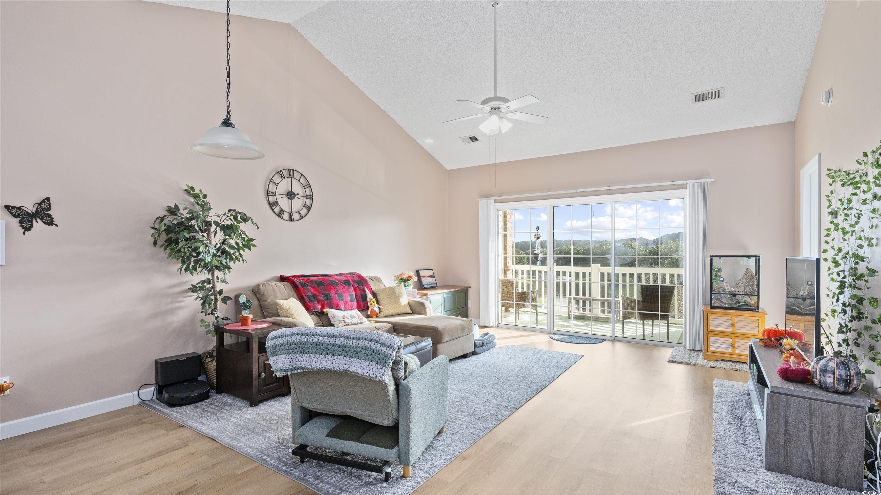 As you step into this third floor condo you will immediately notice the vaulted ceilings that create a spacious yet cozy feeling. Your eyes will immediately be drawn to the window that looks onto a balcony with a beautiful lake view. The nicely appointed kitchen has generous counter space that flows nicely into the living room and is perfect for entertaining. The living room is very spacious and flooded with natural light. The guest bedroom is off of the living room, in the front of the house and has a full bathroom attached to it with an in-unit washer and dryer. The Master bedroom is in the back of the house offering privacy and quiet from the rest of the house. The master bedroom also has vaulted ceilings, a generous sized closet and its own bathroom. This condo has newly replaced flooring and has recently been painted. This condo is in a great location close to good food, shopping and the beautiful beaches of the Grand Strand! Book your showing today.
