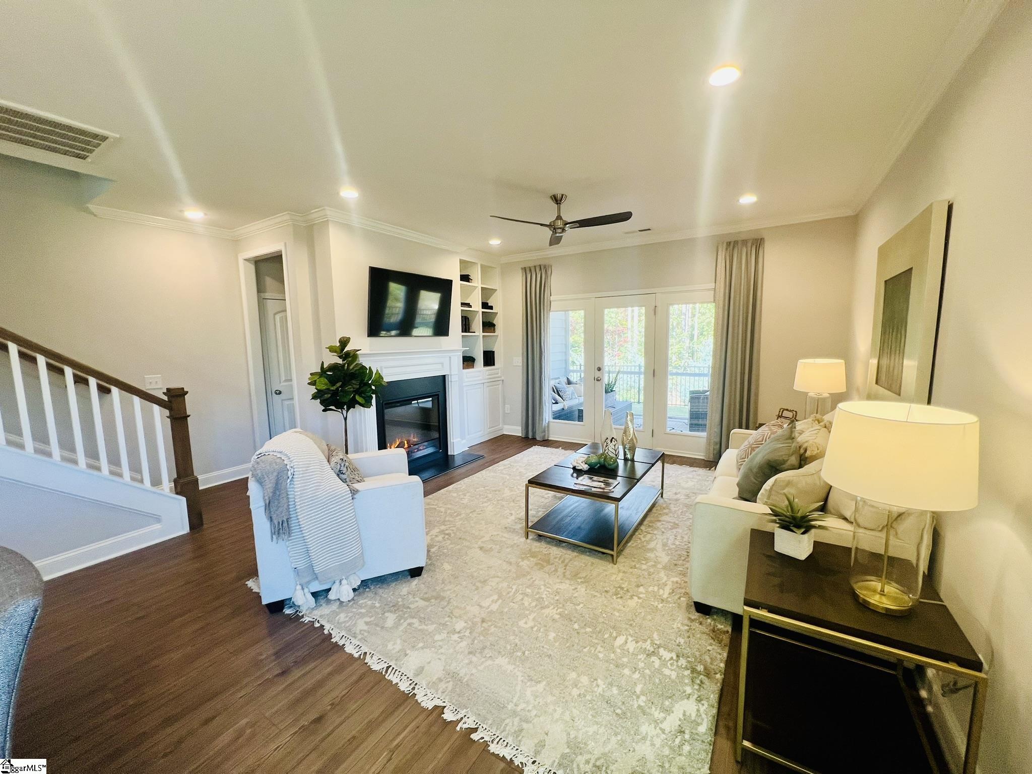 Welcome to Hamilton Townes in the Verdae area. This former MODEL HOME is loaded with upgrades and is a must see. Set on a corner site, it blends modern luxury with true lock and leave convenience. The home enjoys exceptional privacy, backing to wetlands with newly planted evergreens for added screening, abundant natural light, and a beautiful common area backdrop. Available mid November, it showcases designer selected finishes throughout. The popular Halton Plan delivers an open, entertainment ready layout. The gourmet kitchen features 42" soft close cabinetry, quartz countertops, GE stainless steel appliances with gas range, and an extended island with extra storage and seating. The kitchen flows into the dining and living areas, highlighted by a slate surround fireplace with a custom built in bookshelf beside it. Luxury vinyl plank flooring runs through the main living areas, including the main level primary suite with a large walk in closet and an ensuite with dual vanities, a fully tiled shower, a frameless glass door, and a built in seat. Upstairs includes two bedrooms, one is 14' x 18' with a sitting area, a flexible loft, and a full bath with double vanities. Built by LS Homes, a trusted local builder with more than 30 years of experience, this residence delivers high end finishes, energy efficient systems, and low maintenance living in one of Greenville’s most desirable communities. Hamilton Townes sits within the 1,100 acre master planned Verdae area, offering quick access to I 85, I 385, and the shopping, dining, and entertainment along Woodruff Road, all less than ten minutes to Downtown Greenville. Residents enjoy direct pedestrian access to the Swamp Rabbit Trail extension via Verdae Blvd for scenic walking, jogging, or biking. Proximity to medical offices, major hospitals, and Greenville Spartanburg International Airport makes this location ideal for everyday living and frequent travelers. Schedule your private tour today. Professional Photos will be uploaded tomorrow.