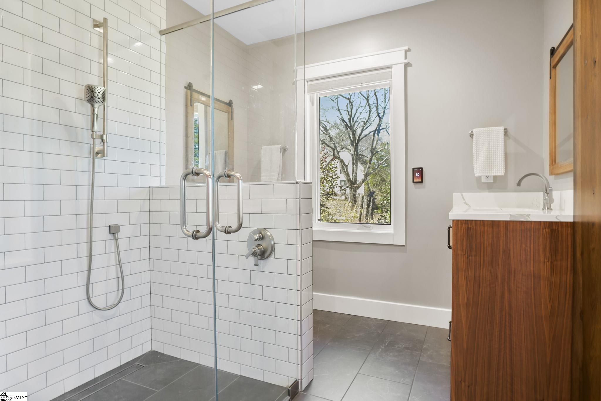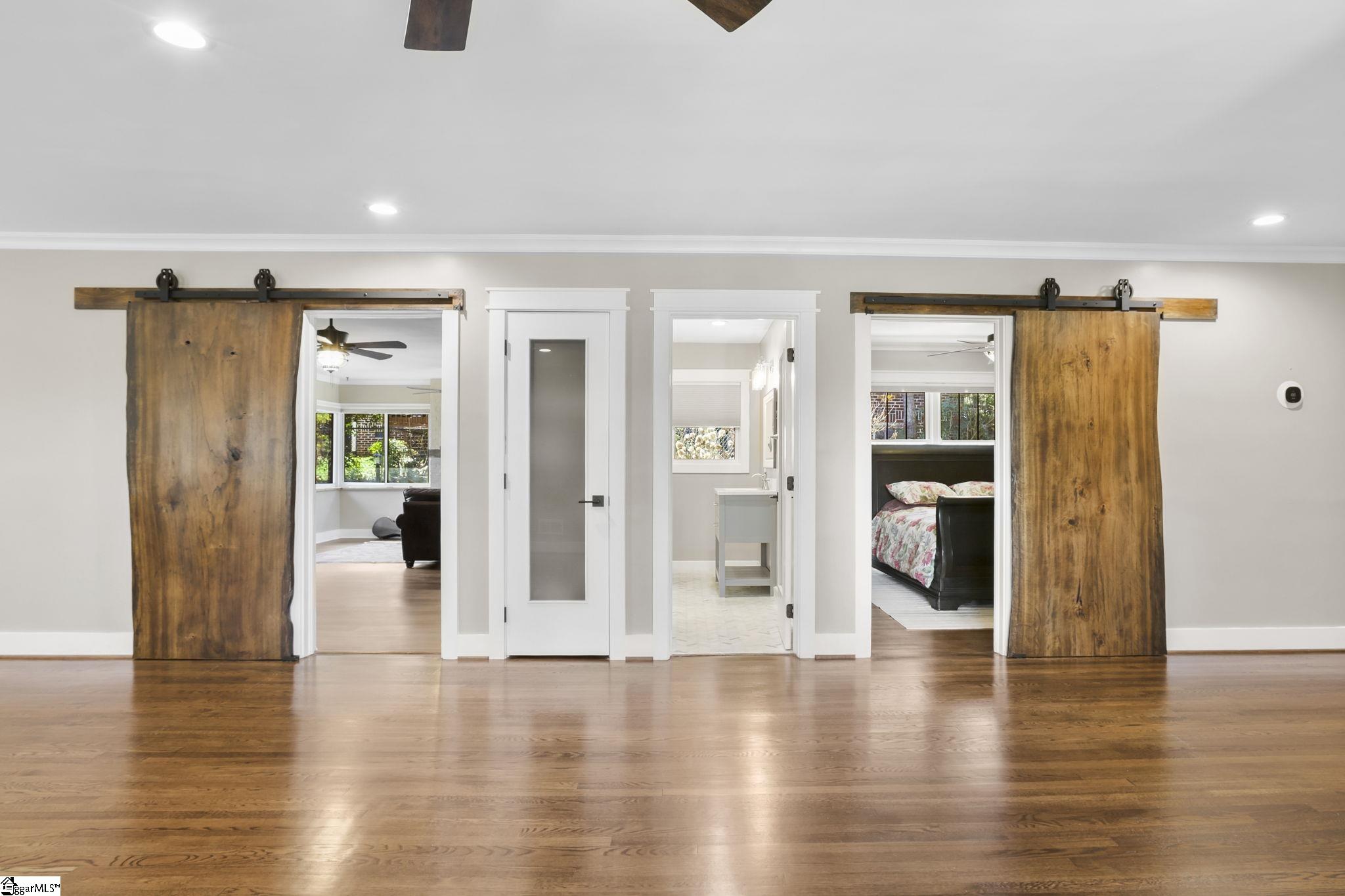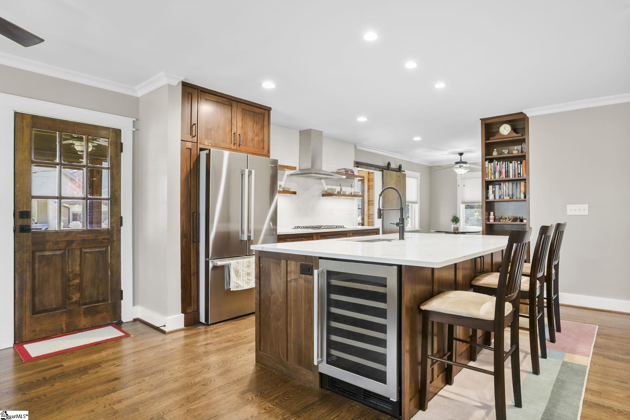Ideally situated just moments from the vibrant heart of Downtown Greenville, 4 E Montclaire Avenue masterfully blends classic brick architecture with inspired, curated design. Enjoy the luxury of strolling to Falls Park, acclaimed restaurants, boutique shopping, and the Swamp Rabbit Trail, all while residing on a charming, tree-lined street that feels both peaceful and connected. From the moment you pass through the gated front porch and approach the dramatic timber-frame entry, the home makes a memorable first impression. A tongue-and-groove ceiling illuminated by gas lanterns creates warmth and character before you even step inside. Within, expansive living spaces unfold beneath detailed crown molding and rich hardwood floors, while multiple fireplaces add depth and ambiance throughout. Every turn reveals distinctive craftsmanship—from live-edge custom barn doors that introduce architectural artistry to thoughtfully designed gathering areas filled with natural light. A separate den offers flexibility for a study, studio, or media lounge, enhancing the home’s versatility. The kitchen is as functional as it is beautiful, featuring quartz countertops, a generous center island, gas cooking with double ovens, built-in banquet seating with integrated storage, and a beverage cooler that makes entertaining effortless. This space flows seamlessly into the main living areas, creating an inviting atmosphere ideal for both intimate evenings and lively gatherings. The primary suite serves as a private sanctuary, complete with a deep soaking tub, an elegantly tiled walk-in shower, and an expansive custom-designed closet that elevates everyday living. A well-appointed secondary bedroom and bath provide comfort and privacy for guests. Outdoor living is equally captivating, with a screened porch perfect for year-round enjoyment, a patio designed for evenings under the Carolina sky, a fully fenced yard, and a detached garage adding convenience and functionality. Artfully composed and impeccably updated, this one-of-a-kind residence offers refined in-town living within walking distance of Greenville’s most beloved destinations—an extraordinary opportunity to own a home that is both timeless and truly unforgettable. Schedule your private showing today and experience firsthand the beauty, craftsmanship, and lifestyle that 4 E Montclaire Avenue has to offer.
