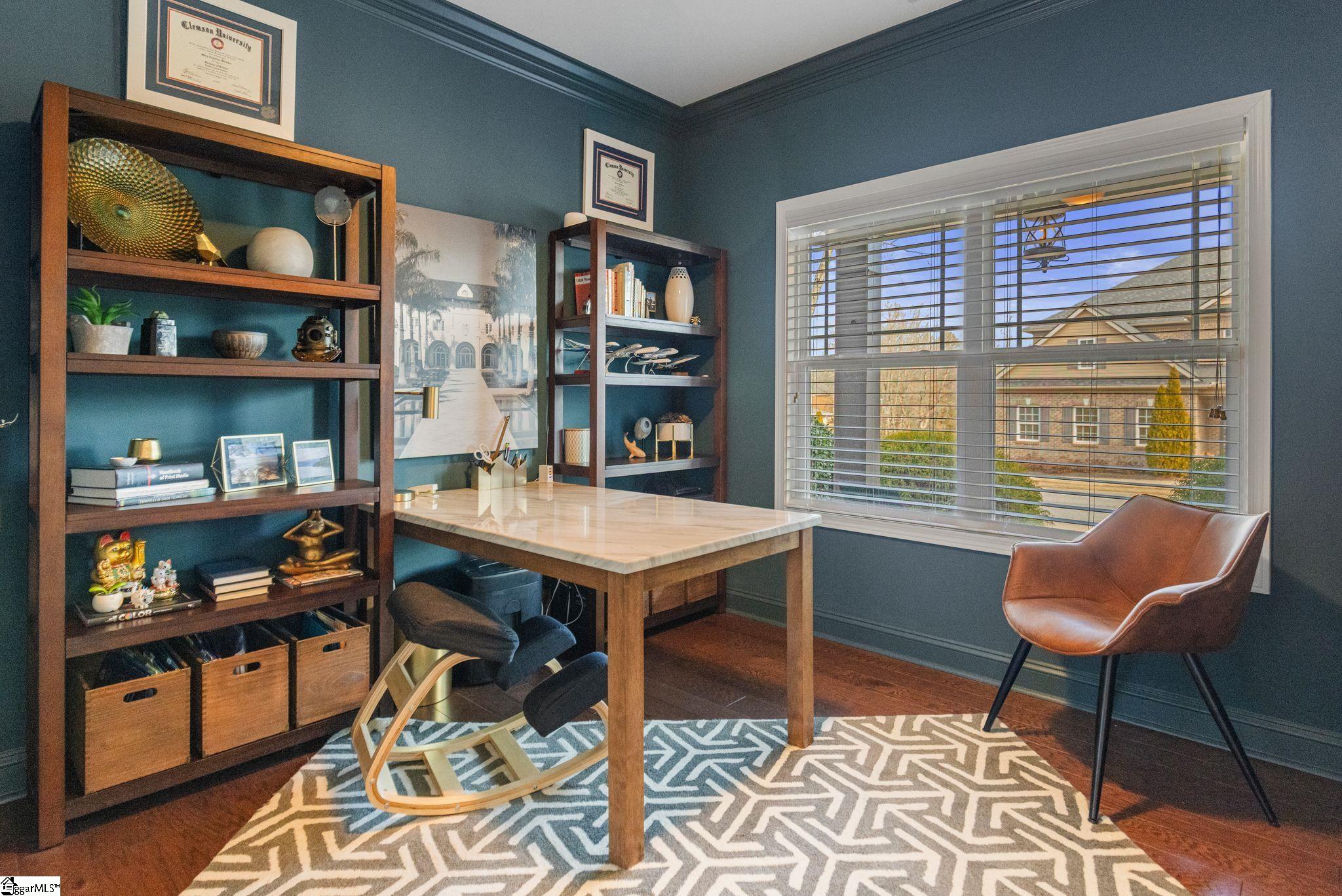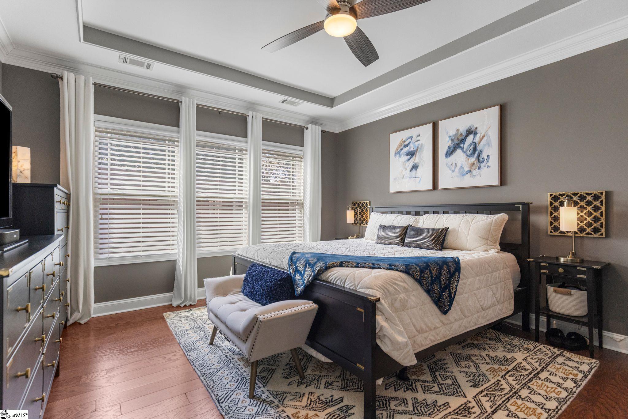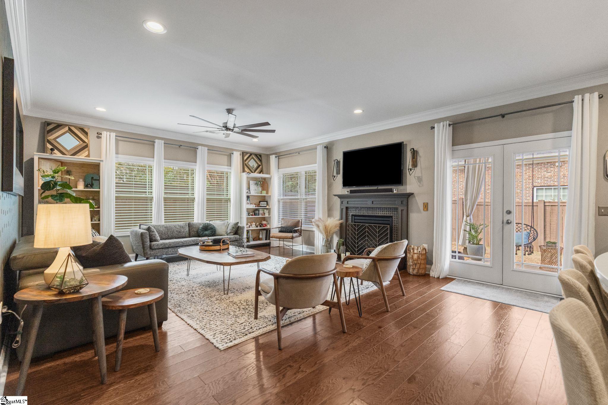 This beautiful Five Forks home is an all-brick 3 bedroom, 2 full bathroom home with over 2,300 sqft of living space and exceptional curb appeal. The inviting covered front porch features custom wood shutters and an impressive brick inlay, setting the tone for the quality and care found throughout. Inside, the easy-to-navigate floor plan showcases gleaming hardwood floors, crown molding, and detailed millwork across the foyer, office, dining area, kitchen, living room, and primary bedroom. The open-concept living area is bright and welcoming with abundant natural light, a gas log fireplace, accent wall, and large ceiling fan. The kitchen is designed for both style and function, featuring quartz countertops, stainless steel appliances, marble tile backsplash, recessed lighting, ornate cabinetry with glass corner accents, rubbed brass hardware, a deep single-basin sink, custom pantry shelving, and a spacious island with bar seating. The main-level primary suite offers a ceiling fan, tray ceiling, and a large walk-in closet with a custom storage system. The private primary bathroom includes quartz countertops, dual sinks, brushed nickel fixtures, vaulted ceiling, tile flooring, linen closet, and a tiled walk-in shower with glass door. Two additional bedrooms on the main level feature carpet, ceiling fans, and spacious closets, while the secondary bath includes quartz countertops, tile flooring, an accent wall, and a tub/shower combination. A flex room or home office near the foyer provides a quiet workspace with French double doors, chair rails, and crown molding. The dining area is open and airy with updated lighting, wainscoting, chair rails, crown molding, and those beautiful hardwood floors. The main-level laundry room offers cabinetry for added storage and a clean, organized feel. Upstairs, the spacious bonus room includes carpet, ceiling fan, a large closet, and access to attic storage with additional flooring and a radiant barrier. This versatile space could easily serve as a fourth bedroom, media room, or playroom. Enjoy outdoor living on the 10x10 covered back porch complete with porch swings, ceiling fan, privacy curtains, outdoor shower, and a built-in folding tabletop. The home also features a fully fenced backyard, raised flower bed, extensive landscaping and a full yard irrigation system. Additional features include remote-controlled ceiling fans, gas water heater with leak detection system, insulated garage door with My Q smart garage system, and AT&T fiber internet. Located in Asheton Lakes, residents enjoy exclusive access to a community pool, clubhouse, three private lakes stocked with fish, and scenic walking trails. Convenient to top-rated schools including Southside Christian, shopping, and dining, this home offers the perfect blend of comfort, efficiency, and lifestyle. Schedule your private tour today!