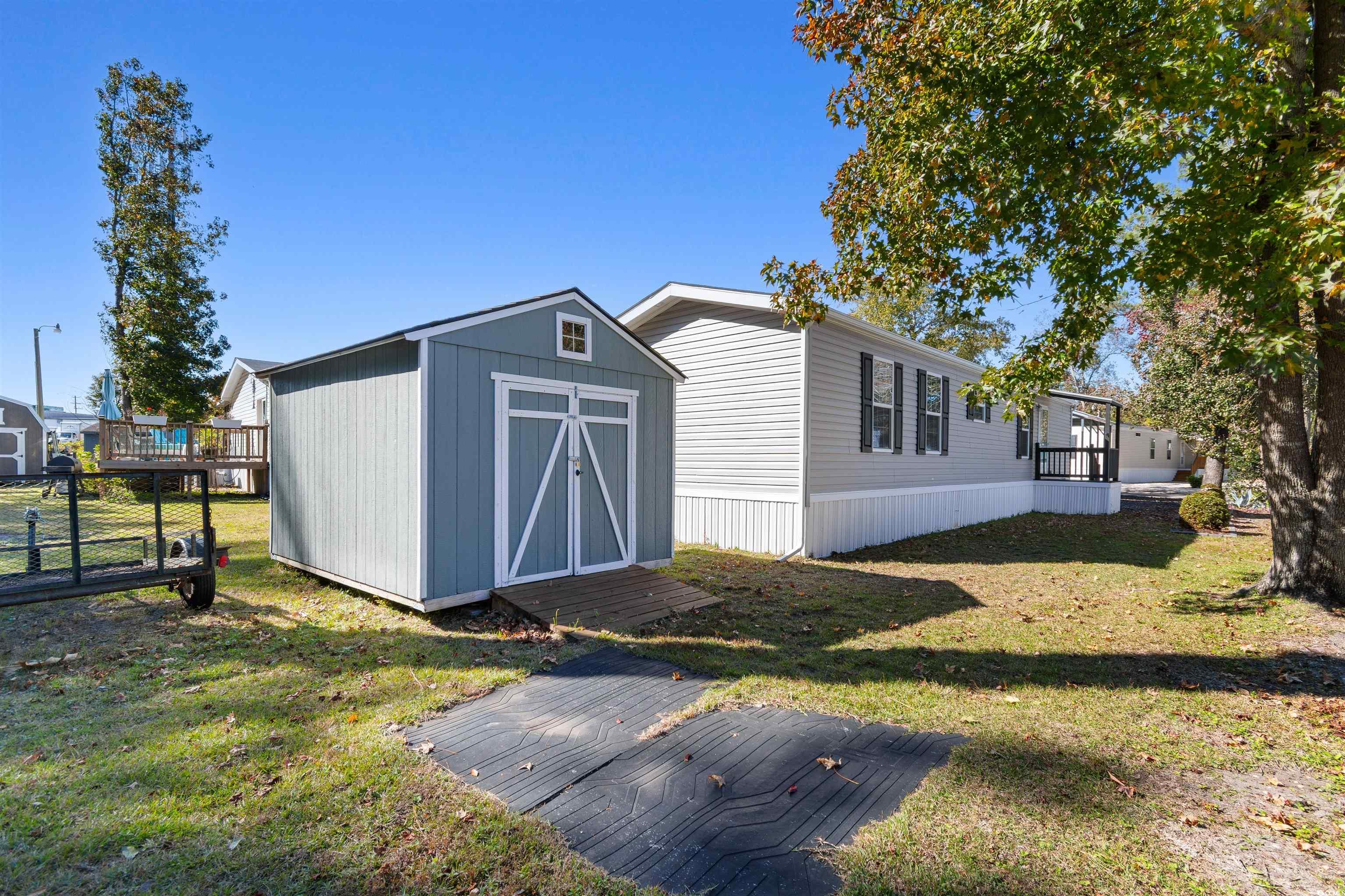 Welcome home to your like new 2023 highly upgraded Destiny Timberline model in the wonderful golf cart to the beach community of Windjammer! Bring your toothbrush as this one comes to you with all the furniture, pots and pans, linens, dishes etc.! Kitchen features include stainless steel appliances, farm sink, lots of cabinet space. Primary bedroom has double closets, double sink and a convenient step in shower. The front porch was extended to a covered 6x6 area. The rear deck was professionally built and the outdoor furniture and grill convey! A brand-new high quality 20x20 carport was recently installed. The unit recently received gutters, a large 10x12 shed stocked with all you need including lawn mower, leaf blower, and more! A boardwalk was also added along with additional landscaping. 2023 HVAC and Hot water tank! Super low taxes and conveniently close to shopping, restaurants, and medical facilities, and a short legal golf cart drive to the beach! A golf cart will be included in the sale. This one is as nice as it sounds and looks and is priced to sell quickly, so call the listing Realtor or Realtor of your choice to schedule a viewing today!