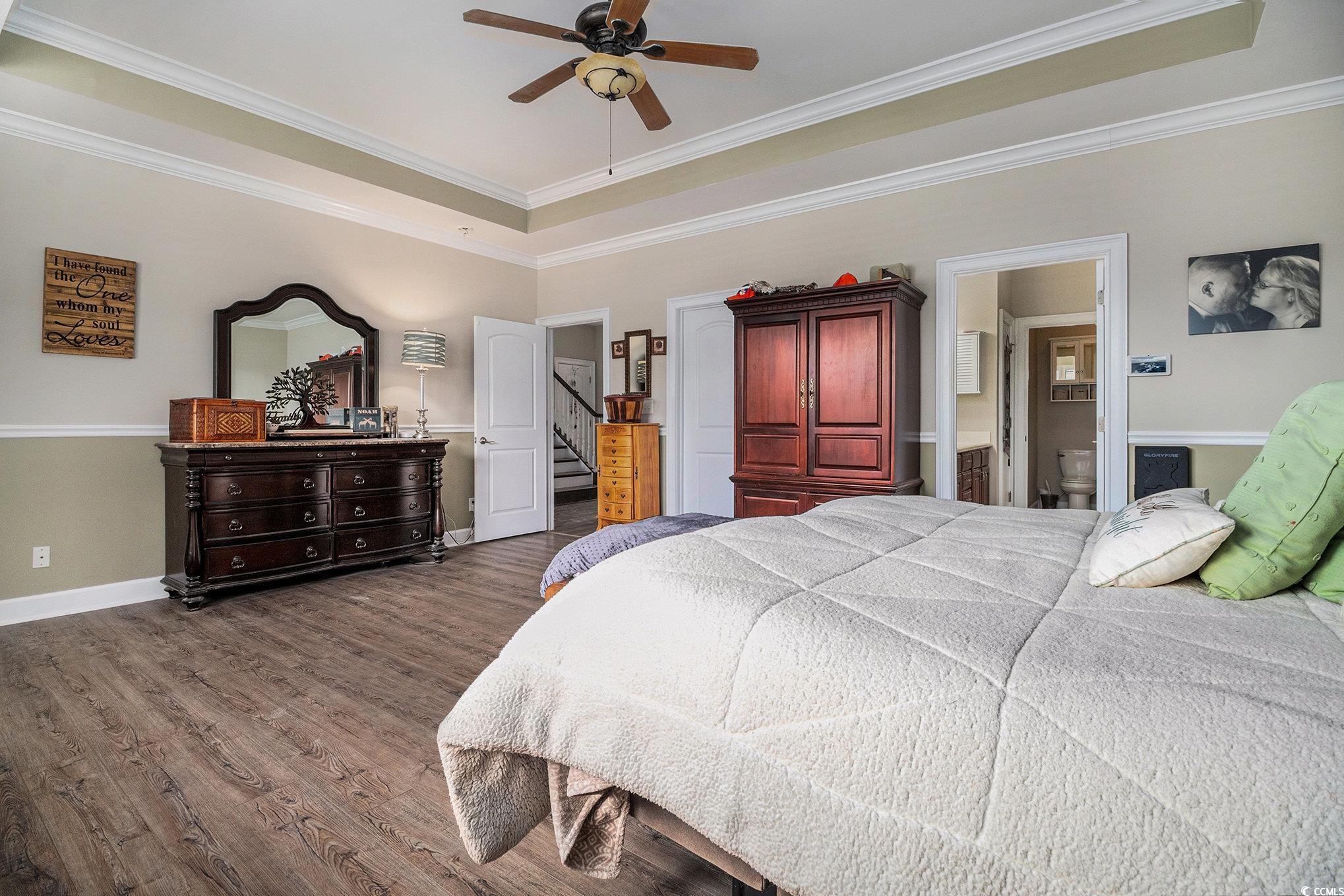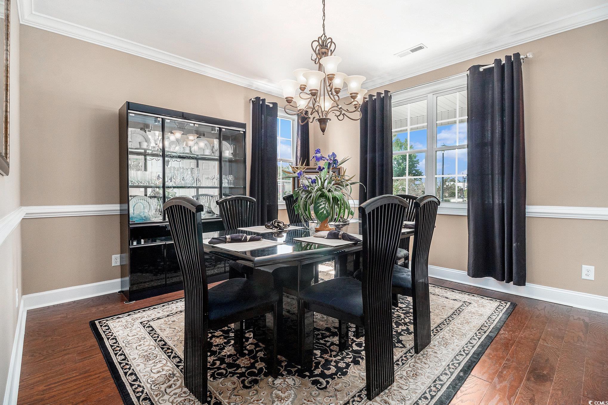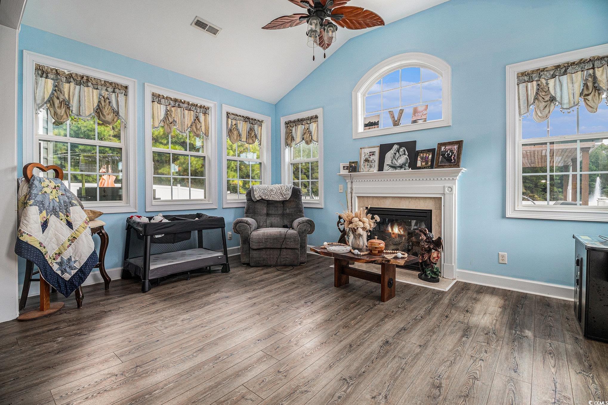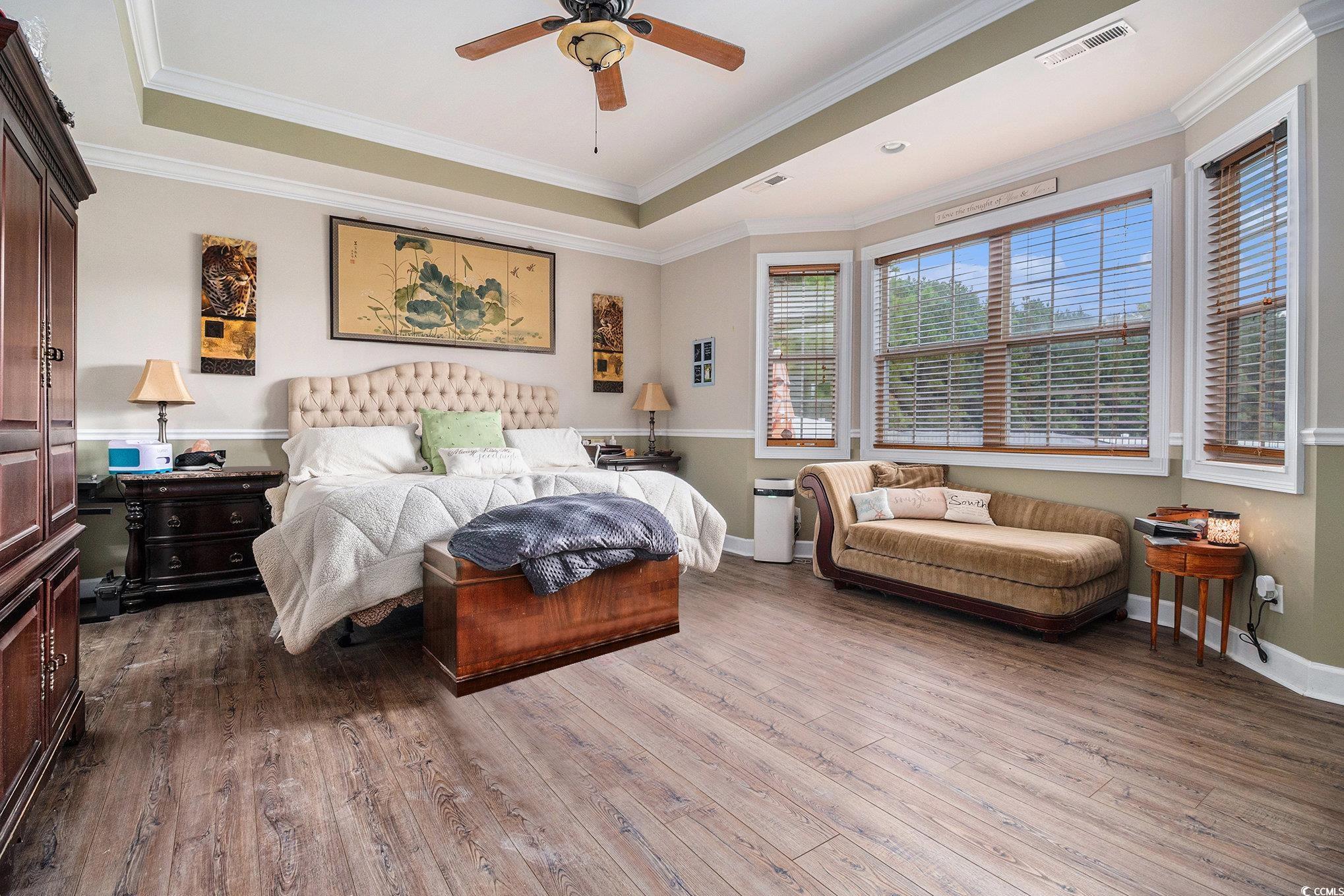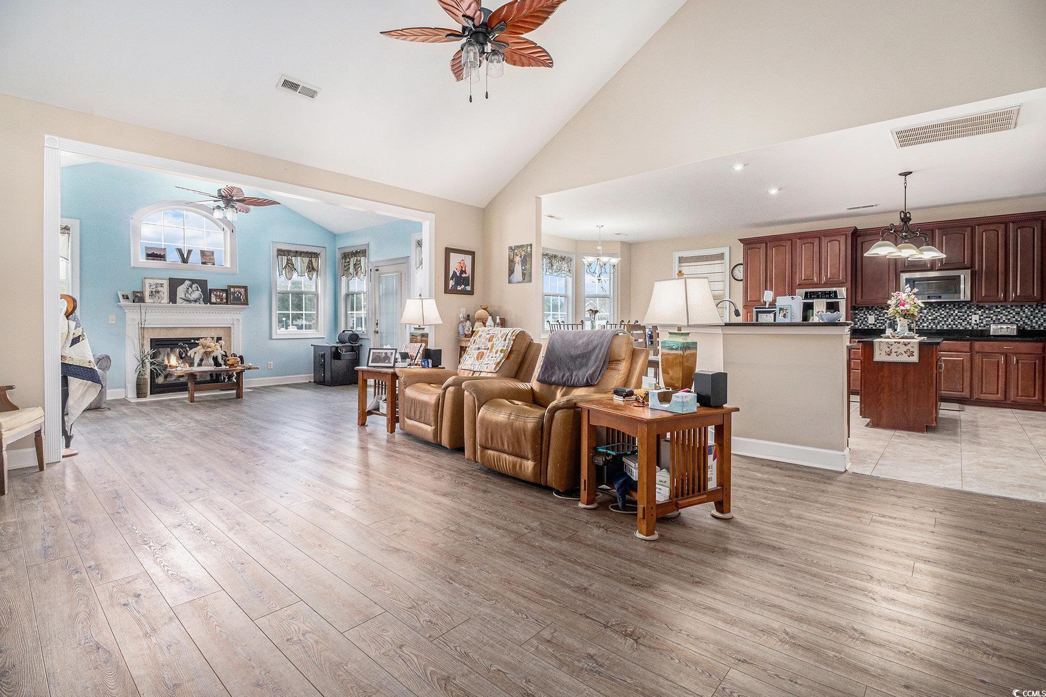 This spacious home features 5 bedrooms and 2.5 baths, set in the sought-after gated community of The Hunt Club at Hunters Ridge. Enjoy stunning lake views and a backyard oasis with a heated saltwater pool, spa, Cool Touch pebble decking, artificial turf play area, and full privacy fencing-all app-controlled for convenience. The first-floor master suite offers tray ceilings, a cedar-lined walk-in closet, and a luxurious en-suite with walk-in tub and separate tiled shower. The flooring on the main living area is hardwood. Additional bedrooms are upstairs with LVP flooring. A cozy Carolina room with fireplace adds charm. Upgrades include a 3-car garage with new drive motors, coils, and rollers (2024), plus custom shelving throughout. Ideal as a primary residence, vacation home, or rental. The Hunt Club at Hunters Ridge Plantation offers residents Low HOA fee, community pool, and just 15 minutes to the beach, with easy access to shopping, dining, golf, and healthcare.