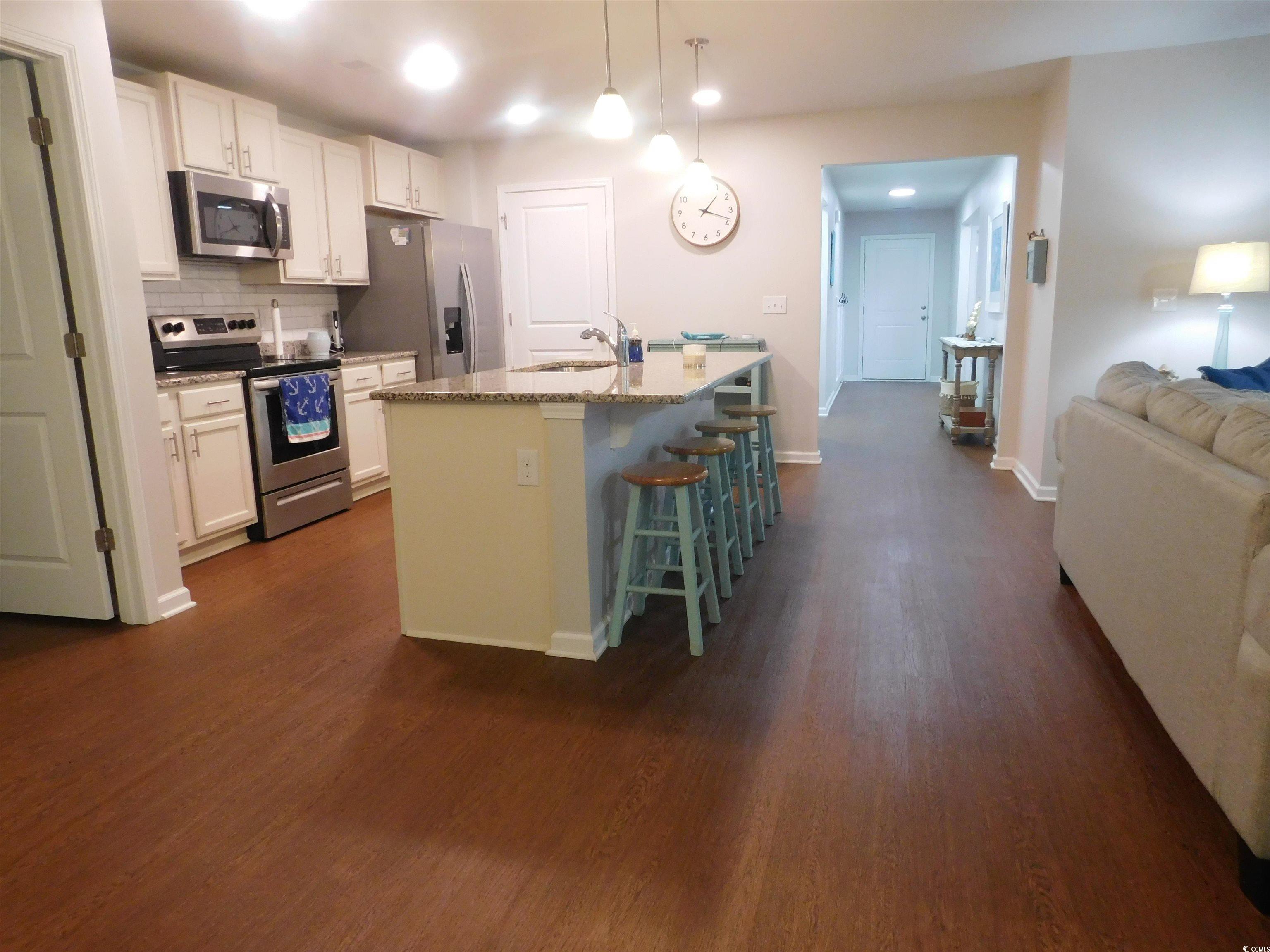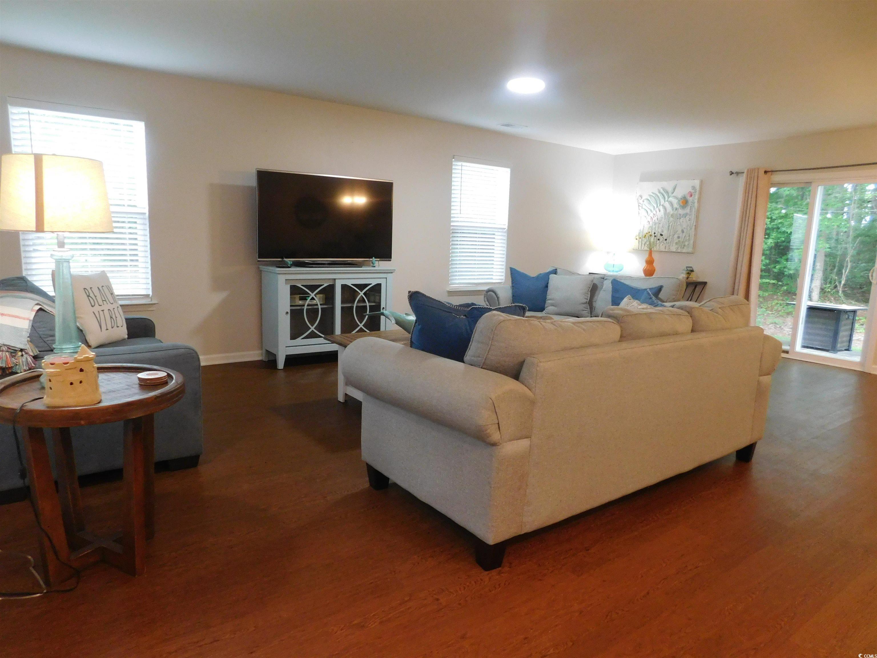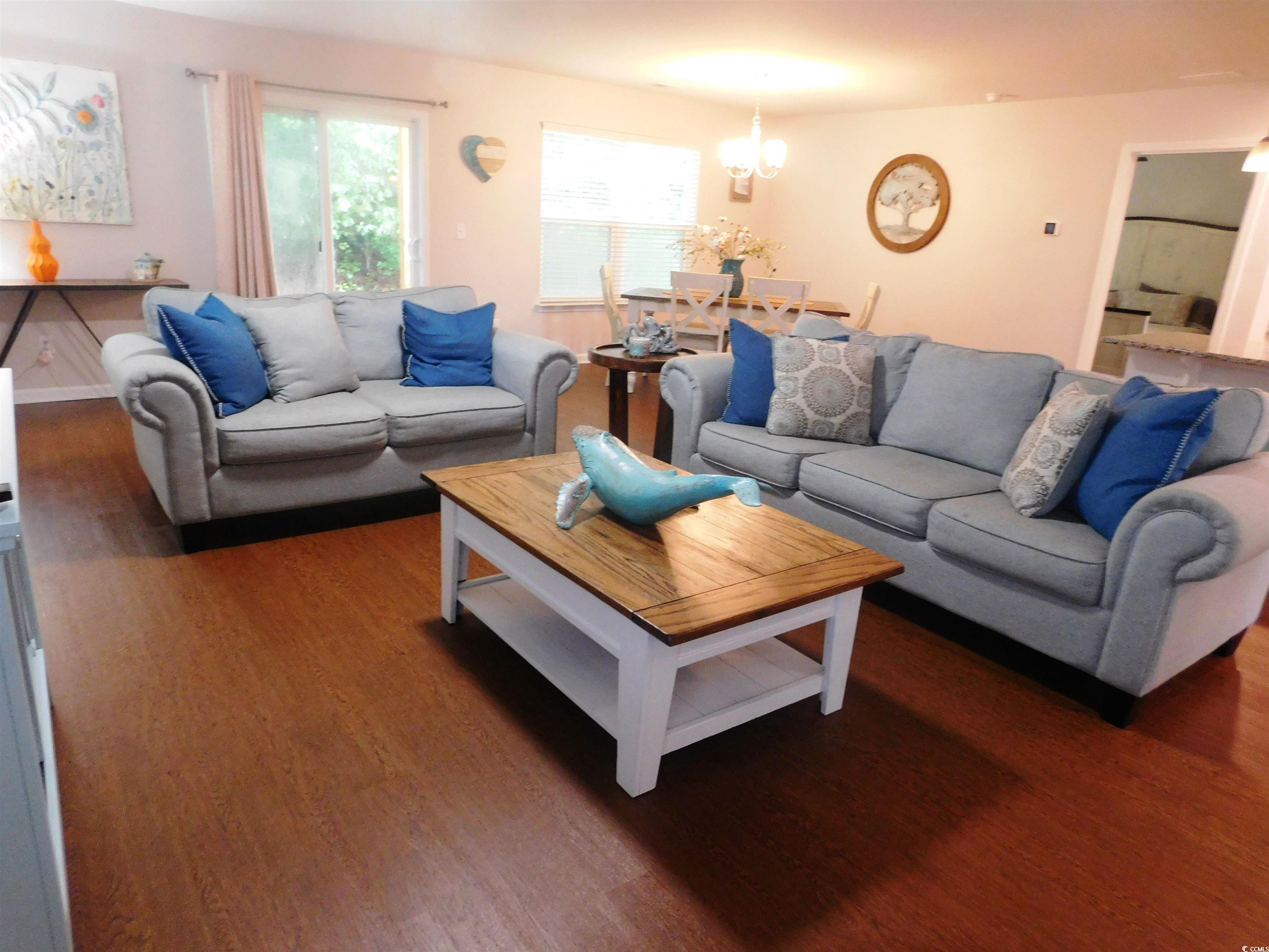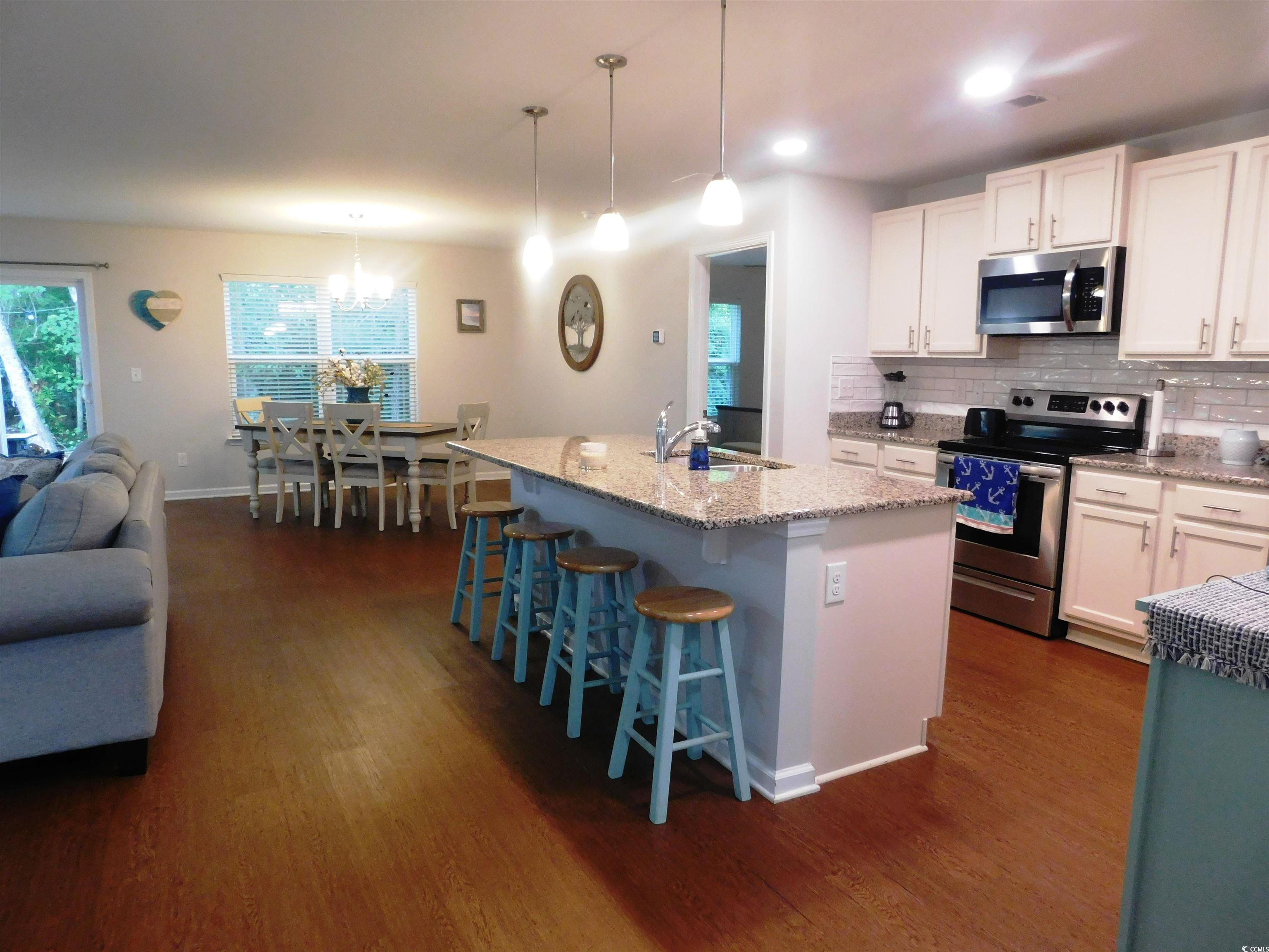 Awesome 3 BR/2BA/2 Car garage ranch home in desirable Anchors Bend nestled on phenomenal, landscaped corner lot and in close walking distance to pool and club house. Home features a cozy front covered porch. Walk into a foyer area complete with chair/squares with convenient built-in coat rack for family and guests. Be greeted with lovely wood looking luxury vinyl plank floors that flow from foyer seamlessly throughout the entire home. As you enter home, on the left find two lovely guest bedrooms, linen closet, and full bath perfectly located between the two bedrooms for convenience and easy access for guests. On the right side find a door entering home from garage for easy loading and unloading, plus located next to a terrific laundry room for easy clean up from working in yard, etc. The laundry room is plenty spacious has shelf and hooks for keys, clothes or whatever you need. Continue from foyer into a huge bright, light ,family room featuring sliders to a deck that faces back yard and natural area perfect for privacy, grilling ,and outside entertaining. Family room is totally open to the tastefully and well-planned kitchen boasting granite counter tops, breakfast bar, plus coordinating subway tile back splash, large pantry, and all appliances to include a stainless-steel side -by -side refrigerator/freezer with water & ice dispenser, range, dishwasher, and microwave. Dining area opens to entire living area and kitchen which is phenomenal for not only you and your family, but also an awesome layout for entertaining. Home has split bedroom plan, and a spacious master suite is on back side of home boasting the same beautiful wood looking luxury vinyl plank floors, high ceilings, large windows to bring in natural light and show case back yard and natural area behind it. Master also has an awesome huge walk-in closet. Venture into the large master bath featuring toilet water closet, second large walk-in closet, 5’ walk-in shower, and high double upgraded sinks with plenty of storage. The garage walls are finished and have shelves located for great storage for yard tools and any other items. Anchors Bend is a well-maintained development with a pool, community Amenity Center with a full kitchen, bathrooms, exercise room, and children’s play area. If that’s not enough, venture only minutes away to North Myrtle Beach and all it has to offer- ocean, shopping, golf, restaurants, and entertainment. See it you’ll want to call it yours.