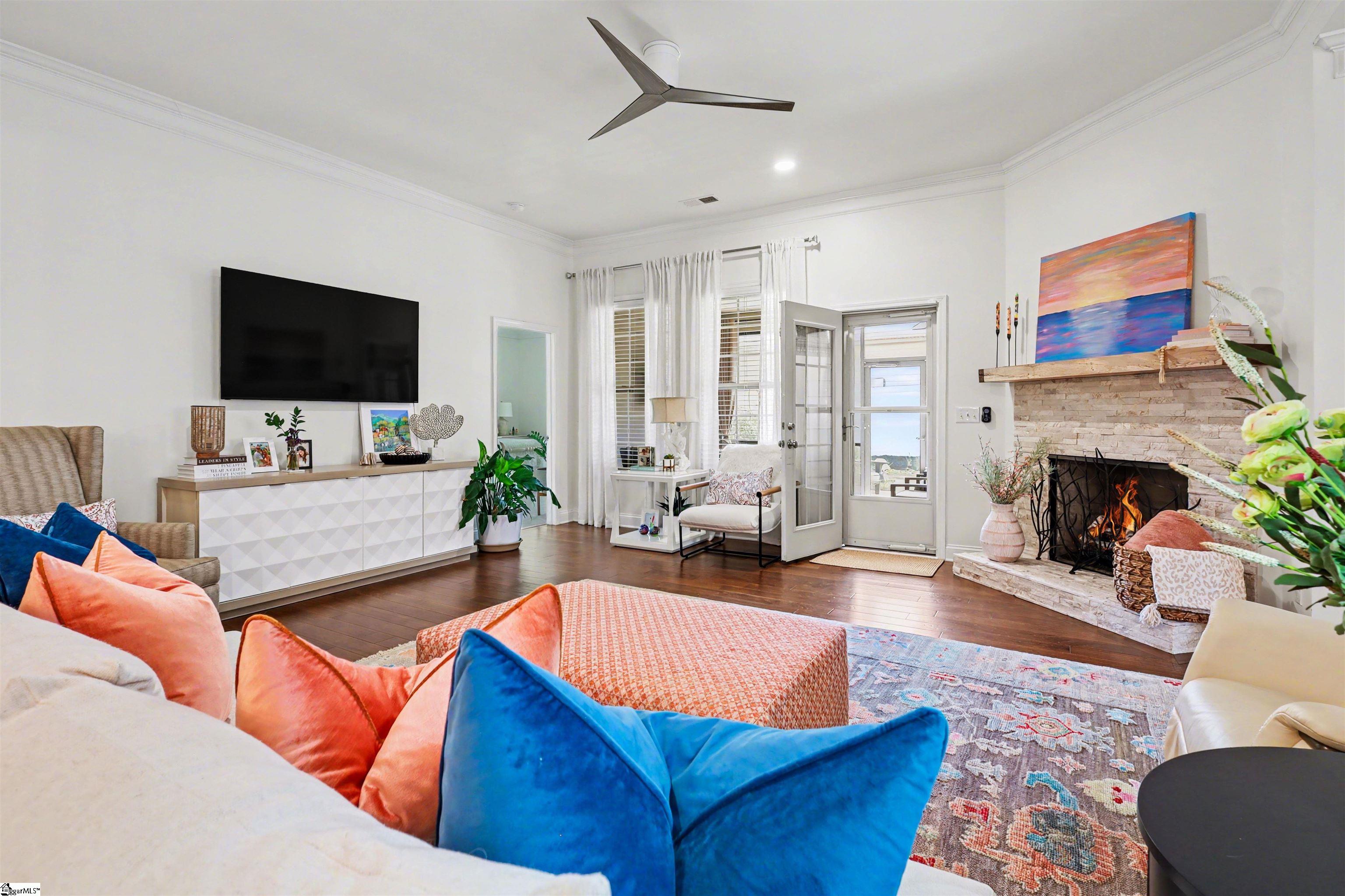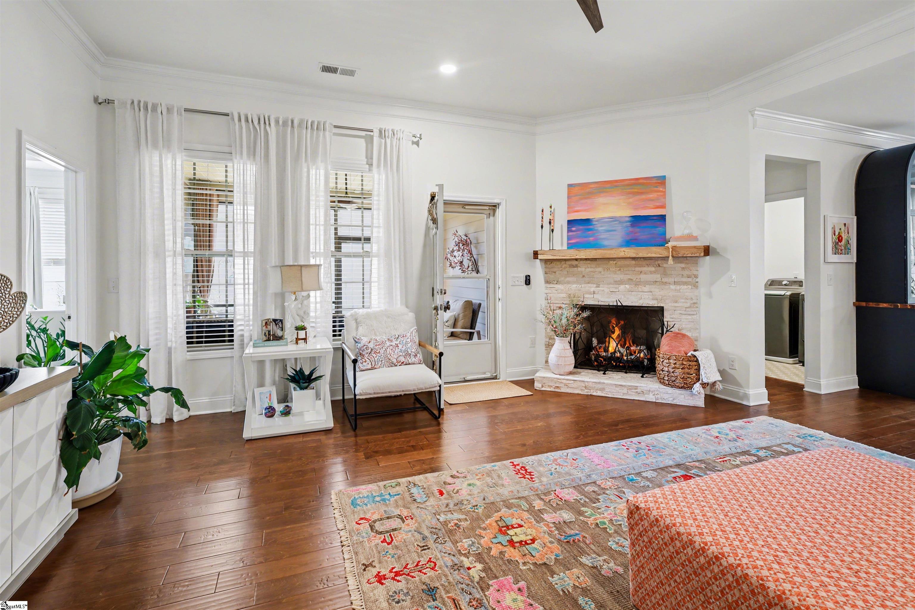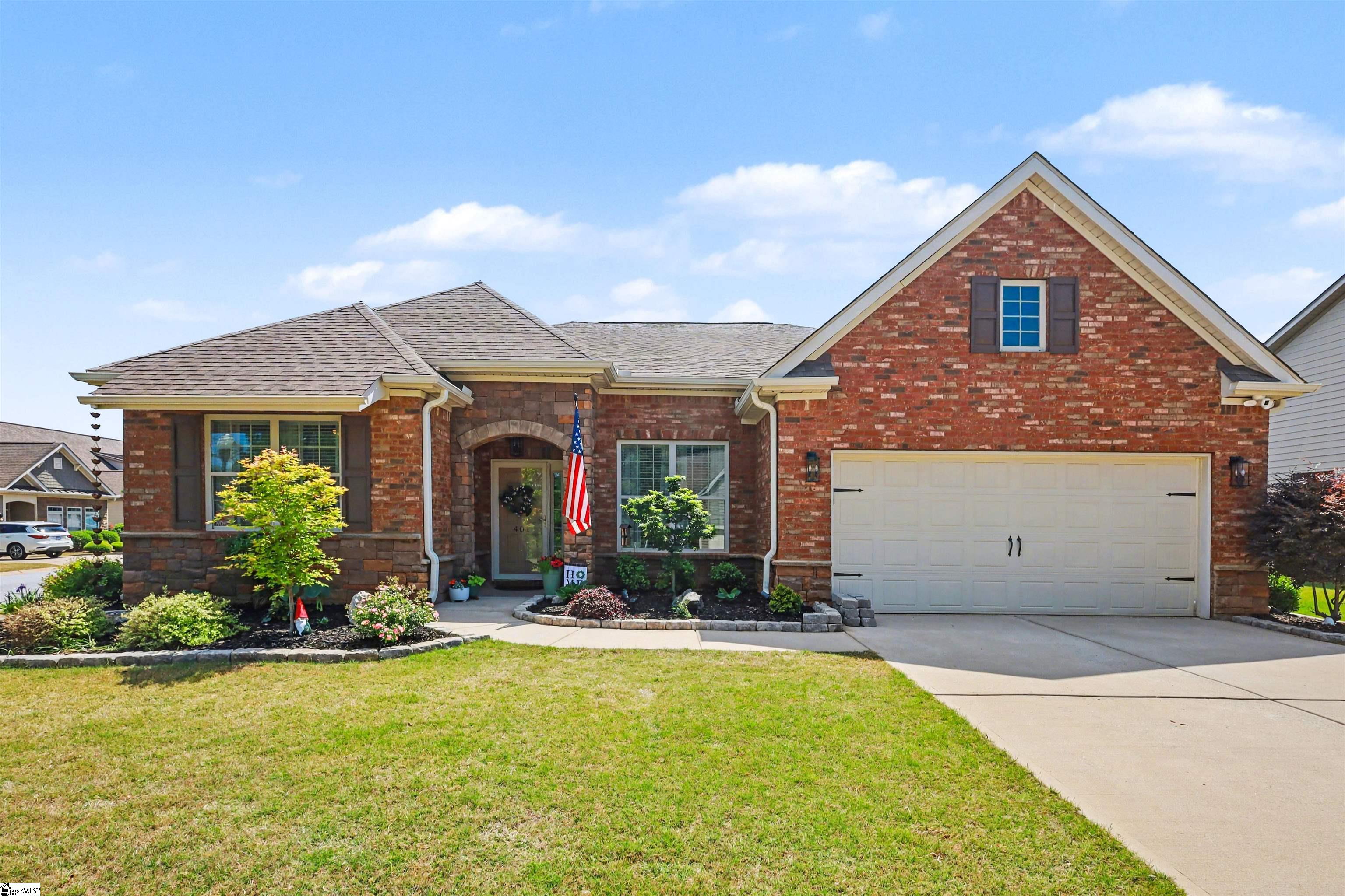 Welcome to 401 Woodland Oaks Ct, a beautifully updated home nestled within an intimate community of just 45 residences, offering a perfect blend of comfort, style, and convenience. Positioned on a spacious corner lot, this 4-bedroom, 3-bath home with a versatile flex room features a bright, open layout with warm hardwood floors and thoughtfully designed living spaces. Over the past year, the home has undergone extensive upgrades, including a refreshed kitchen with new granite countertops, backsplash, upgraded fixtures, enhanced cabinetry features, and a suite of modern appliances. The bathrooms have also been tastefully updated with new finishes and fixtures, while additional improvements such as new flooring in select areas, fresh paint inside and out, updated lighting and fans, and custom touches throughout create a polished, move-in-ready feel. The living area is anchored by a custom-built fireplace, offering a cozy focal point, while the screened-in patio with upgraded flooring extends the living space outdoors for easy relaxation and entertaining. Exterior enhancements include new landscaping, added outdoor living space, and a private fenced backyard. Major system upgrades and features—such as a high-efficiency HVAC system, garage improvements, EV charging capability, and a security system—add comfort and peace of mind. Ideally located just minutes from shopping, top-rated schools, and major roadways, this home is approximately 5 minutes from downtown Simpsonville, 25 minutes from downtown Greenville, and about 20 minutes to GSP International Airport, making it an exceptional opportunity in a highly desirable setting.