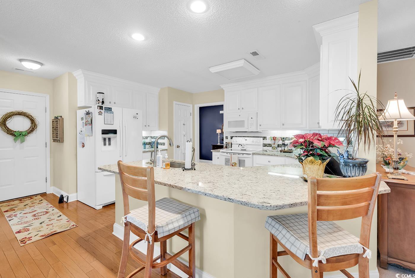 Welcome to this charming single-level home in Oak Manor featuring three bedrooms and two baths, ideally located just off Forestbrook Drive. Nestled in a quiet, well-kept neighborhood yet only minutes from all the dining, shopping, and entertainment the Myrtle Beach area is known for, this home offers the perfect blend of comfort and convenience. Step inside to a bright and inviting living room with vaulted ceilings and a cozy gas fireplace, a great space for relaxing or entertaining. The kitchen features solid-surface counters, ample cabinet space, and both a breakfast nook and a dedicated dining area. A spacious screened porch overlooks the fully fenced backyard, complete with a large concrete patio ideal for outdoor gatherings. The primary suite is generously sized and includes tray ceilings, a ceiling fan, and a large walk-in closet. The primary bath offers a garden tub, double vanity, and a large tile shower. Two additional bedrooms provide plenty of room and great closet space for family, guests, or a home office. With its thoughtful layout, desirable features, and convenient location, this Oak Manor home is a must-see. ** Please note, fire in fireplace is digitally enhanced**