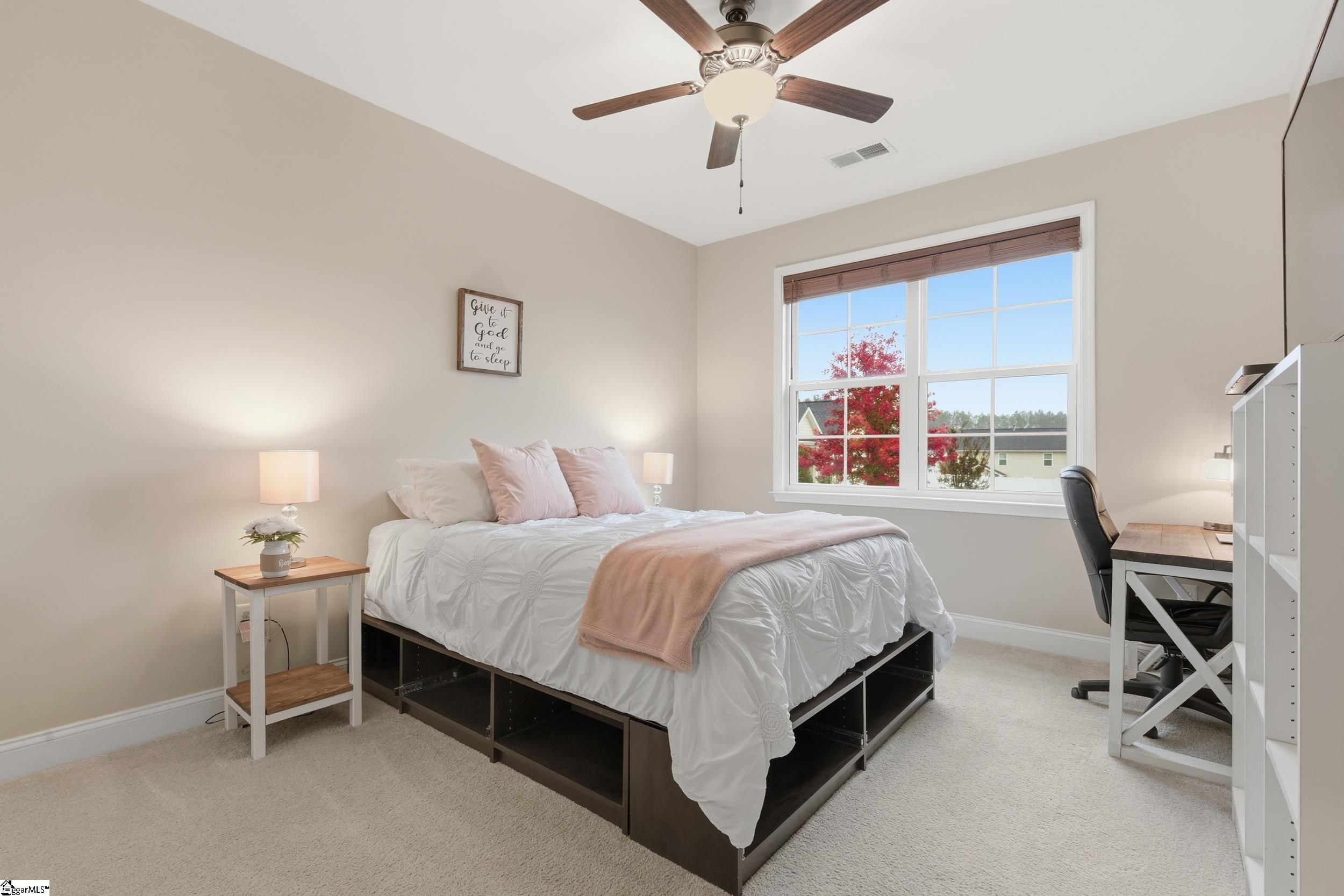 Welcome to your picturesque cottage on the hill! Nestled within the peaceful boutique community of Piedmont, SC, this charming home provides small town serenity while still being part of Greenville County, just minutes from major highways and convenient toll roads. Perfectly positioned between thriving downtown Greenville and charming Main Street Simpsonville, you truly get the best of both worlds. Set on over half an acre, bordering a protected pine tree reserve, this home gives space, privacy, and a natural backdrop. Enjoy relaxing afternoons on the classic southern front porch, where the gentle glow of the sun sets the perfect tone for your return home. Step inside to discover a well-designed open floor plan that blends modern comfort with everyday ease. The spacious living area boasts soaring vaulted ceilings, a raised gas fireplace, and dark walnut 12mm Mohawk laminate flooring, creating warmth and sophistication. The chef-inspired kitchen is ideal for entertaining, featuring stainless steel appliances, a bright tile backsplash, oversized island, and gas range. The split floor plan ensures privacy, with two spacious bedrooms and a full bathroom on one side of the home and a private owner’s retreat on the other. The primary suite features tray ceilings, abundant natural light, and a spa-like ensuite complete with contemporary tile shower surround, double vanities, and dual custom walk-in closets. Additional thoughtful details include a custom drop zone with ample storage leading from the mudroom into the functional laundry area. Step out back to a covered patio where you can unwind in the quiet evening breeze while watching Fido chase the birds across your fenced yard. This turnkey home blends southern charm, modern design, and exceptional value, ready for you to call home!