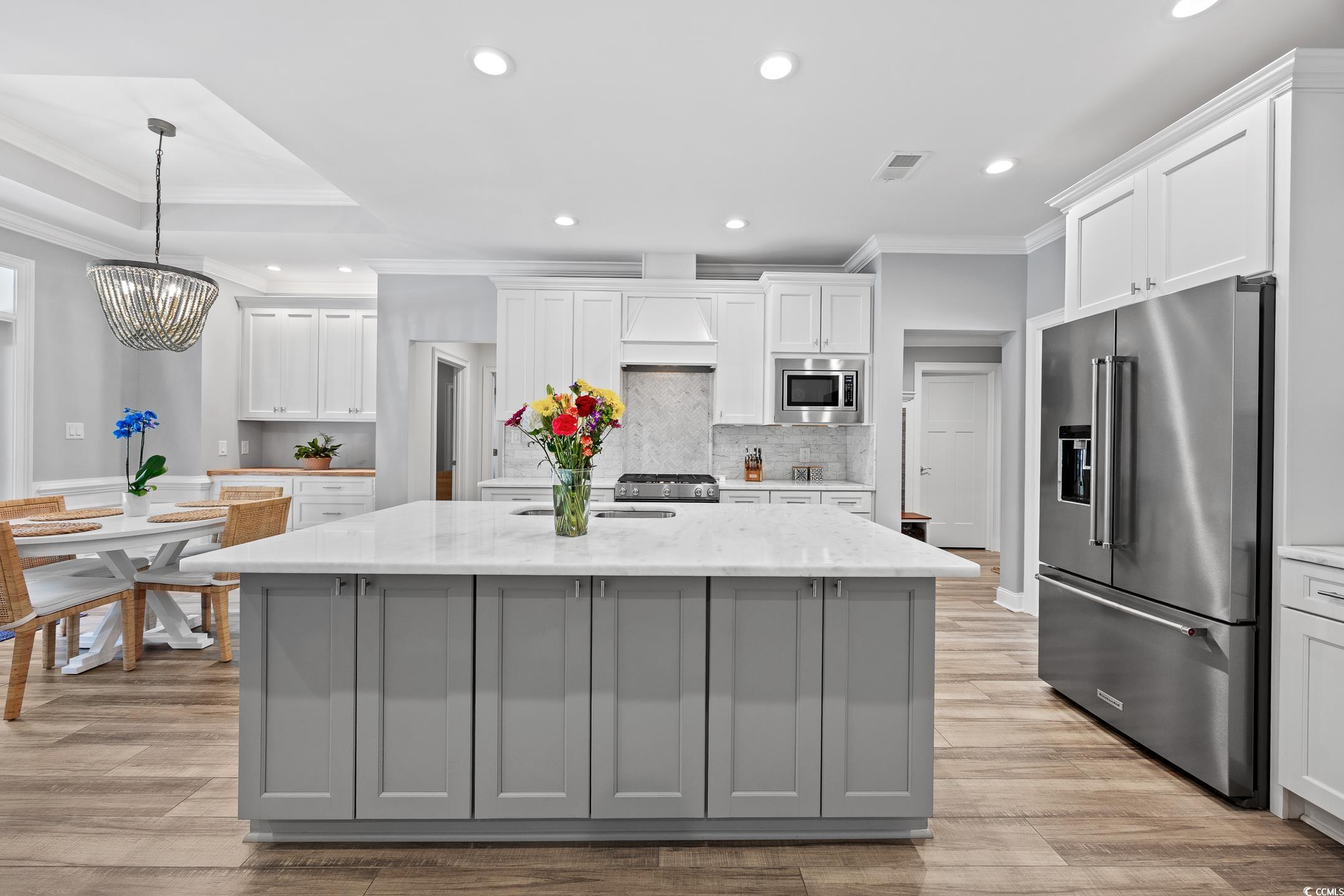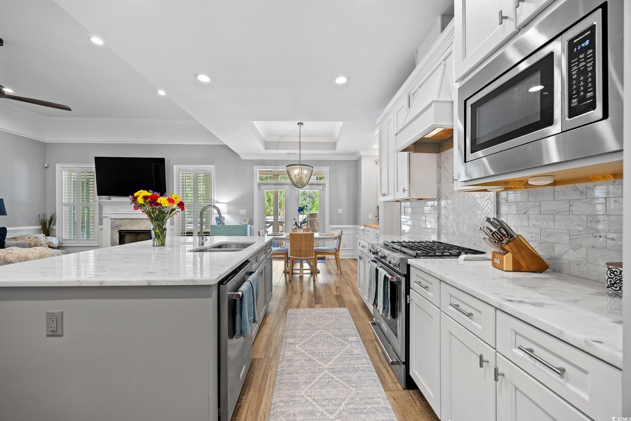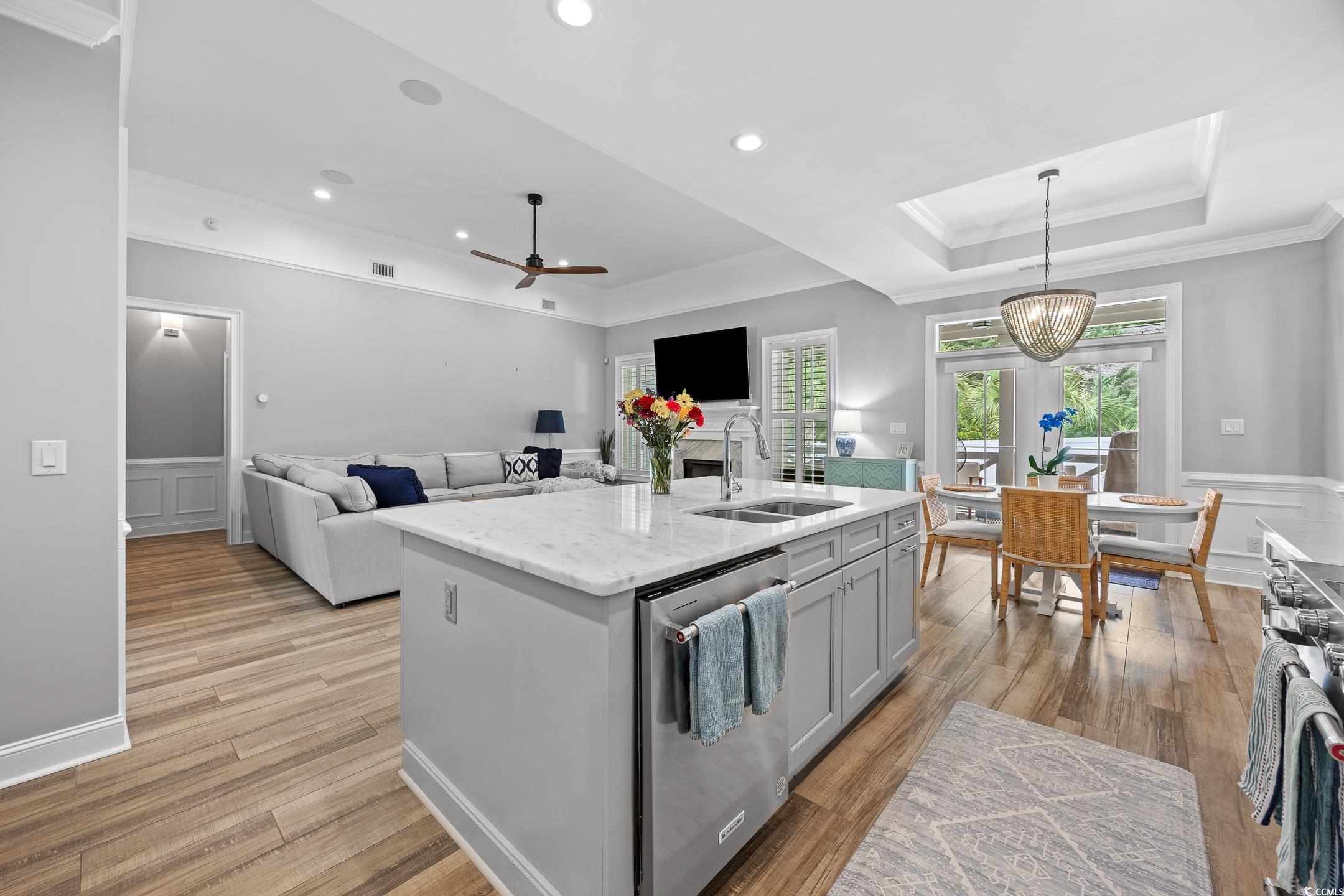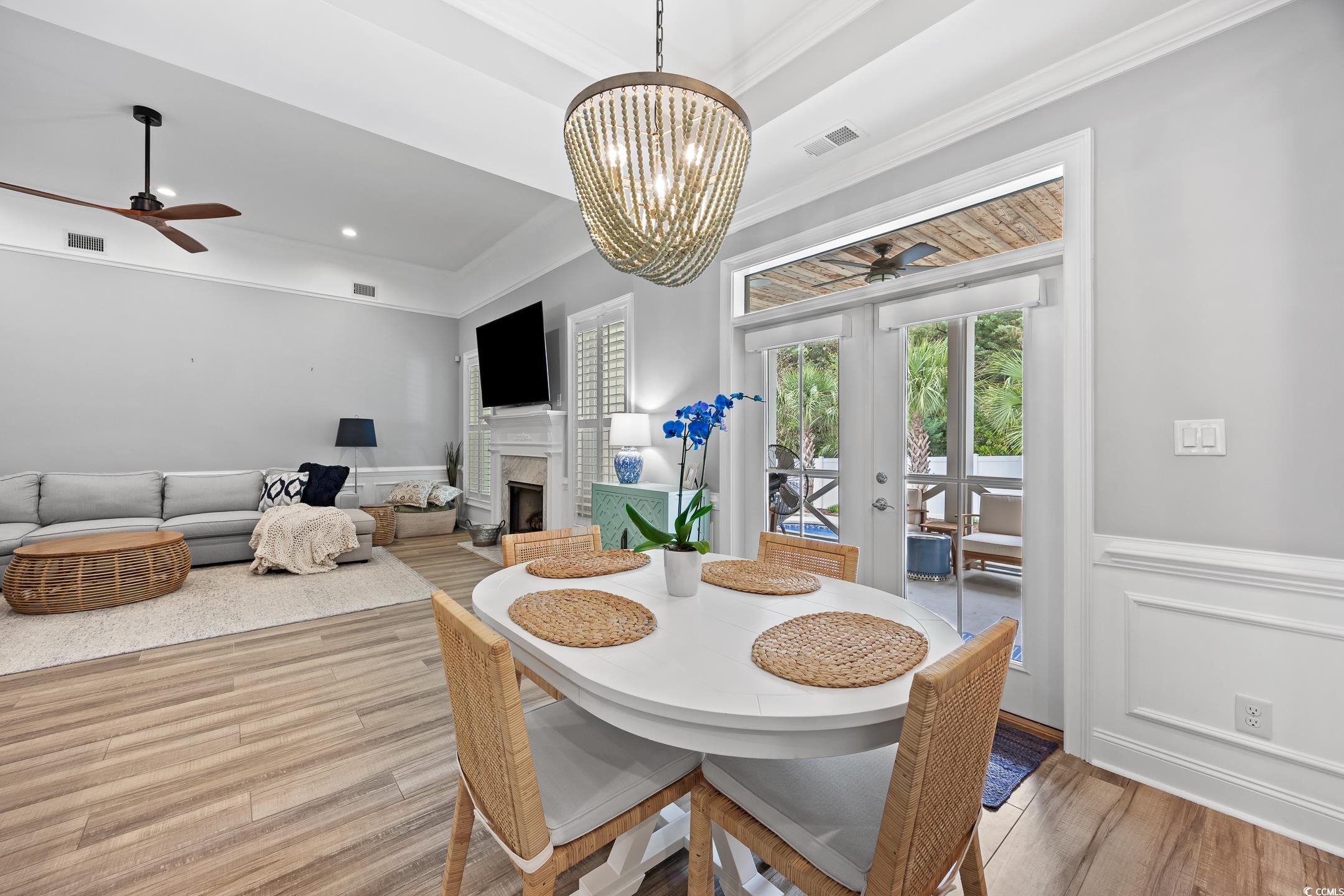 Located in the coveted Forest Dunes section of Myrtle Beach's Golden Mile, 407 68th Avenue North is one of a few newer custom-built homes in the neighborhood, just steps from the Atlantic. Constructed in 2018 with Hardie Plank and brick exterior, this thoughtfully designed two-story home offers 6 bedrooms and 4 full bathrooms with finishes that exceed expectations at every turn. The open main level features 10-foot coffered ceilings, a gas fireplace, and a gourmet kitchen with a large island, marble countertops, and stainless KitchenAid appliances all flowing seamlessly into the living and dining areas. The primary suite is privately situated on the main floor with a spa-like ensuite, walk-in shower, and soaking tub, while three additional guest bedrooms and two full baths provide ample space for family and guests. Upstairs, a bonus room with a full bath and additional bedroom adds welcome flexibility. Outside, the covered rear porch with wood ceiling, outdoor TV hookups, and ceiling fans overlook a private in-ground pool surrounded by palms and fully fenced for privacy. Beach living doesn’t get much better than this! A detached outbuilding offers bonus space ready to finish as a studio, gym, or storage. A generous lot size and an unbeatable location within walking distance of the beach, this is a rare opportunity on the Golden Mile.