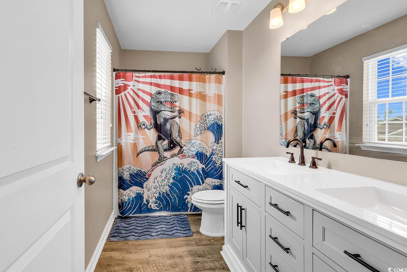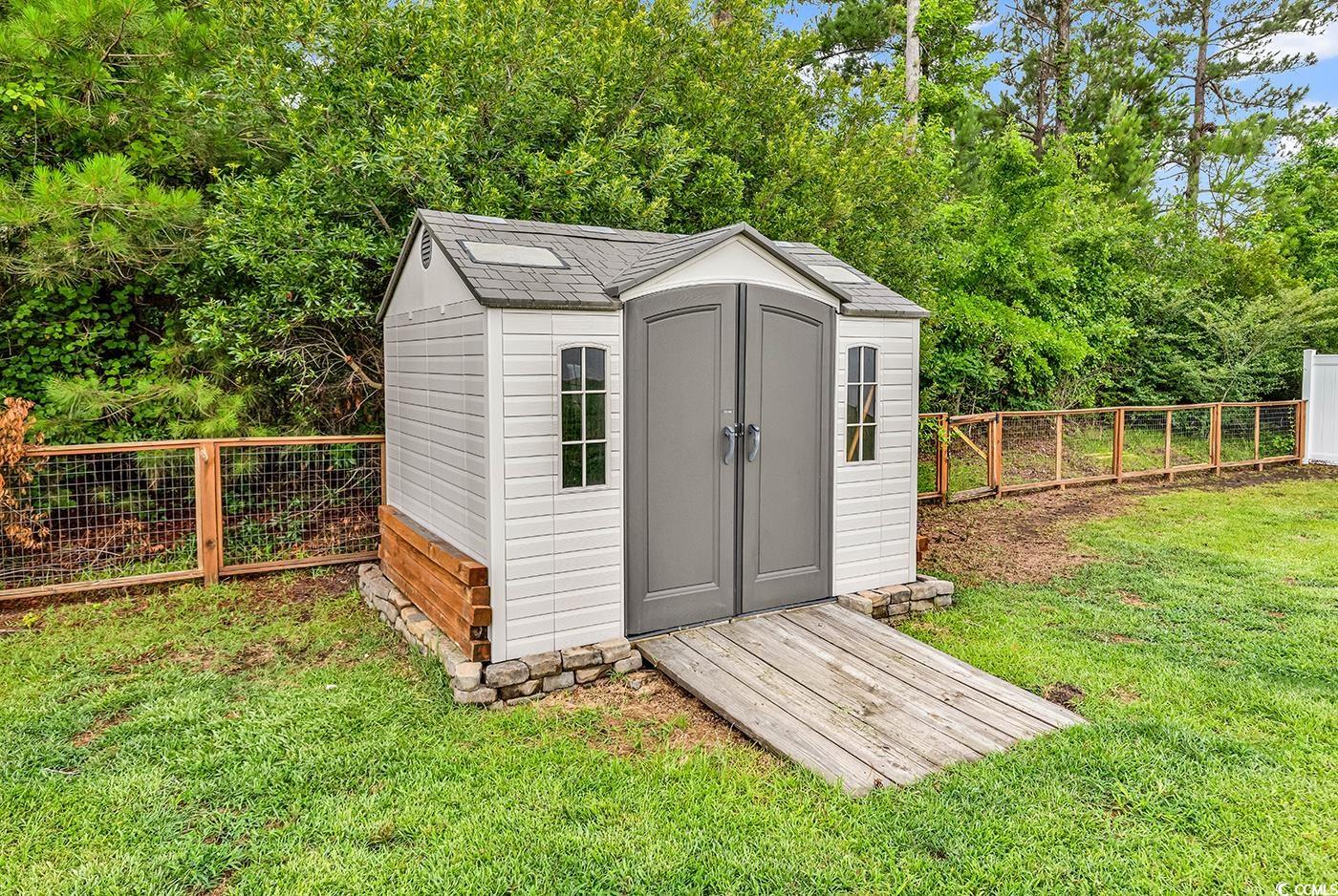 Come and see this gorgeous 4 bedroom, 2.5 bathroom home in the highly sought after Reflections community! Situated on a large fenced in lot backing up to trees, this home offers a spacious, open gathering area and generous bedrooms! As you enter the home, there is a convenient half bathroom on the first floor and stairs leading to the second floor. The living room, dining area, and kitchen all flow seamlessly, for plenty of space to gather together and to entertain. The kitchen boasts stainless steel appliances and a gas range, with granite counters and a large pantry. You'll also find storage under the stairs that has been opened up and that the sellers are using as an office area too! Sliding glass doors lead to an extended paver patio and huge backyard that is already fenced in with a storage shed. Traveling upstairs, wooden stairs and floors open up to four bedrooms, two full bathrooms and a laundry room with even more storage. The primary suite has an ensuite full bathroom with dual sink vanity, step in shower, water closet, and linen closet, and an impressive walk-in closet with built in shelving. Three additional bedrooms are found upstairs and a second full bathroom with a dual sink upgraded vanity. This home has everything you need and want, including being part of a small neighborhood with a community pool and fitness center. Part of the Carolina Forest school district and just minutes to downtown Conway, and International Drive, make sure you take the 3D tour and schedule your showing today!