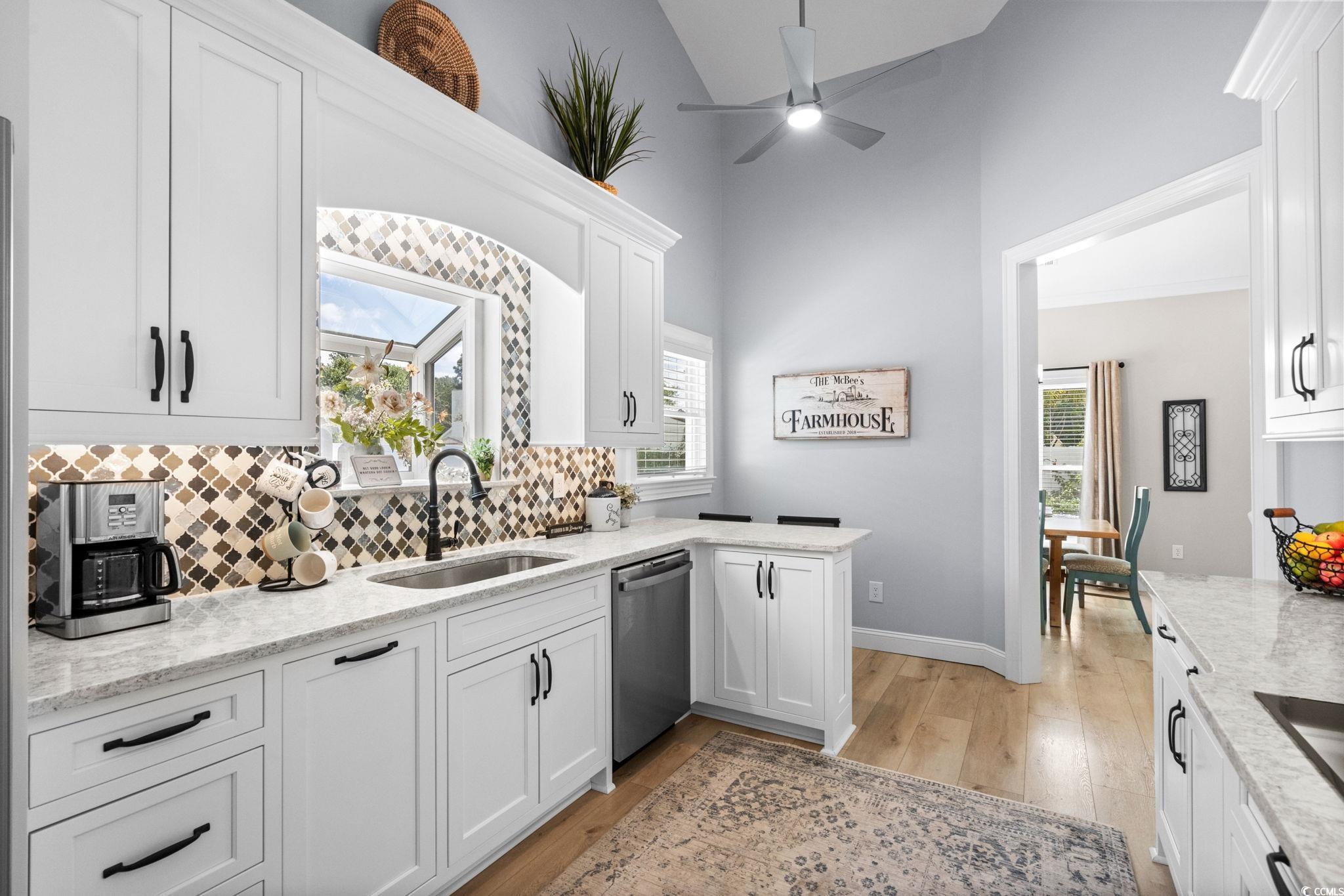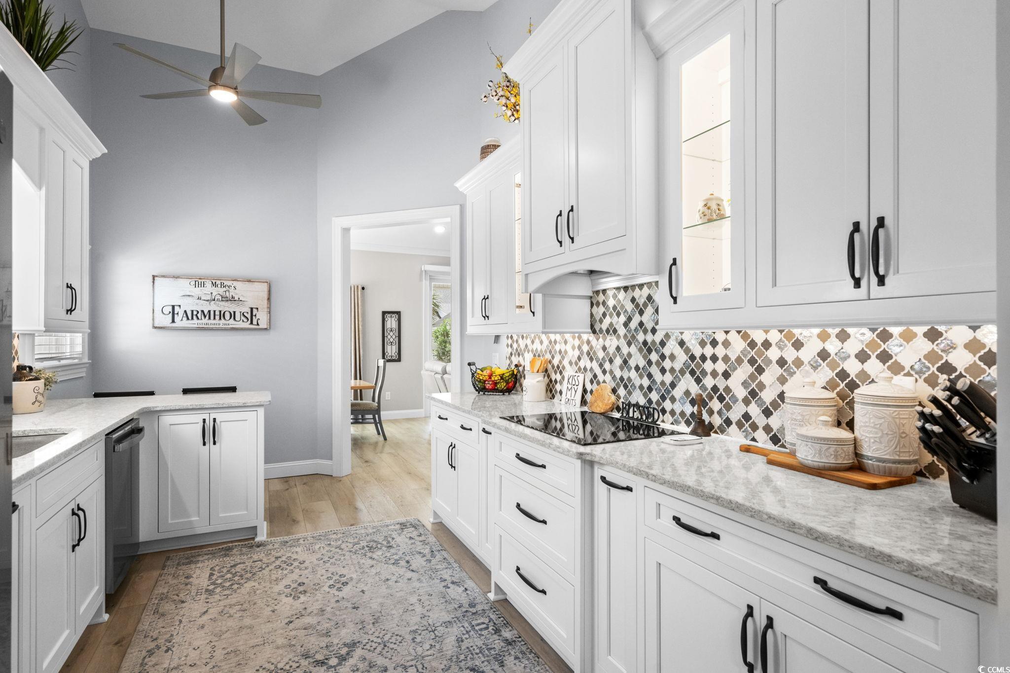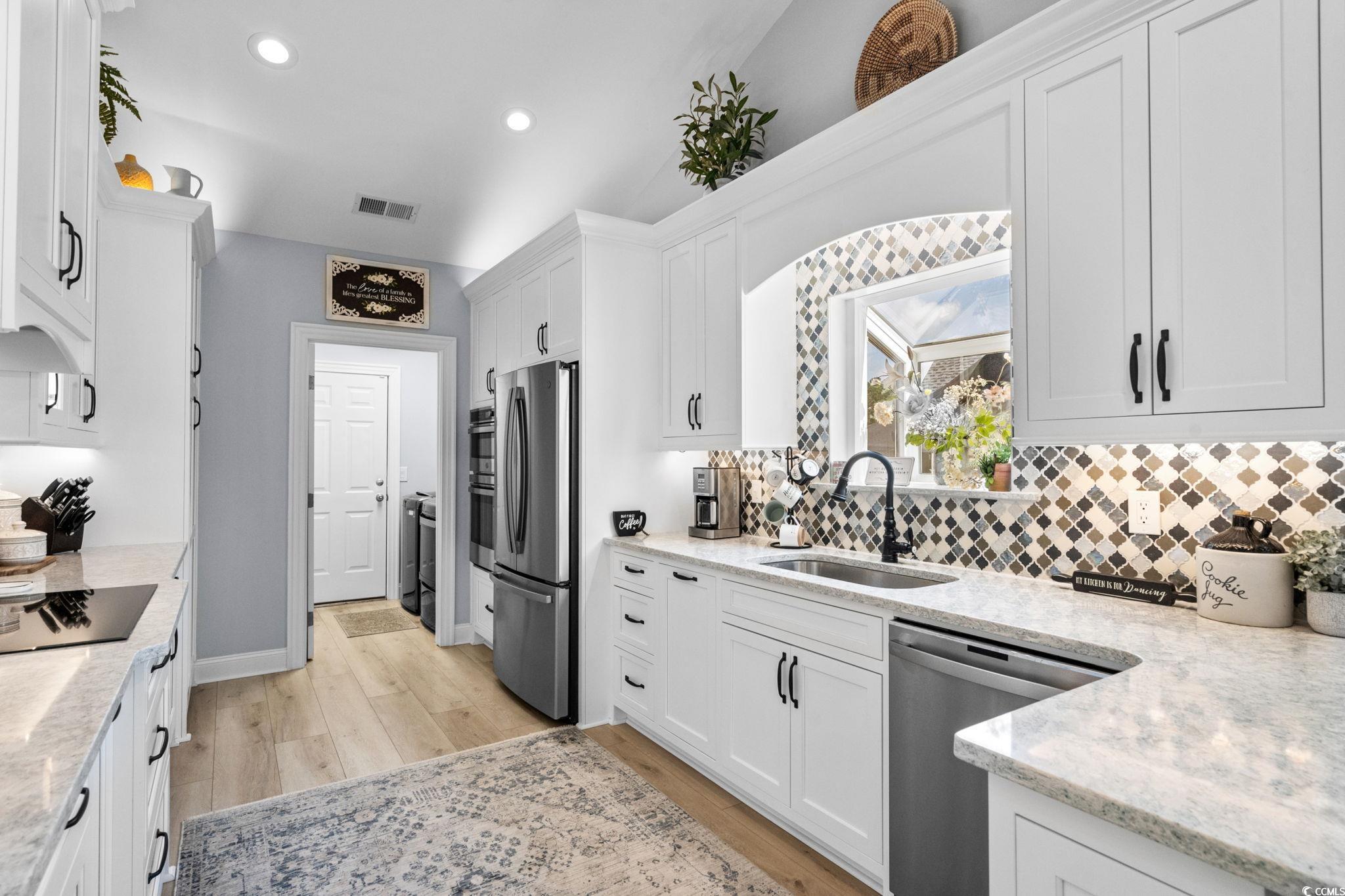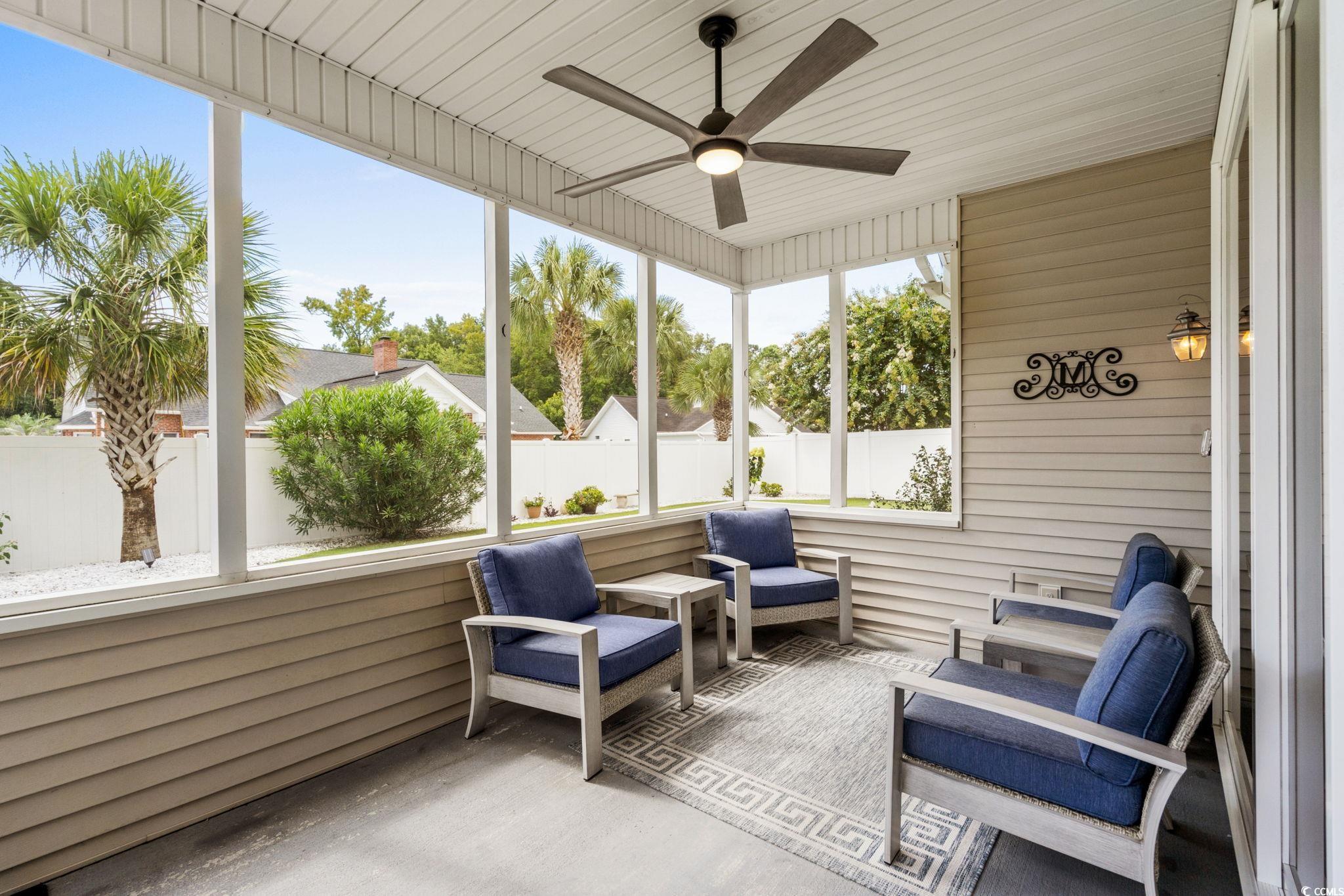 Exquisite totally remodeled and updated single family home in the convenient to everything neighborhood of Brandymill in Myrtle Beach. Owner has spared no expense remodeling / updating this home. The exceptional kitchen has McKenzie custom designed and fabricated, remote controled LED lighted cabinets with quartz counter tops and tile back splashes. Built-in stainless, GE profile appliances include a convection microwave oven, a regular oven, dishwasher and cooktop. The built-in GE stainless refrigerator is double door on the top with freezer on the bottom. The LVP floored, open dinning / living room area features a Samsung 75 inch framed, picture TV and a large Pella 8 foot sliding glass door with sliding solar shade pannels covering the entire glass area to protect from ultraviolet light when wanted. The sliding glass door opens to a 10 x 12 screened porch that looks out at the Brumuda grass back yard that is fully landscaped with uplighted palm trees, lush bushes and a stone fire pit. The grass is watered by a 4 zone sprinkler system that has a Rain Bird controler that can be monitered with an app on your smart phone. The master bedroom has extensive natural light from the combined 3 windows on one wall. A custom designed shelf and hanging rack walk-in closet and seperate linen closet is capable to store all your personal clothing items and linens. The onsuite tiled floor master bathroom has a handicap accessable tiled to the ceiling and glass shower with 2 hand held shower fixtures and a seperate stationary rain fixture. Four seperate neiches are set into the tile for storage of and easy access to your grooming items. The custom designed and farbricated vanity by Deluxe Art provides all the space necessary for storage of personal items. The large, full width backlit mirror over the vanity can be dialed up or down for the amount of light desired. The home has two other bedrooms with several windows flooding the rooms with natural light and a closet in each. The second bathroom has a tiled bathtub, tiled floor and vanity also created by Deluxe Art. The entry to the home has an Anderson storm door with slide down screen for fresh air on those nice Spring and Fall days and also a double side lighted entry door. The attached double car garage has an Epoxy floor with an accessable pulldown stair attic that is plywood floored for all your storage needs. The insulated garage door has tinted glass and comes with an app to open and close from your smart phone from wherever your travels take you. There is a ring camera over the garage door for the UPS or FedEx delivery person to let you know he has a package to deliver. You are able to open the door from your phone, let him put the package inside the garage and then close the door. The new driveway and walkway are concrete patern stamped and driveway large enough for parking of several vehicles. Next to the home is another concrete paved area for storage of a boat or travel trailer behind the six foot fence that surrounds the side and back yard. The home owners association bylaws allow a boat or travel trailer to be stored behind a six foot fence. On the side of the home, extended from the kitchen, is hot and cold water and drain piping that will allow you to add an outdoor sink if wanted. An electric outlet has been added to charge the battery of a boat or travel trailer. Behind the concrete boat or trailer storage area is a 10 foot by 12 foot storage shed for your tools and landscaping items. The three year old Trane high effeciency HVAC has been serviced and maintained every six months with documentation. Every window in the home has been replaced with new tinted glass windows. This lovely LVP and tile floored home is extemenly well kept, exceptionally clean and ready for immediately occupancy. Have your personal real estate professional show you this exceptional home today.