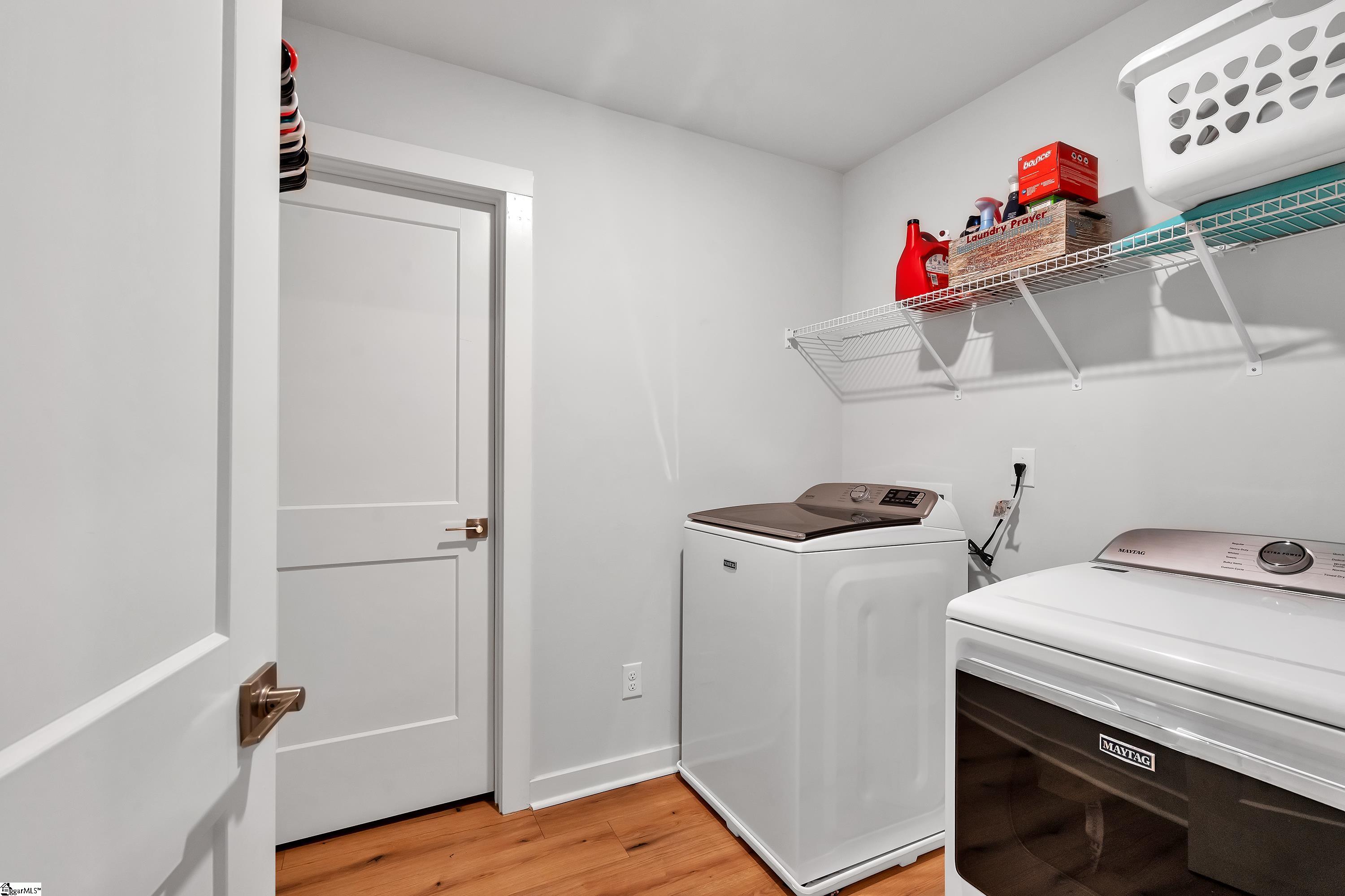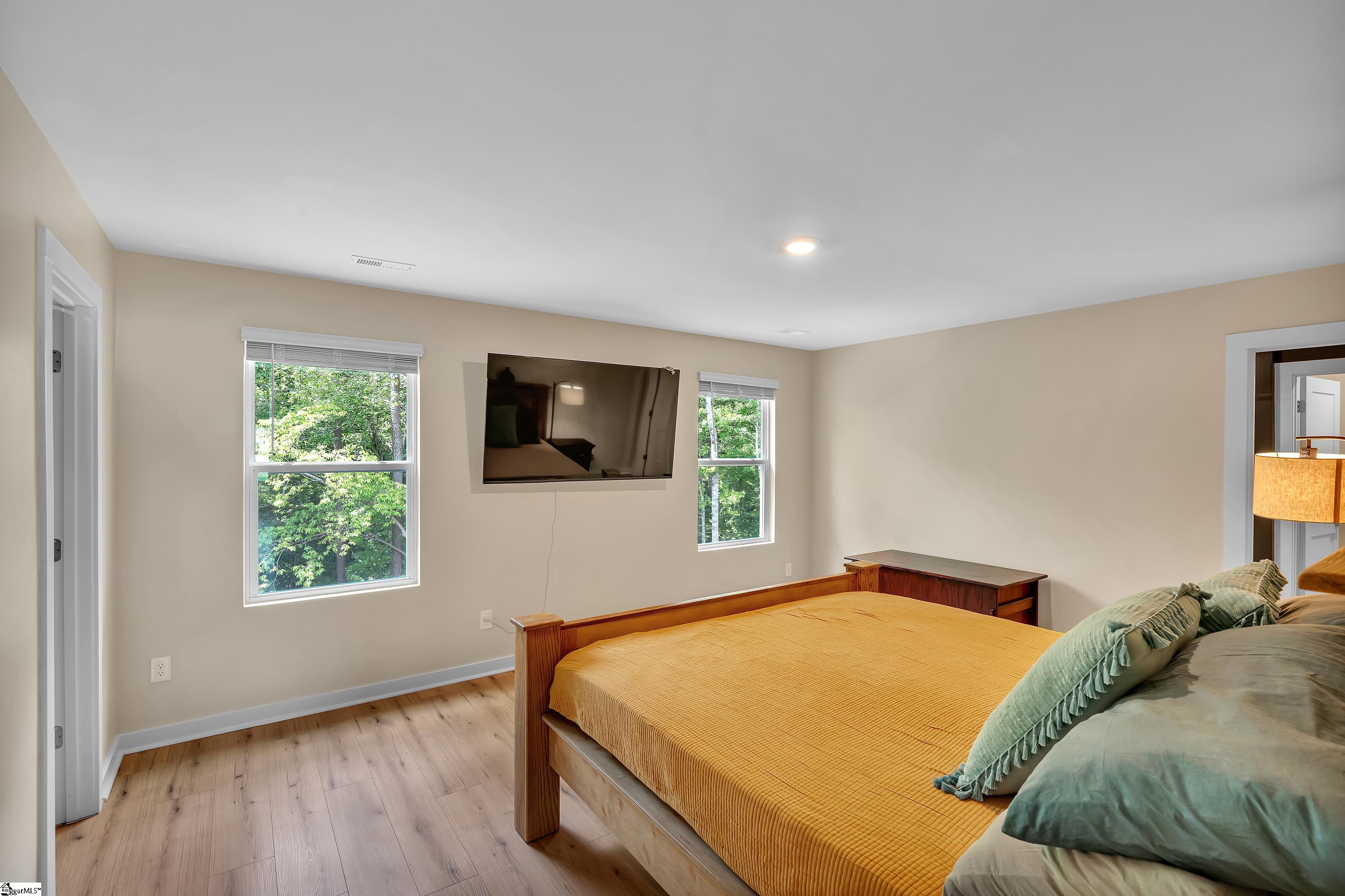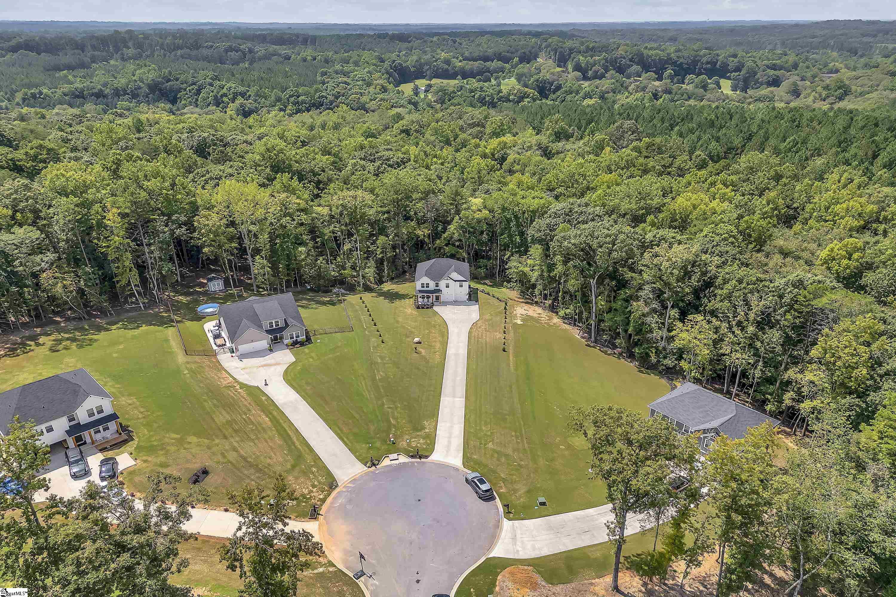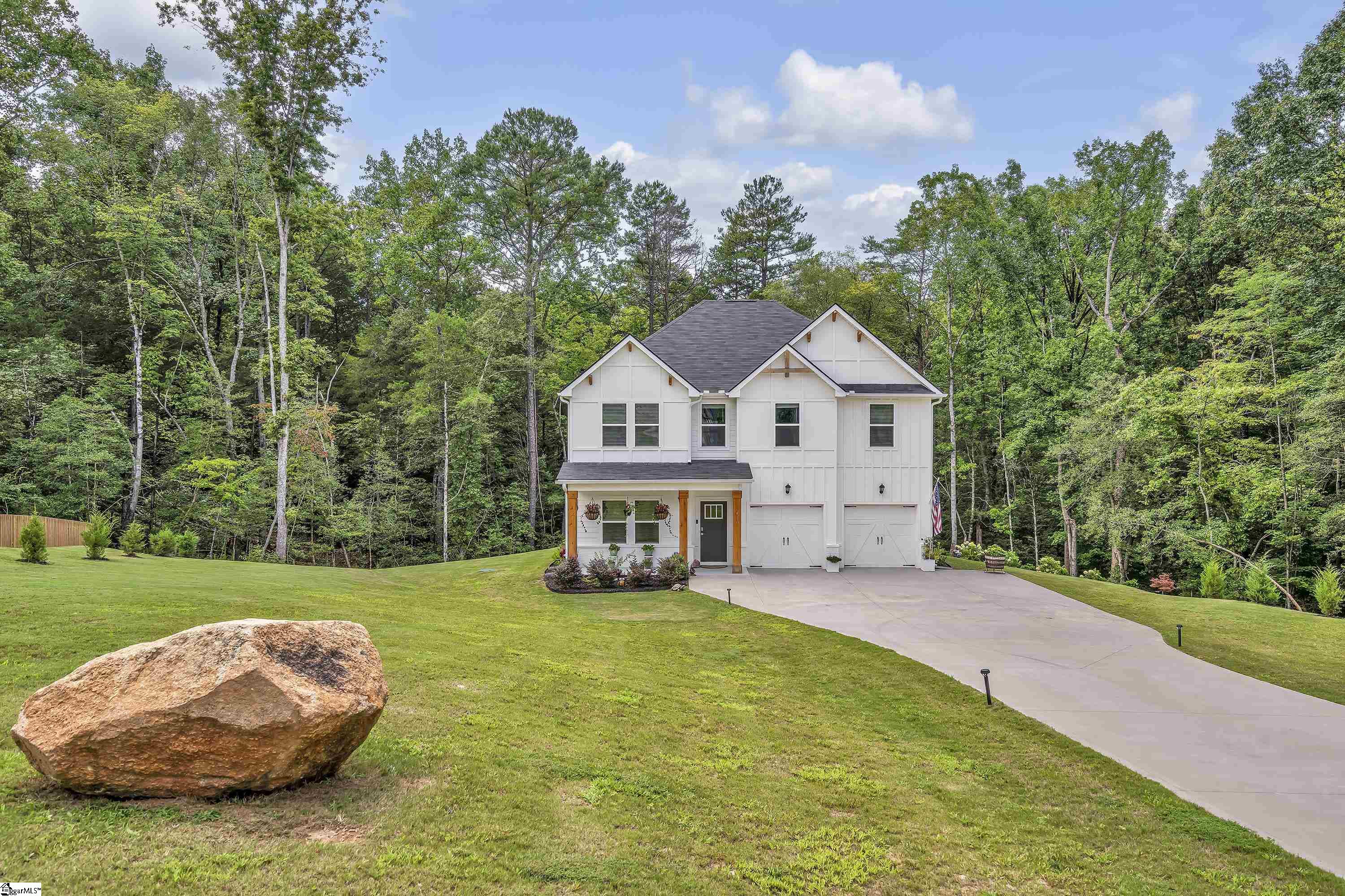 Welcome Home. Wonderful home nestled in over 6 acres for peaceful living. Long driveway is great for a party of cars. Walk into the foyer with an office to the left with a Murphy bed. Full bath on first floor. Perfect for your visiting relatives. Stroll into your kitchen with upgraded appliances that include Profile double ovens - perfect for large crowd cooking and a smooth cooktop for a clean look. Upgraded LG thinQ fridge. Walk-in pantry. Kitchen overlooks living room with a contemporary electric fireplace. Outback the owners have added an expansive deck with planter boxes and a lovely screened porch to enjoy your morning coffee or evening sips. Evening fires in the firepit. Stroll out back through basically your own park with trails and follow the path through the woods all the way to Tyger River. Owners have placed a sturdy removable bridge over the stream for easy access. Don't forget the shed to match the house for all of your outdoor supplies. Enjoy privacy and peace yet 15 minutes from shopping and close to all freeways. Upstairs you have 4 additional bedroom and a fantastic rec space. Primary bedroom windows face your woods with complete privacy. Primary suite includes: bath, separate shower, double vanities, and owner has added clever shelving to hold everything. Of course, walk-in closets. Two of the bedrooms attach to a shared bath. Upstairs you will also find a large laundry for convenience and extra storage. Washer and Dryer included. LVP flooring throughout with wood stairs. This home truly has it all. Just move in!