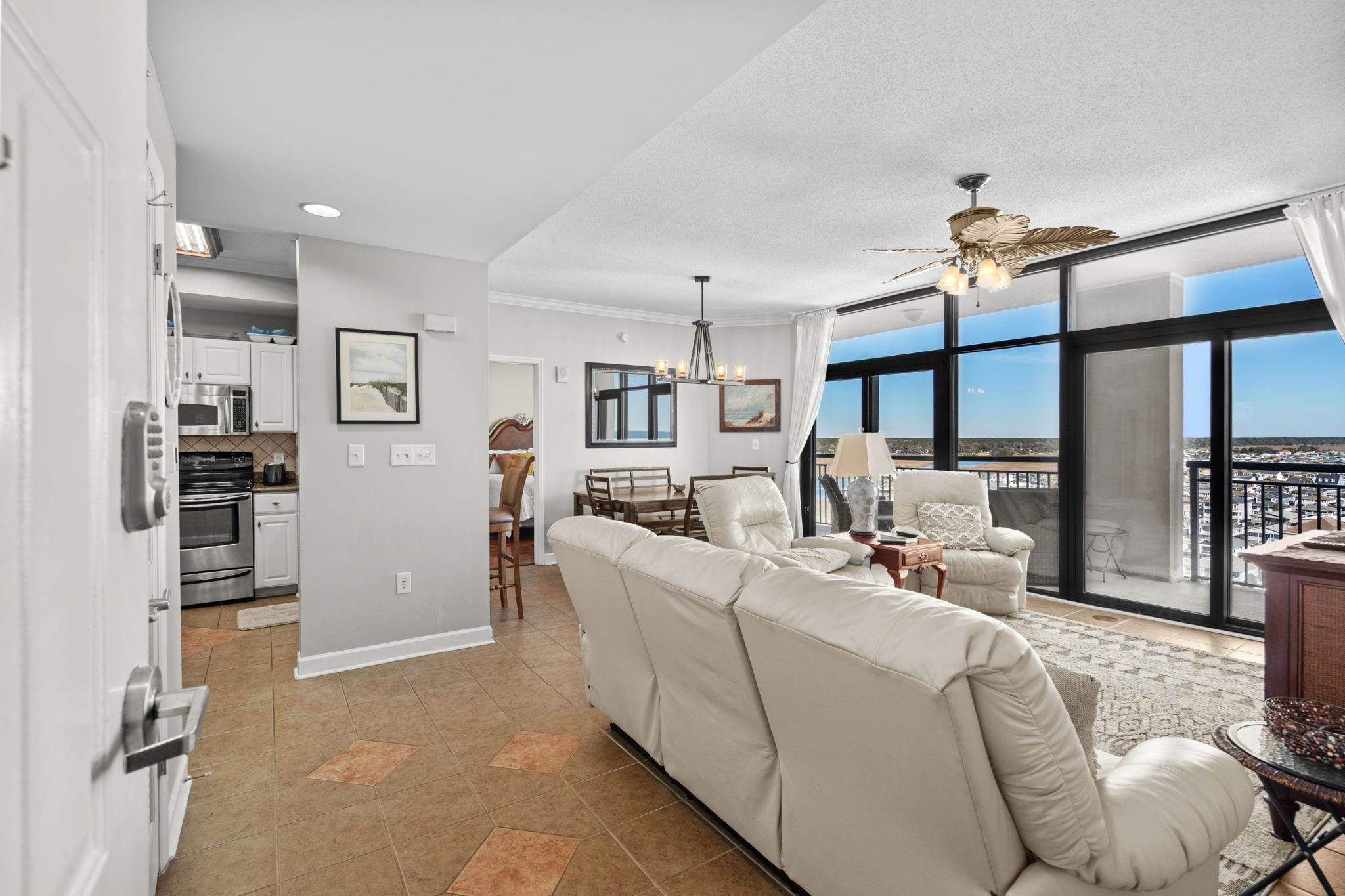 Stunning northern views of the beach and/or Cherry Grove area from every room of this rare Penthouse level 2 bedroom end unit condo. Enter the roomy parking garage and take the elevator up to the PH floor, open the door and just WOW! The views in every room are simply breathtaking through the large windows or floor to ceiling patio doors. Sit on your extra large balcony and watch the morning sunrise, or from your bed in the expansive primary bedroom suite that looks out over the ocean. Access this larger balcony from both the bedroom and the living room. The second bedroom is also large enough for the two queens and has amazing views of the marsh, including spectacular sunsets. Cook family dinners in the roomy and updated bright and sunny kitchen. This penthouse unit has amazing privacy with only the living room wall sharing a closet wall of the adjacent unit and of course there is no one above you! Walk across to the beach and amenity center that includes both an indoor and outdoor pool, exclusive owner use exercise room, meeting room, bathrooms, showers. Rental history is available. This turn key condo is sure to please the whole family!