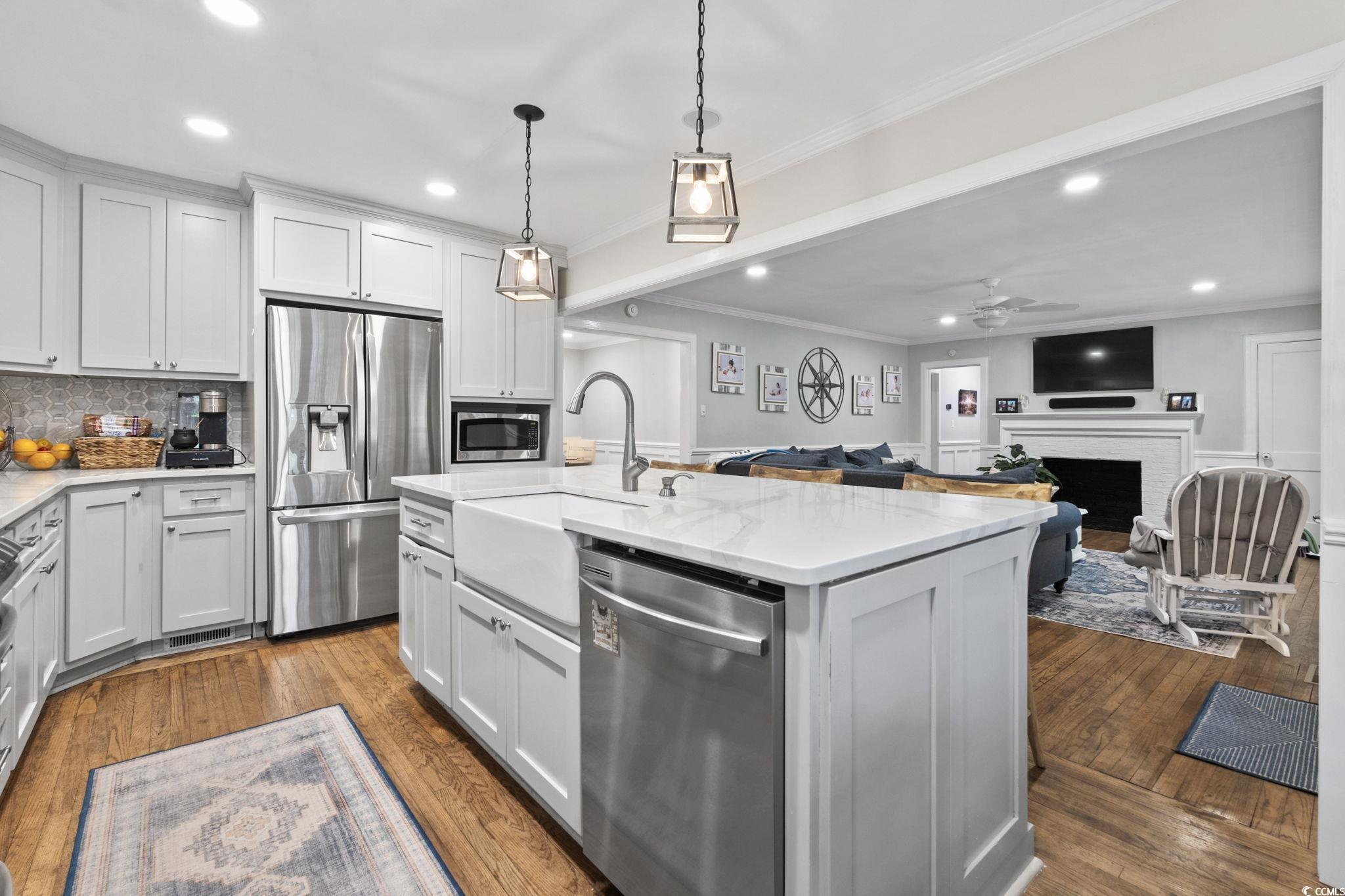 OPEN HOUSE - NOV 8, 12-3pm. Here is the one you’ve been searching for! Oceanside of Hwy 17 Business in Myrtle Beach, totally renovated, mother-in-law suite, screened porch, oak trees, and a short flip flop walk to the beach. This nostalgic yet modernized 4-bedroom, 4-bath property (which includes a newly added 1-bedroom, 1-bath mother-in-law suite) perfectly blends timeless charm with today’s comforts. Originally built in 1946 and fully renovated from the ground up in 2019, the home offers peace of mind with extensive updates including all-new plumbing, electrical, sewer/electrical mains to the street, premium-grade shingles with structural roof reinforcements, Low-E impact-rated windows, updated insulation in both attic and crawlspace, and a high-efficiency 18 SEER HVAC system with variable speed air handler. Interior finishes showcase quartz and marble details, refinished original hardwood floors, plantation shutters, crown molding, wainscoting, and custom architectural woodworking that honor the home’s history while delivering modern luxury. Additional upgrades include a natural gas tankless water heater, whole-home water filtration with booster pump, circular driveway, 8-zone irrigation, and custom fencing with gated golf cart access. In 2021, a rear building was added featuring spray foam insulation, impact-rated windows and doors, Cat 6 internet, generator transfer switch, mini-split HVAC, and its own tankless water heater—designed to serve as a hurricane-ready “lifeboat” or versatile bonus space. Outside, the fenced yard includes Astroturf play areas, pet/child-friendly zones, and a movable golf cart deck. Perfectly located just minutes from the beach, shopping, restaurants, and entertainment, this property offers not only a beautiful home but also a lifestyle in the heart of Myrtle Beach. Don’t miss your chance to make this rare find your own!
