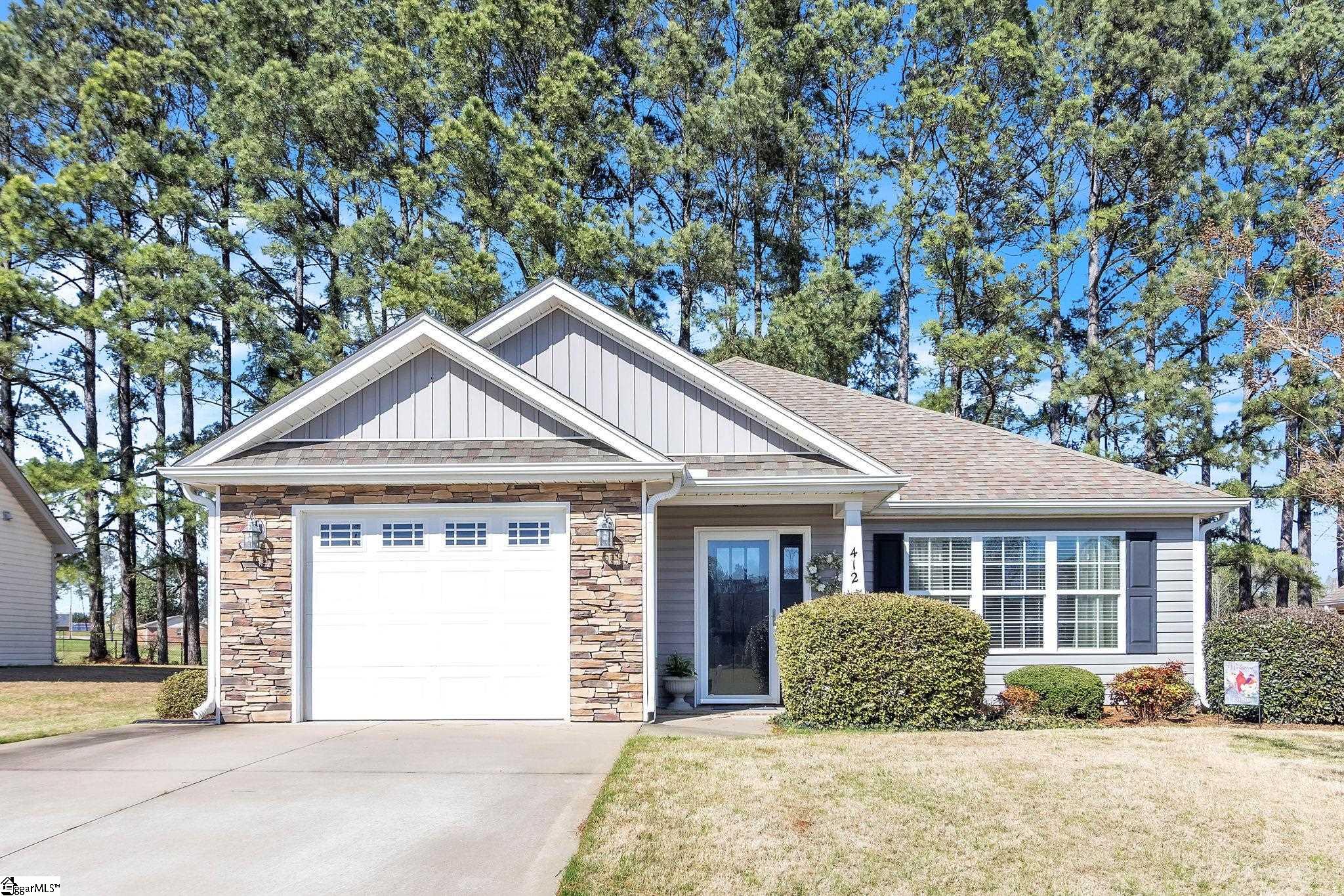 Enjoy the ease of single level living in this well located 2bedroom home in desirable 55+ community. Designed for low maintenance living, this property offers comfort, convenience, and a fantastic, central location between Greenville and Spartanburg. The monthly HOA Includes utilities, lawn maintenance and call system with pendant, making this the perfect place to retire and enjoy and easier way of living. The home features an open floor plan with two spacious bedrooms and two full baths. The outside features a front stoop, attached garage and a cute screen porch perfect for relaxing!
