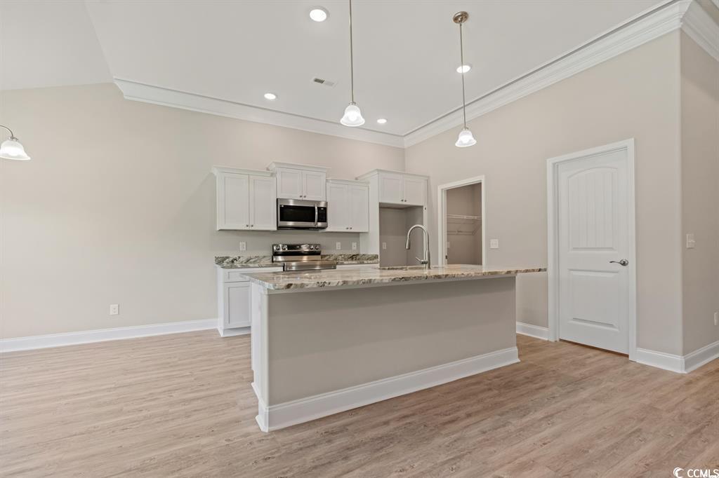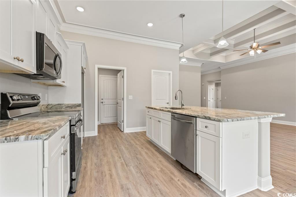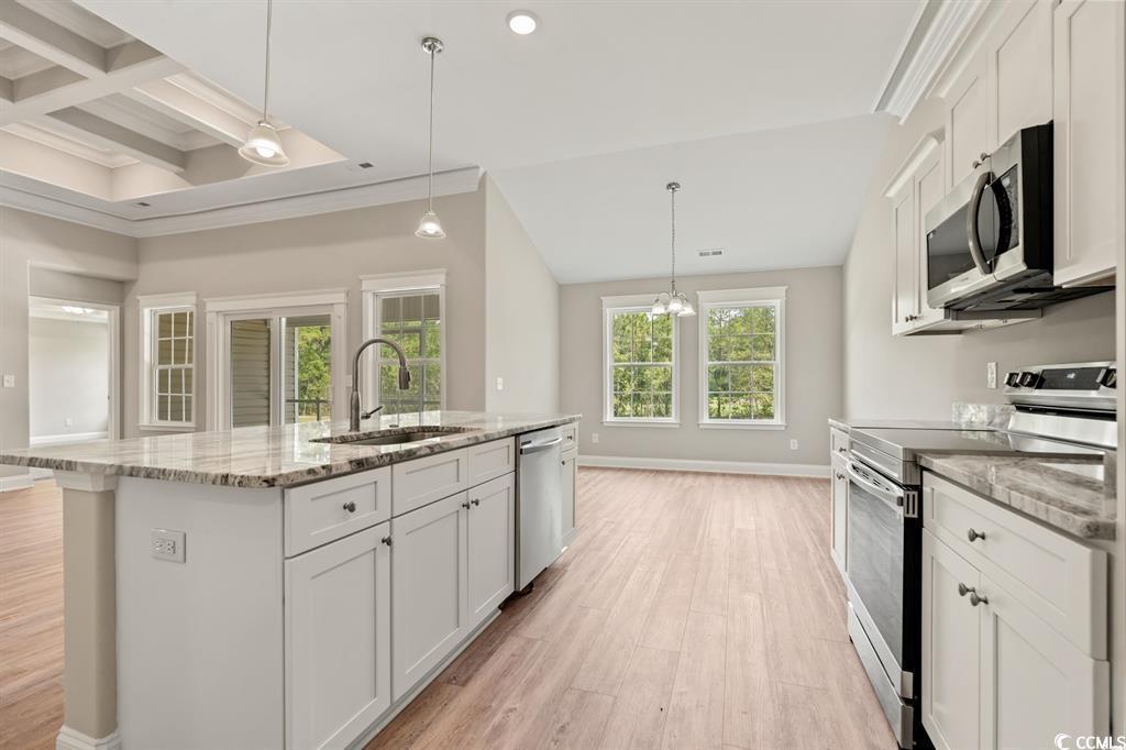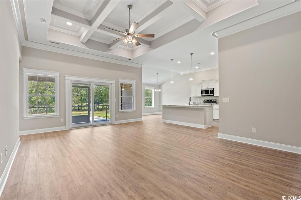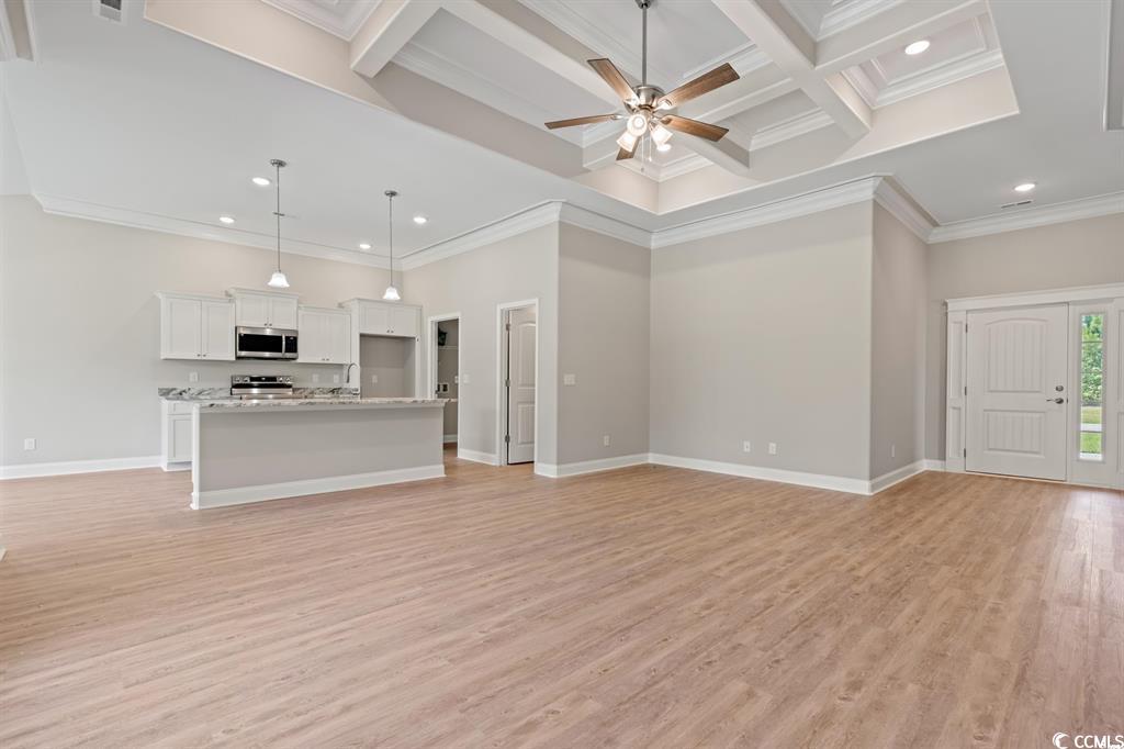 Fantastic Opportunity to Own the Popular Pelican A Floor Plan in Carolina Shores! This beautifully designed 3-bedroom, 2-bath home sits on an oversized lot and offers a well-thought-out split-bedroom layout with stunning attention to detail throughout. From the moment you step inside, you'll notice the upgraded features—coffered ceilings, extensive trim work, and an open-concept living space perfect for both everyday living and entertaining. The gourmet kitchen is a showstopper, featuring 42-inch white cabinetry, a spacious center island, and a walk-in pantry. Adjacent is a designated laundry room with direct access to the 2-car garage, which includes attic storage for added convenience. The primary suite is tucked away at the back of the home for privacy and showcases tray ceilings, a walk-in closet, and a luxurious en-suite bathroom complete with a custom tile shower and dual vanities. Two additional bedrooms are located at the front of the home, sharing a full guest bathroom and multiple storage closets. Step outside to enjoy the screened-in back patio—a perfect spot to relax and enjoy the beautiful Carolina weather year-round. Located right on the NC/SC border, Carolina Shores gives you easy access to both Calabash and Little River, offering a variety of local restaurants, pristine beaches, and championship golf courses just minutes away. Don't miss your chance—ask about our lot and home packages today!