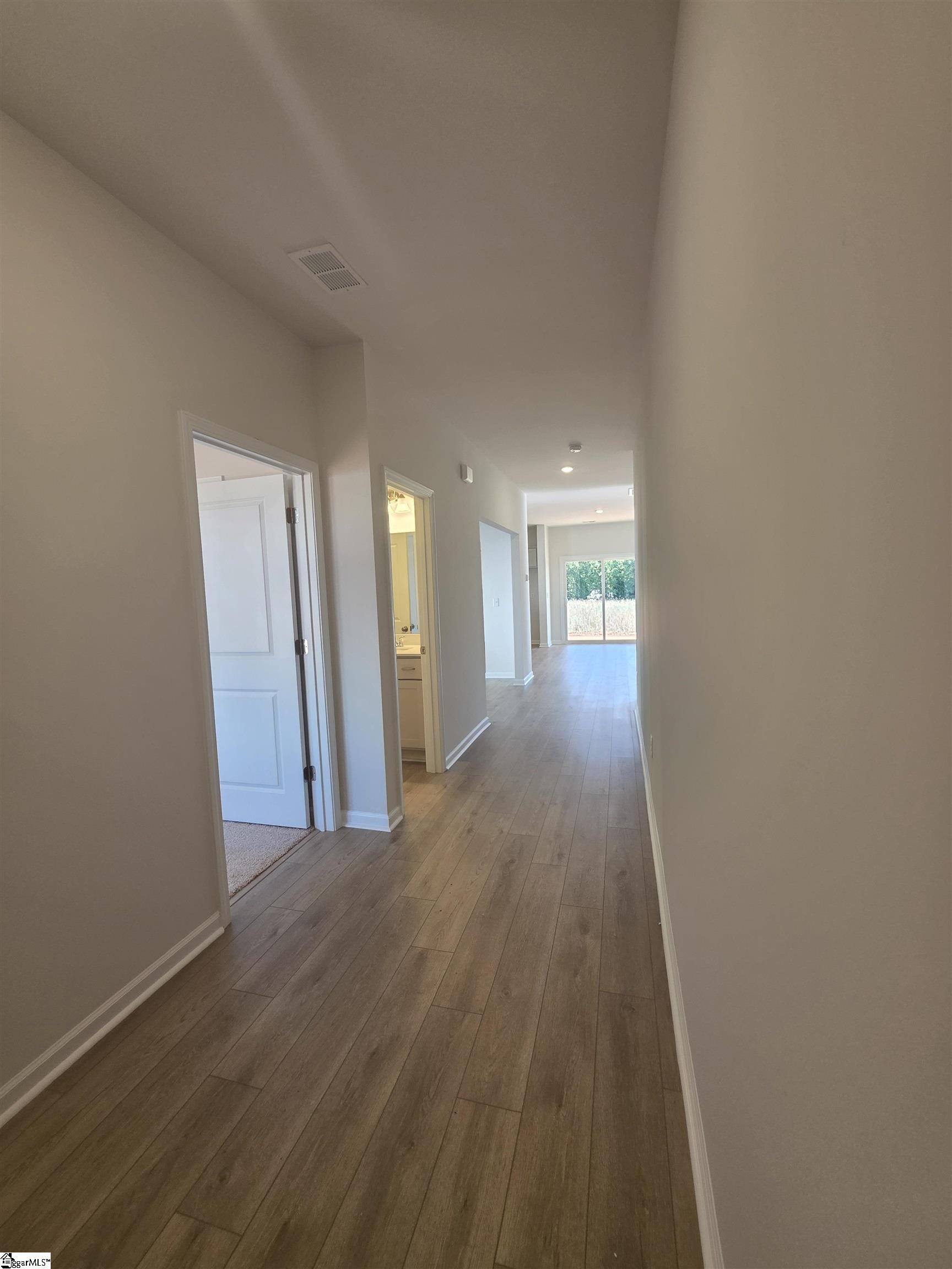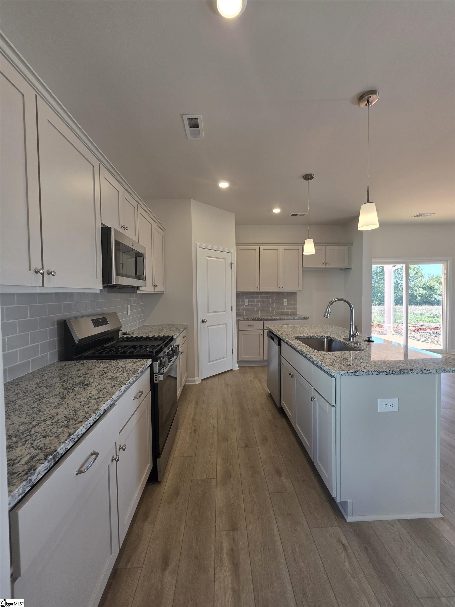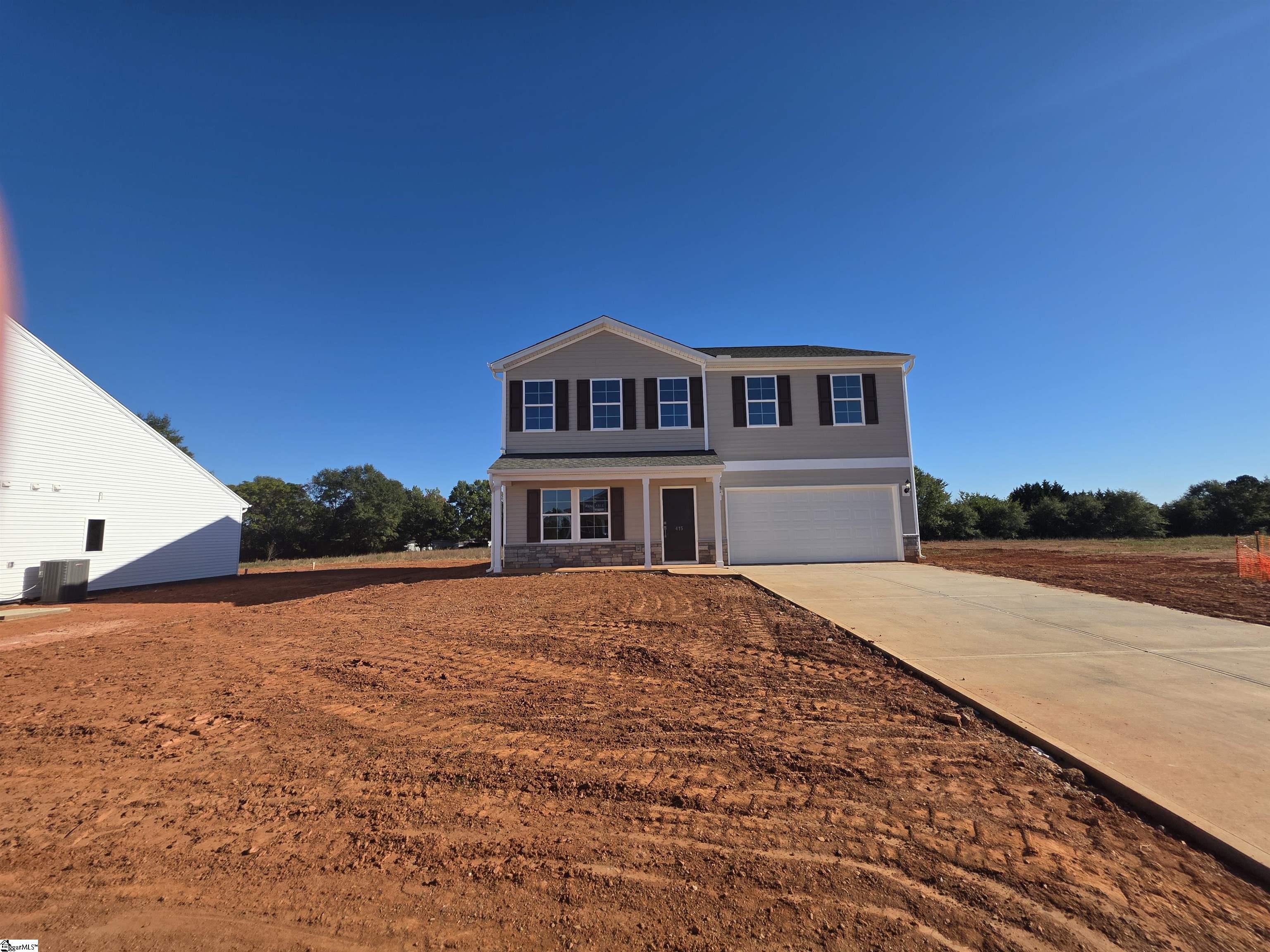 The welcoming front porch, warm exterior vinyl colors, and charming stone accents will catch your eye. As you enter the home, you'll notice the luxurious soft beige vinyl plank flooring that extends throughout the common areas on the lower level. Off the foyer, there’s a downstairs bedroom accompanied by a full bathroom—perfect for an overnight guest or as a home office. Hosting gatherings will be a breeze in this open-concept layout. The upgraded kitchen seamlessly connects to the dining and family rooms, and any chef in the family will appreciate the shaker-style cabinetry, granite countertops, and stainless-steel appliances. From the kitchen, you can access a covered back porch that overlooks a spacious backyard. Heading upstairs, you'll find a generous loft area. All three secondary bedrooms offer ample closet space and share a beautifully upgraded bathroom featuring dual sinks and quartz countertops. The primary suite is sure to become your oasis, complete with a large five-foot shower, dual sinks with a quartz countertop, and plenty of storage. Come visit Dove Hollow today to see this beautiful home!