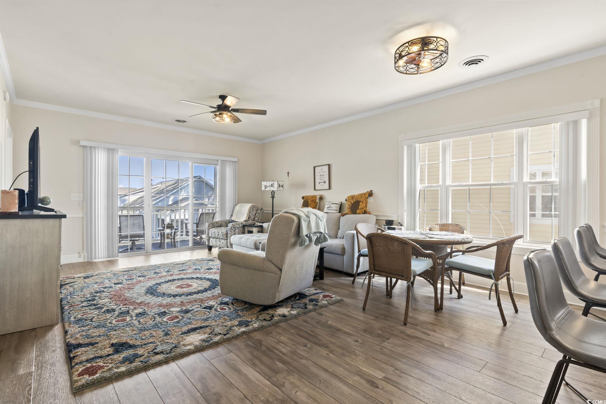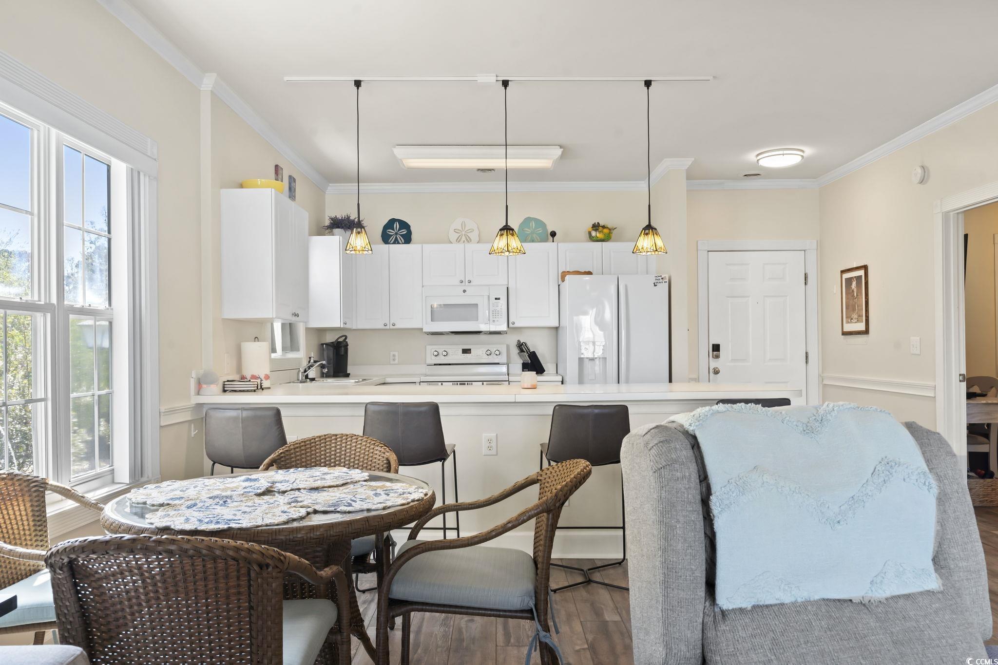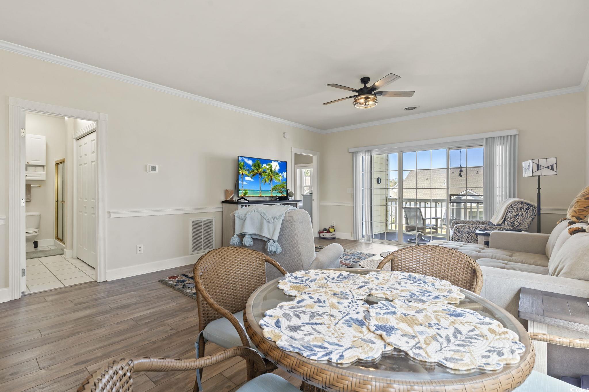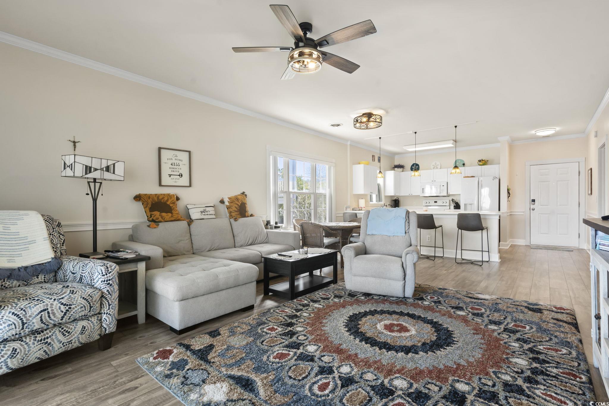 Nestled in the sought-after community of The Gardens at Cypress Bay in Little River, SC, this exceptional 2-bedroom, 2-bathroom condo offers the perfect blend of comfort, convenience, and coastal charm. Situated on the second floor, this bright and airy residence welcomes you with an open-concept living space designed for both entertaining and relaxation. The well-appointed kitchen boasts ample white cabinetry, a charming window for natural light, and a breakfast bar that seamlessly connects to the spacious dining and living areas. Sliding glass doors lead to a fabulous covered balcony, where you can unwind with a morning cup of coffee or enjoy the evening breeze. The primary suite is a true retreat, featuring a large walk-in closet and a private en suite with a tub/shower combination and vanity. The guest suite, located opposite the primary for added privacy, also includes an en suite bathroom, making it perfect for guests. Additional highlights include crown molding, chair rail detailing, smooth ceilings, and ceiling fans in every room, adding to the home's elegance and comfort. Enjoy the well-maintained community pool, perfect for soaking up the sun or taking a refreshing dip. Located just minutes from the pristine beaches of North Myrtle Beach, as well as fantastic shopping, dining, and entertainment options, this charming condo offers a carefree and convenient coastal lifestyle. Don't miss the opportunity to make this move-in-ready home your own! Measurements are not guaranteed. Buyer is responsible for verifying. Please ask your agent about lender closing costs incentives for this property.