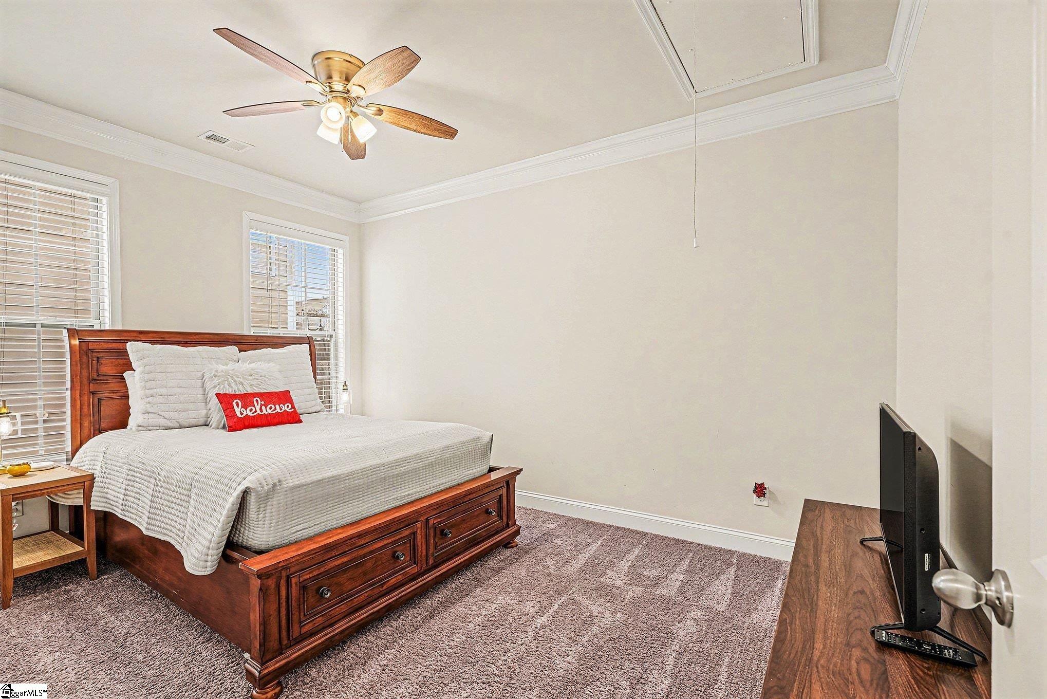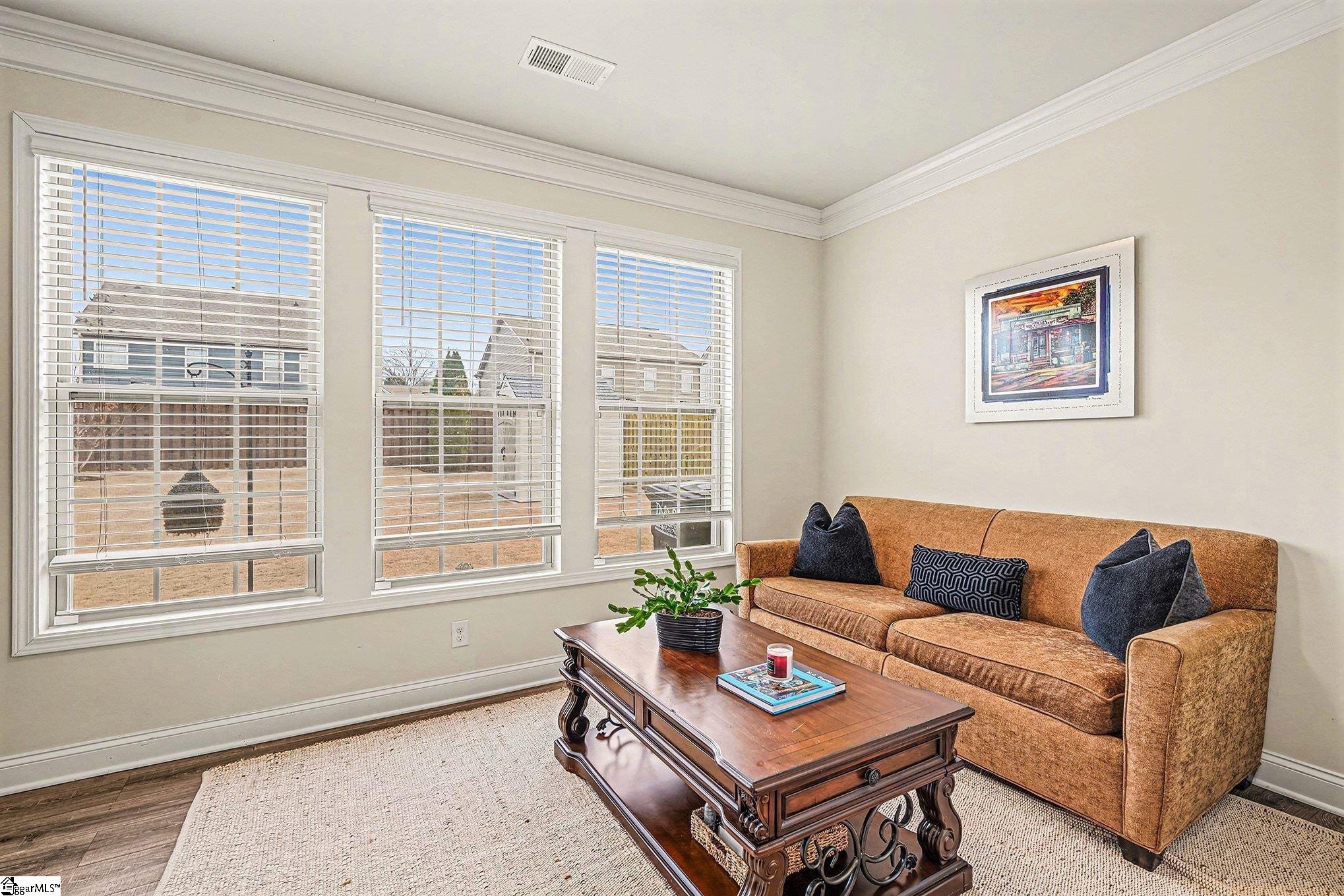 Welcome home to this beautifully maintained ranch style home. From the moment you step through the double front doors, you're greeted by a spacious foyer with trey ceiling that opens into a light filled, open concept living space designed for comfort and everyday living. Upscale finishes and details will elevate your lifestyle with beautiful trim/moldings, designer lighting and plumbing, transom windows and beautiful wallpaper in powder room. Great Room features soaring ceilings and a cozy gas log fireplace open to the kitchen with granite countertops, abundant cabinetry, gas stove and a large peninsula ideal for casual dining and entertaining. A formal DR offers flexibility for gatherings, while a private office with glass French doors provides the perfect work from home or flex space for workout room, playroom etc.. In addition, a light filled sunroom provides an inviting space filled with natural light for a den that can be used for family gatherings, entertaining or relaxing at home. Covered back porch overlooks level, fenced backyard. Primary suite features trey ceiling, dual sinks, walk in closet, a garden tub and separate shower. Two bedrooms are separated up front with a full bath in their own hall creating privacy. Located conveniently to shopping, dining and award winning schools. Easy access to I-85 with easy commuting to downtown Greenville, Clemson, Anderson and more.