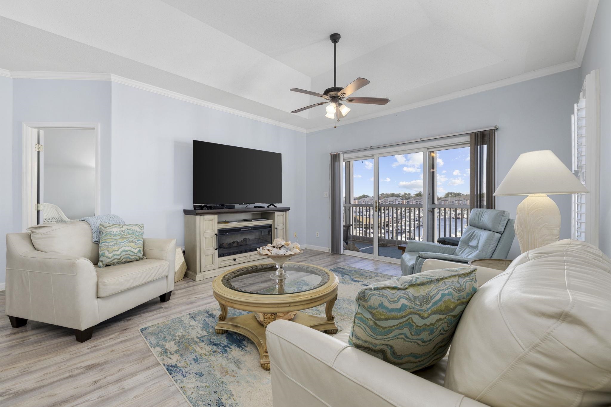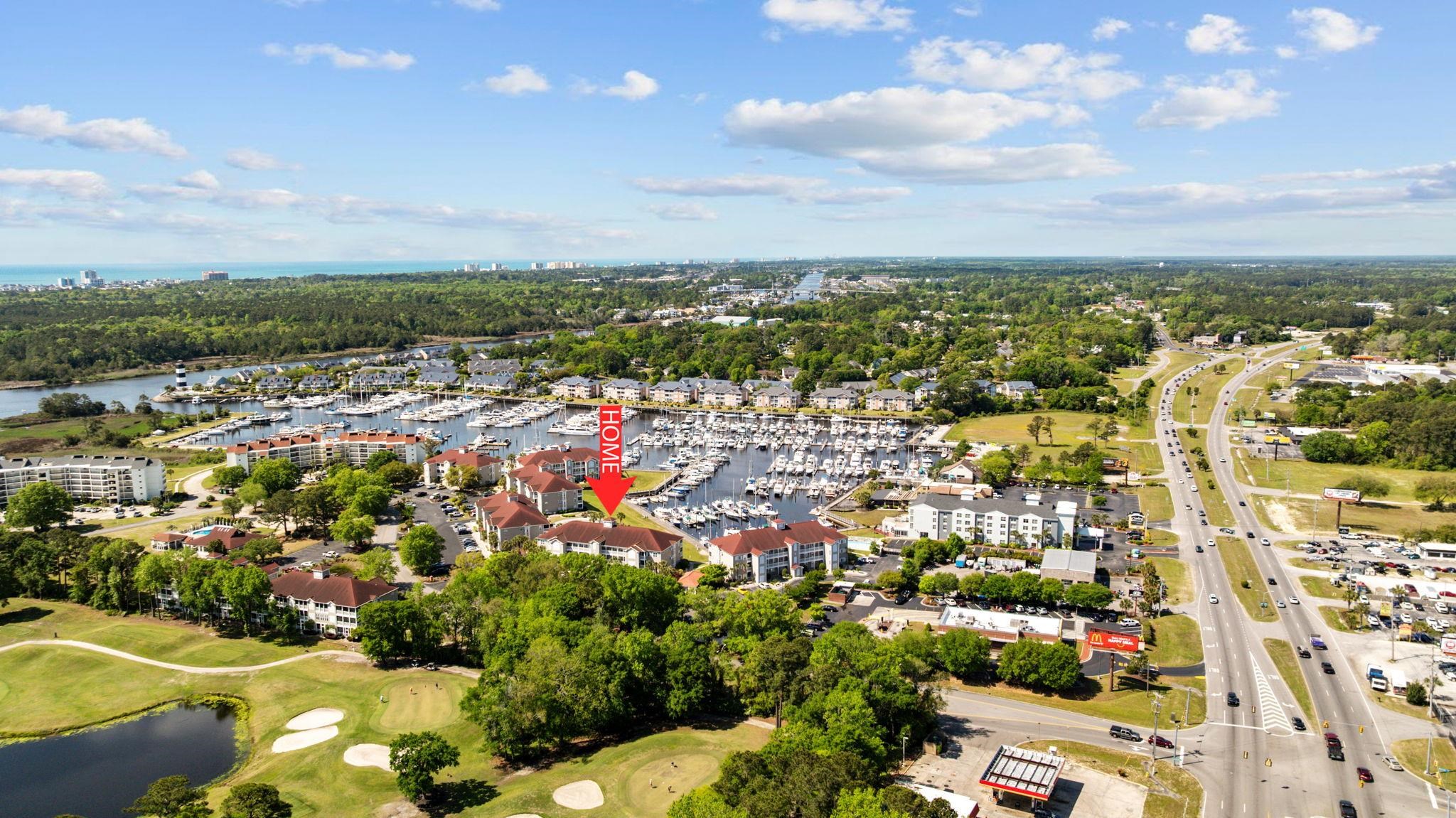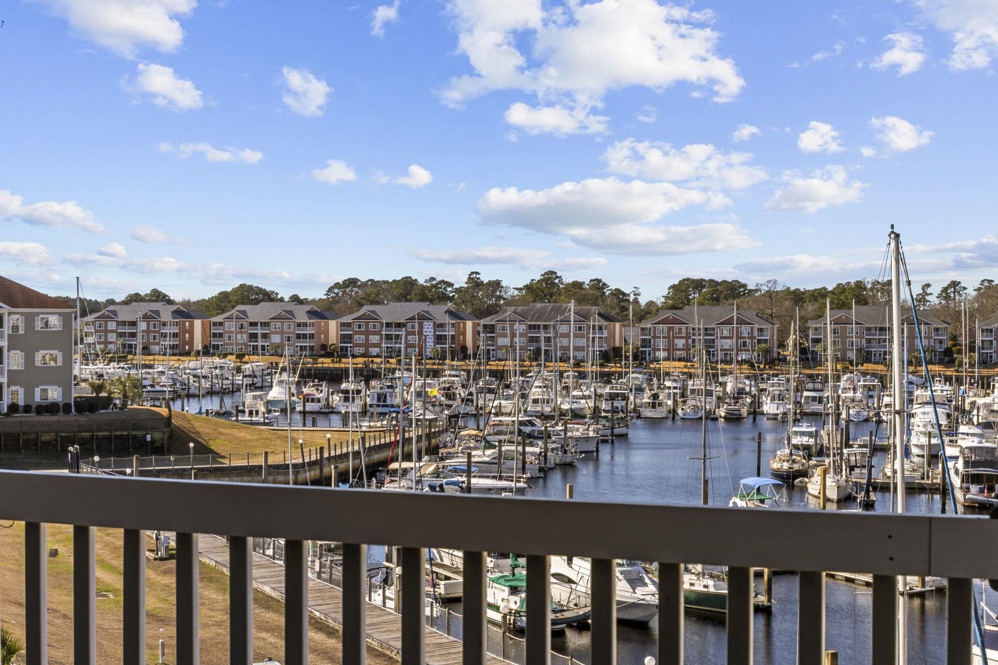 INCREDIBLE VIEWS & COASTAL LIVING AT ITS FINEST! Wake up each day to the sights and sounds of marina living in this stunning top-floor with building elevator, 3-bedroom condo, perfectly positioned in a beautiful waterfront community in the heart of Little River. From your elevated vantage point, enjoy sweeping marina views, and unforgettable sunsets that set the tone for relaxed, coastal living. Vaulted ceilings in the living room enhance the light-filled, open atmosphere, while thoughtful upgrades throughout include luxury vinyl plank flooring, extensive crown molding, plush carpet replaced just 3 years ago, plantation shutters, updated light fixtures, and ceiling fans in every room for year-round comfort. The dining area is highlighted by a charming bay window, creating an inviting space for meals with a view, while the kitchen features a garden window that brings in natural light and marina breezes. Designed for both everyday living and entertaining, the kitchen offers stainless steel appliances, a breakfast bar, easy-close cabinetry, a pantry, tile backsplash, and a convenient stack washer and dryer. The split bedroom layout provides privacy for guests, while the spacious primary suite serves as a peaceful retreat with a well-appointed bath featuring double sinks and granite countertops. One of the true highlights of this home is the extra-large screened porch overlooking the marina, the perfect spot for morning coffee, sunset cocktails, or simply watching the boats come and go. A dedicated storage closet adds convenience without sacrificing views. Step outside and fully embrace the marina lifestyle. Stroll along the scenic boardwalk, relax by the community pool, or take an evening walk to the community lighthouse, a charming waterfront landmark just steps away. Enjoy dining within walking distance at Clark’s Restaurant, and appreciate easy access to everything Little River has to offer. This is more than a condo — it’s a lifestyle defined by water views, coastal charm, and everyday moments that feel like a getaway. A rare opportunity to own a top-floor marina-front home in one of the area’s most desirable waterfront communities. All measurements are approximate. Buyer and buyers agent responsible for verification of all information.