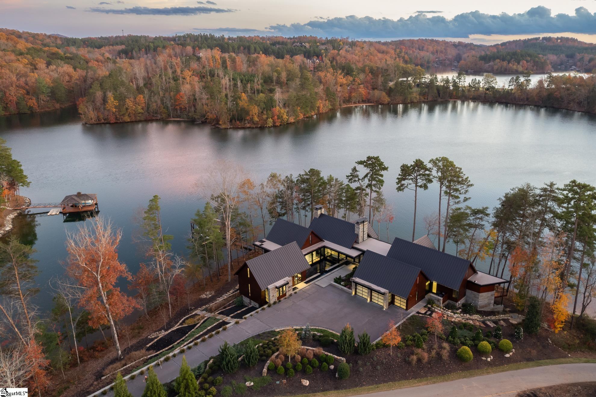 Welcome to 425 Peninsula Ridge, an extraordinary waterfront estate in the prestigious Reserve at Lake Keowee. Completed in 2021, this 6,815 sq. ft. architectural masterpiece exemplifies refined craftsmanship, luxurious amenities, and seamless lakeside living. Set on a prime 1.12-acre point lot with approximately 586 feet of Lake Keowee frontage, this property offers unmatched privacy and stunning, unobstructed views across the water to scenic farmscapes. The exterior boasts hand-cut Maine bluestone and grade 1, clear vertical Western cedar siding, creating a residence that is both distinctive and durable. A sleek 22-gauge standing seam metal roof enhances the home’s longevity while contributing to its clean aesthetic. Architecturally captivating, an 8-foot glass bridge connects the main living area with the gym and primary suite, offering a unique flow between spaces. Solid red oak doors with concealed hinges, finished with a meticulous seven-step process, add to the home's understated elegance. Inside, 425 Peninsula Ridge offers five bedrooms, six full bathrooms, two half baths, an office, a flex room, an elevator, and an array of luxury features. The sophisticated kitchen, prep kitchen, and pantry showcase custom Poggenpohl cabinetry, Miele appliances, a 125-bottle wine cooler, and premium fixtures from Franke and Dornbracht. The primary suite is a private sanctuary, featuring a spa-inspired ensuite with steam and rain shower, sauna, and Poggenpohl cabinetry. Expansive windows throughout frame the serene lake views, while clean lines and a refined, gallery aesthetic highlight the home’s modern design. A recently restained Ipe wood deck offers three covered outdoor seating areas, all with retractable screens and folding doors that merge indoor and outdoor spaces. A dedicated grilling porch with a 42-inch grill, hood, and sink is ideal for lakeside entertaining. The outdoor living areas extend to a custom Ipe dock with a boat lift, kayak storage, EZ port, and pneumatic steps that ease access to the lake. For wellness and relaxation, the property features an ~750 sq. ft. conditioned gym, an inground spa, and a waterfall that cascades into a tranquil zen garden below. Four fireplaces and large-format 48"x48" tiles throughout the upper level (except the gym) add to the home’s modern elegance. Advanced Control4 home automation manages lighting, shades, surround sound, and security. Offered fully furnished, this turnkey property includes a 2021 Centurion Ri245 wake surf boat and a 2022 Sea-Doo RXP-X 300 P Triple Black with iBR, making it ready for immediate enjoyment on Lake Keowee. Embrace an extraordinary lakefront lifestyle defined by beauty, comfort, and sophistication. Schedule your private tour today to experience this rare opportunity for effortless luxury on Lake Keowee.