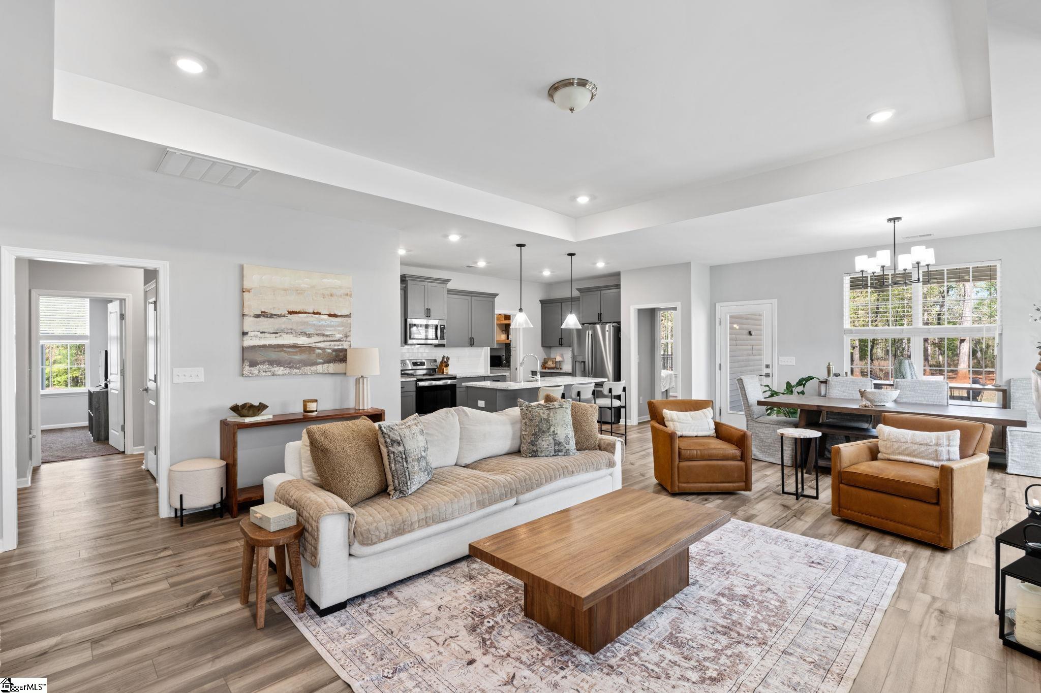 Welcome to 4250 Winding Ridge Lane, a beautifully maintained 2,382 sq ft Craftsman-style home built in 2023 and thoughtfully enhanced with stylish upgrades throughout. This one-level, 3-bedroom, 2-bath home with an office and a bonus room features a desirable split floor plan and sits on a level 0.71-acre cul-de-sac lot with wooded privacy beyond the saltwater pool in the backyard in the sought-after Providence Farm II community. Inside, you’ll find luxury plank flooring throughout the main living areas with carpet in the bedrooms, quartz countertops in the bathrooms, and a bright open-concept layout designed for modern living. The kitchen is a standout with granite countertops, a tiled backsplash, stainless steel appliances, a stainless steel farmhouse sink, and a custom walk-in pantry system installed in 2024, complete with countertops and storage drawers. The living room is anchored by a fireplace with mantle added in 2024, creating a warm and inviting space. A flexible room offers the option for a fourth bedroom, home office, or playroom. The private primary suite features a spa-like bath with a garden tub, separate shower, and a spacious walk-in closet. The laundry room offers exceptional convenience and storage with ample cabinet space, a folding countertop, and open shelving, with direct access from the kitchen and the primary bedroom closet for effortless functionality. Step outside to enjoy the covered back porch and extended sunning patio overlooking a fenced-in 16’x32’ saltwater pool installed in 2024, featuring a watery sun ledge and a depth of up to 5 feet—perfect for cooling relaxation or entertaining. Additional highlights include a covered front porch, ceiling fans, updated light fixtures, partial irrigation system, gutter guards, a tankless water heater, and a 2-car attached garage. Located in a streetlight-lined neighborhood just minutes from interstate access, shopping and dining; this home offers the perfect blend of comfort, style, and convenience. Call to schedule your private showing today—and start planning your summer pool days, because once you see it in person, you’ll be ready to jump right in!