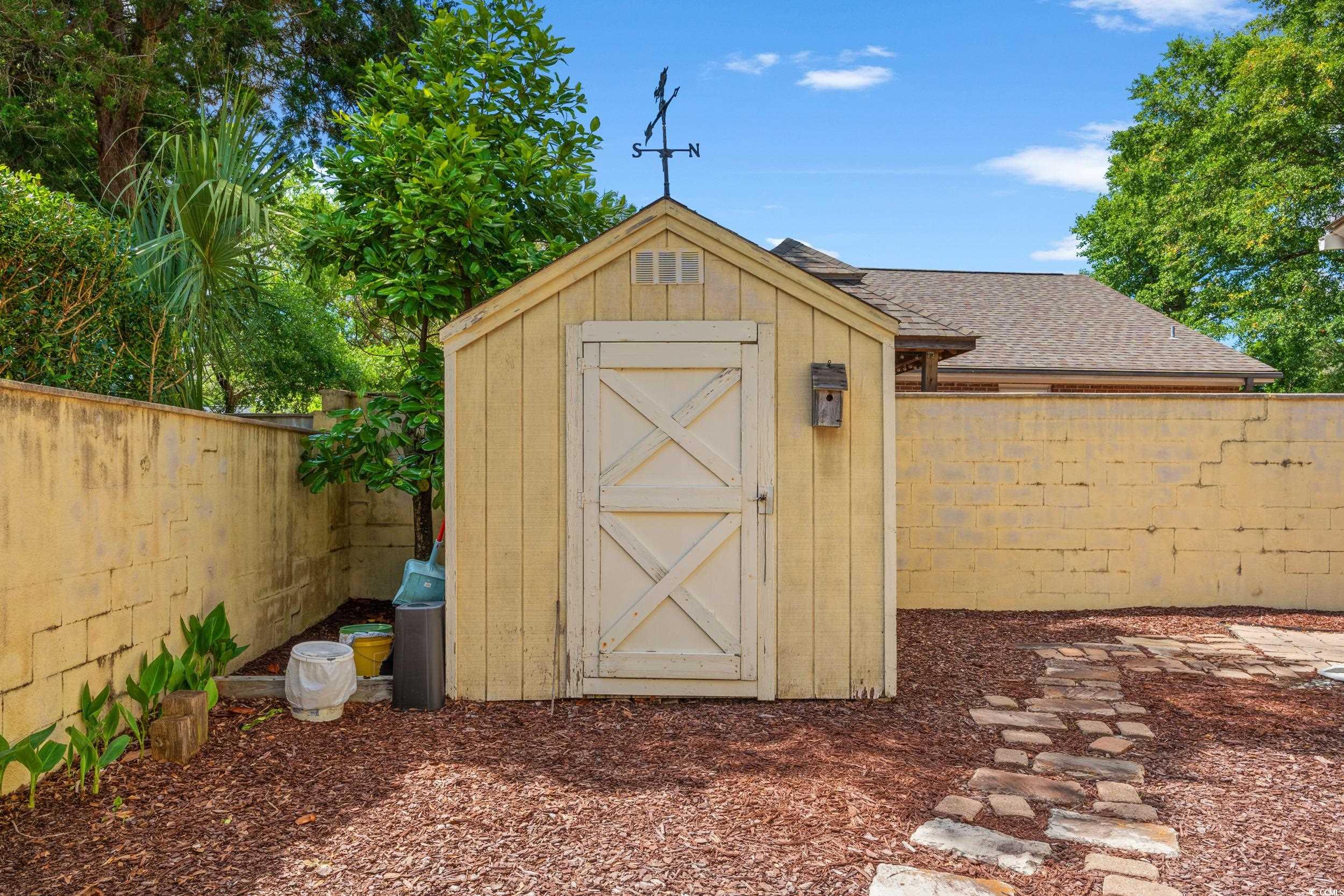 Welcome to the private little community of The Heights at Windy Hill. Actually located on a hill AND close to the beach. This stucco home community is gated and centered around a common green space with a quaint gazebo. The home welcomes you with an entry area that opens into a large eat in kitchen which features beautiful cabinets, granite countertops, task lighting and stainless steel appliances. , a formal dining area with big windows and open living room with access to a guest bathroom. The main floor primary suite includes a full bathroom with double sinks and ample closet space. A large extra room was added on and the space is just beautiful. This multi functional room boasts beautiful wood panels is heated and cooled separately. The two car garage boasts a brand new garage door and space beyond parking for the laundry area and extra storage as well. Upstairs there are not only two more bedrooms but also a very large walk in closet for storage of all kinds at the top of the stairs. A full bathroom is centrally located to both bedrooms and there is ample closet space in both rooms. Take a walk outside to enjoy the shady yard with plants and trees all around. This home, which is located east of highway 17, is just 2 blocks from the beach. Just a short cart ride, bike, or walk. The past upgrades make this home one you will not want to miss. Additionally, there are wood floors on the main level, tile in all wet areas, crown molding, 9 foot ceilings, and a solar attic fan. It is close to wonderful things all around North Myrtle Beach such as Duplin Winery, Barefoot Landing, The House of Blues, the Intracoastal Waterway, and the many wonderful restaurants and attractions make this such a desirable location!